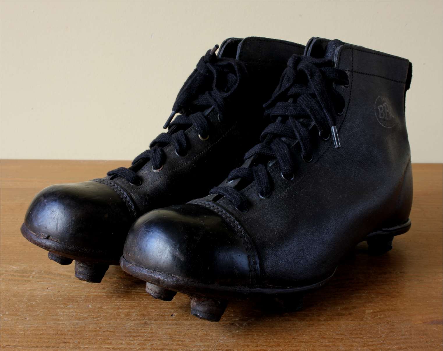 This rare pair of THE B B C branded football boots which are made of black leather have leather soles, nailed on studs, black cord laces and date from c1940.