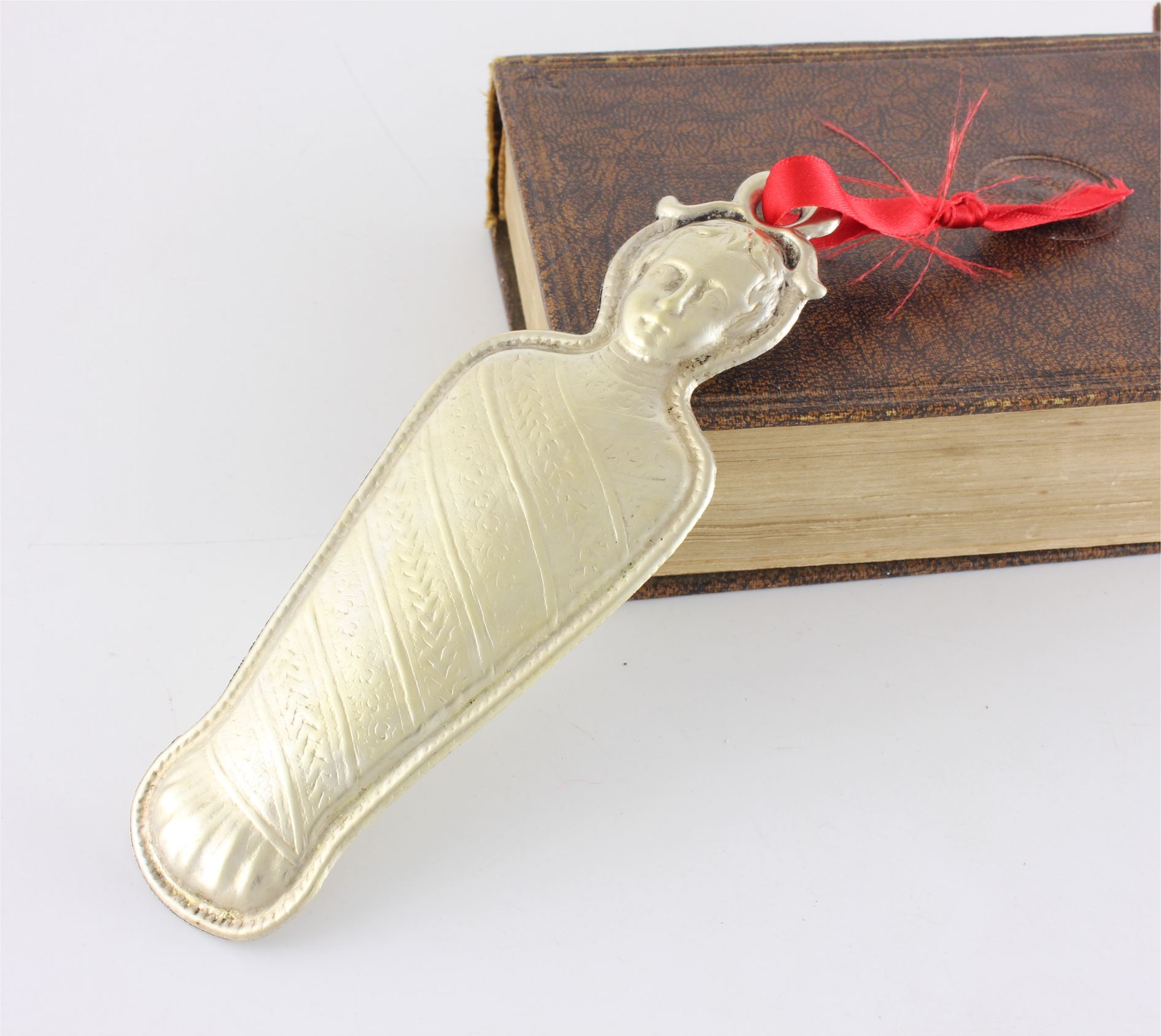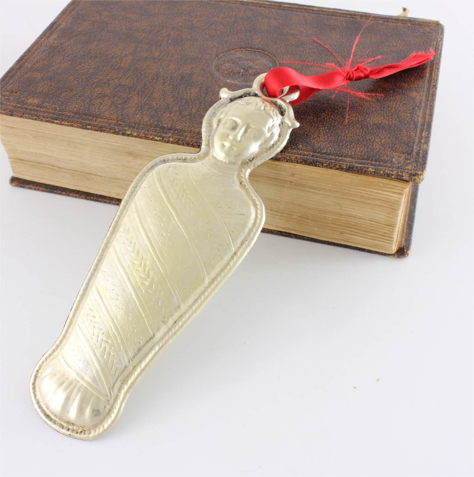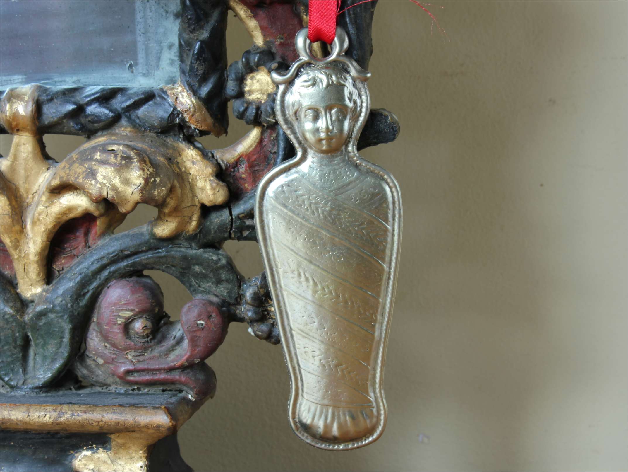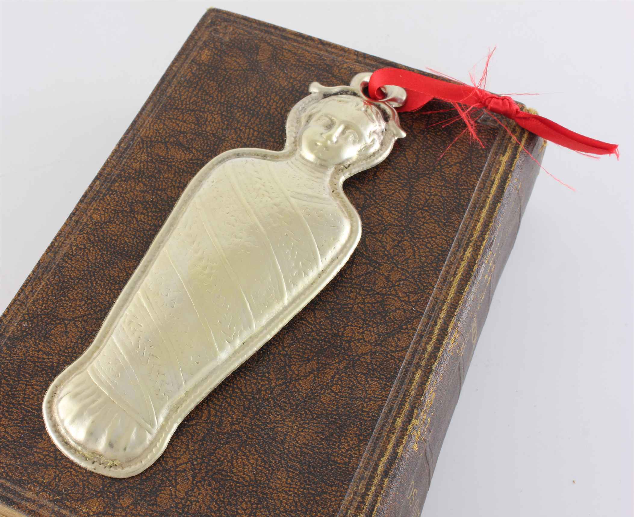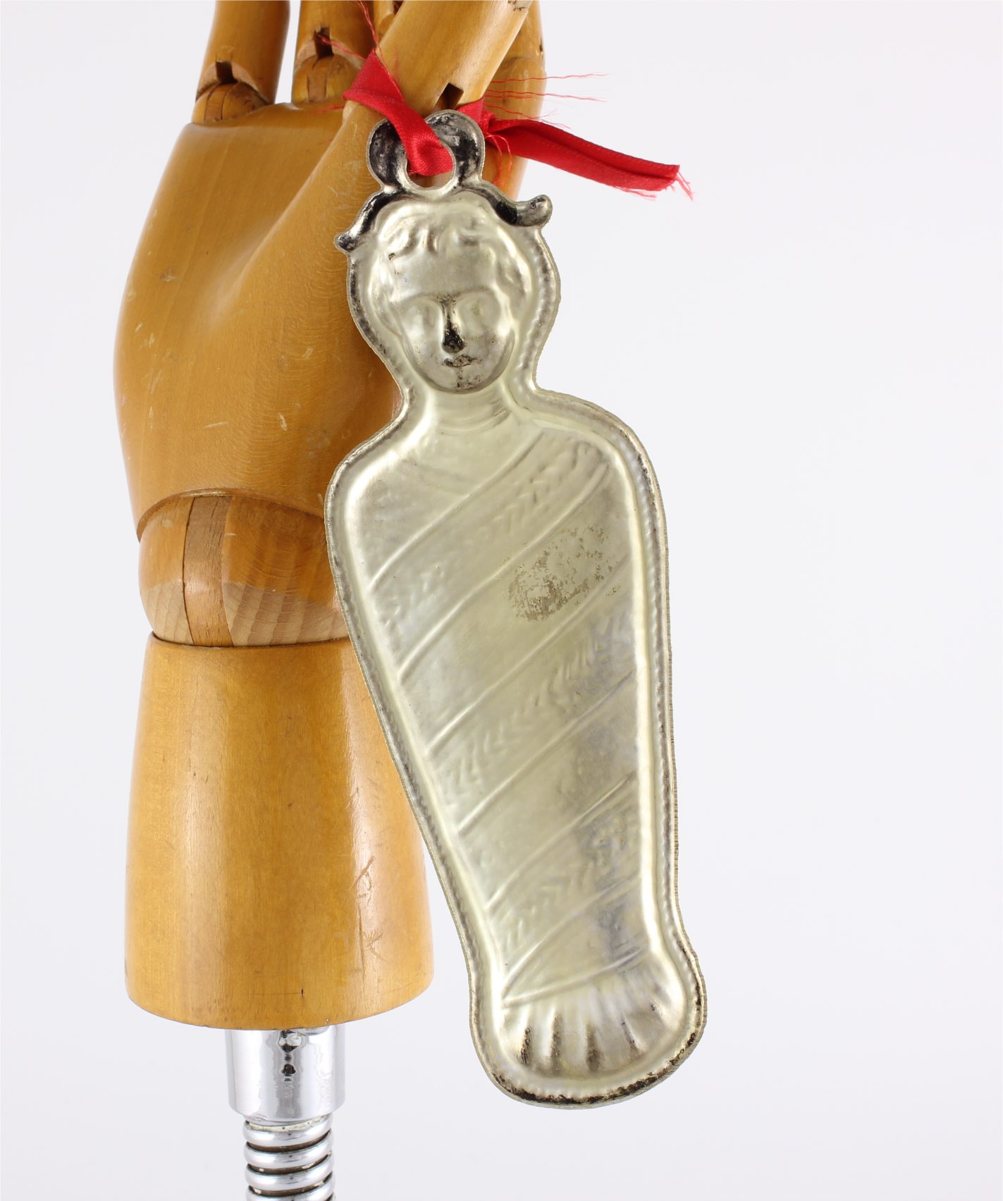 This unusual antique / vintage ex voto which originates from Italy is made of silver plate / white metal and is in the shape of a baby wrapped in swaddling clothes.