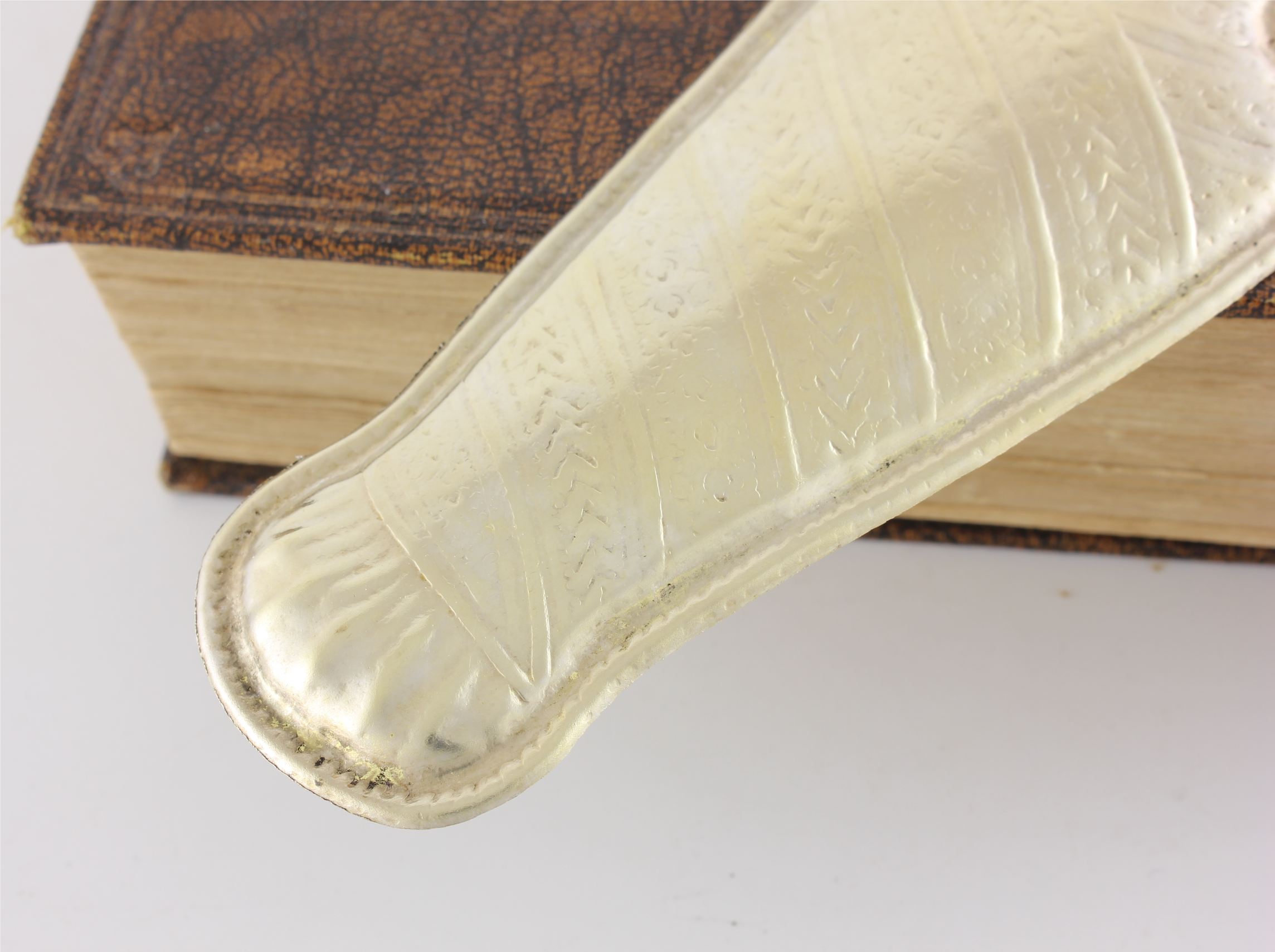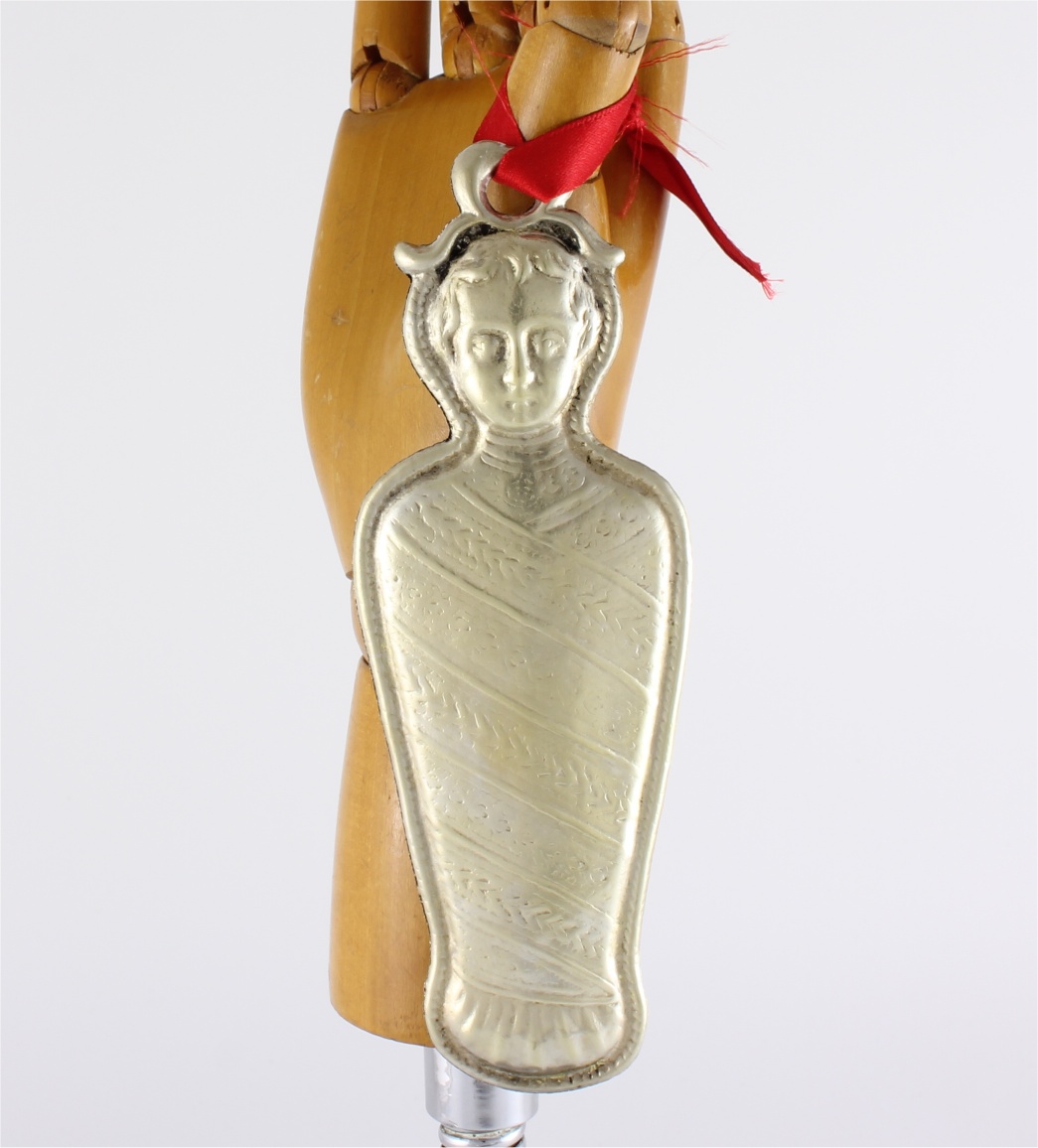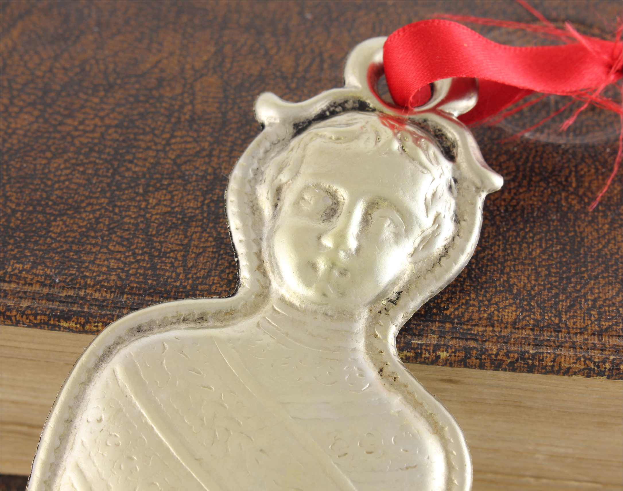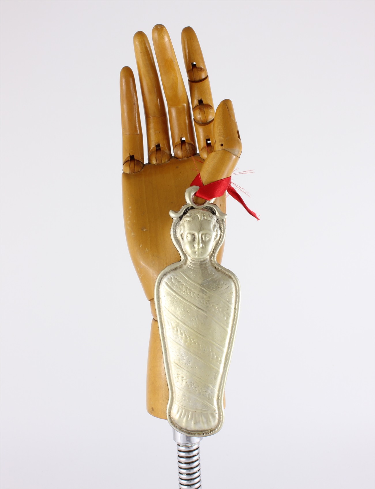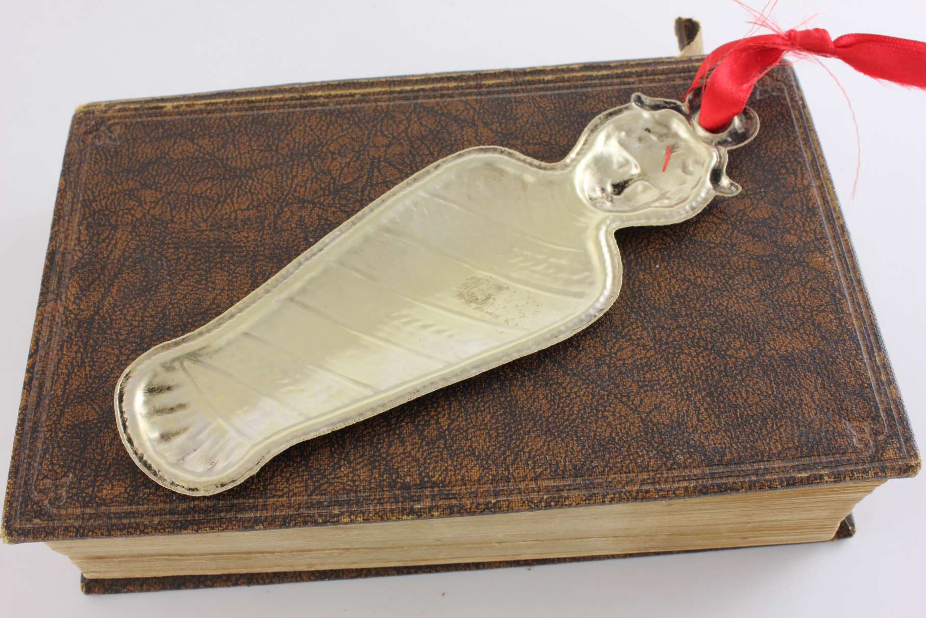 This unusual antique / vintage ex voto which originates from Italy is made of silver plate / white metal and is in the shape of a baby wrapped in swaddling clothes.
