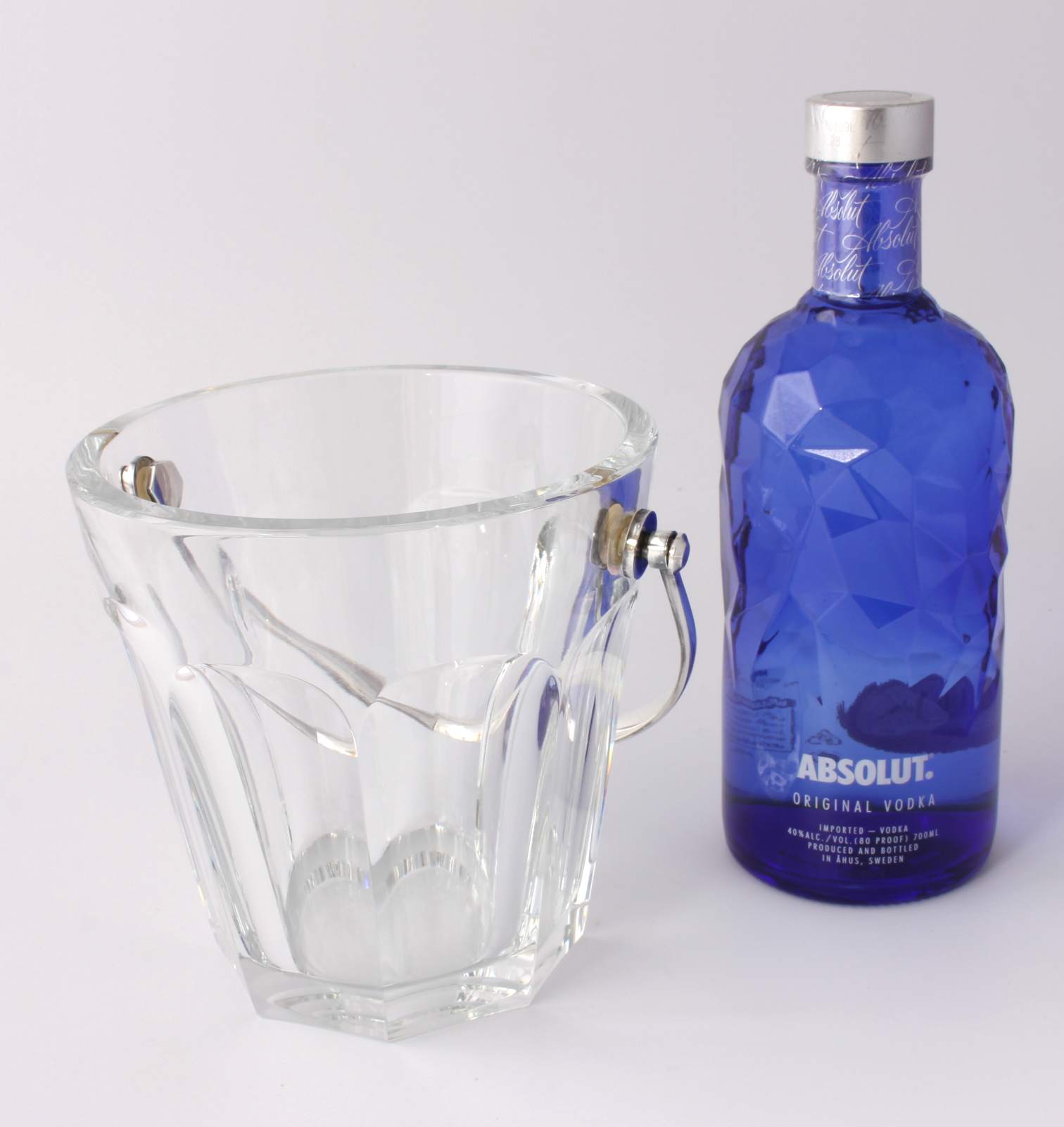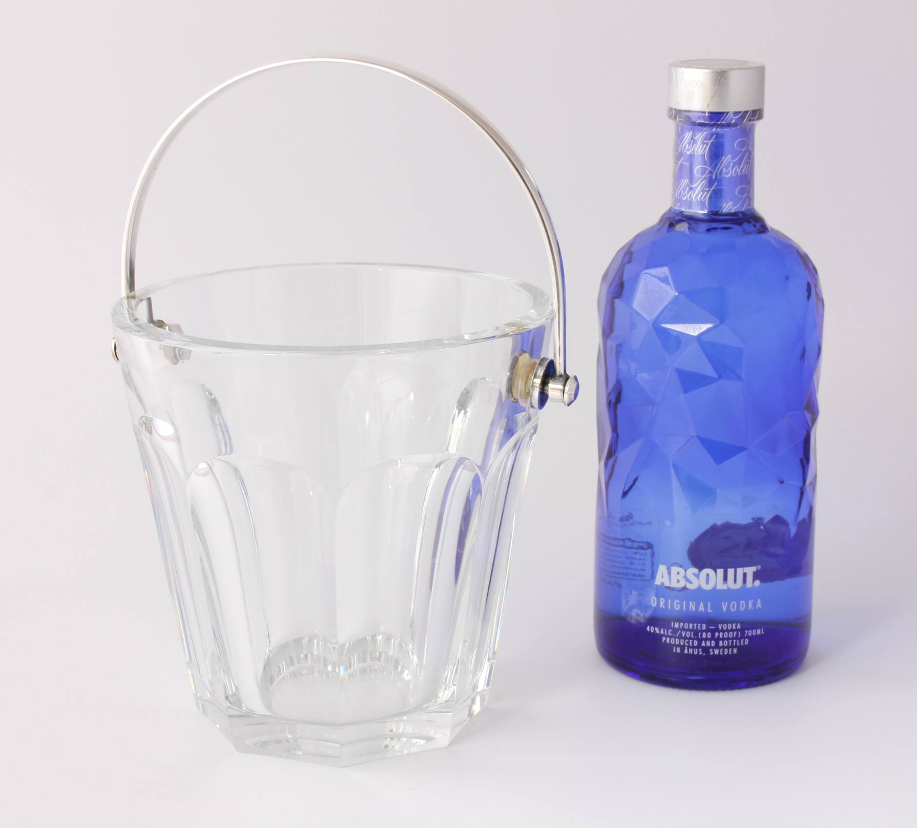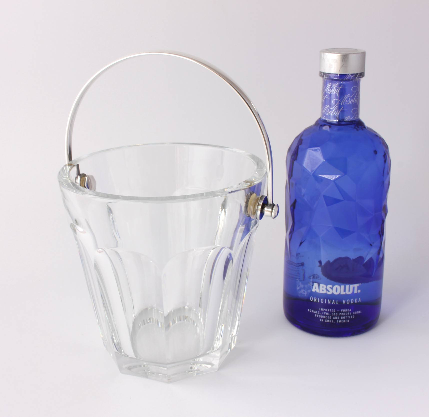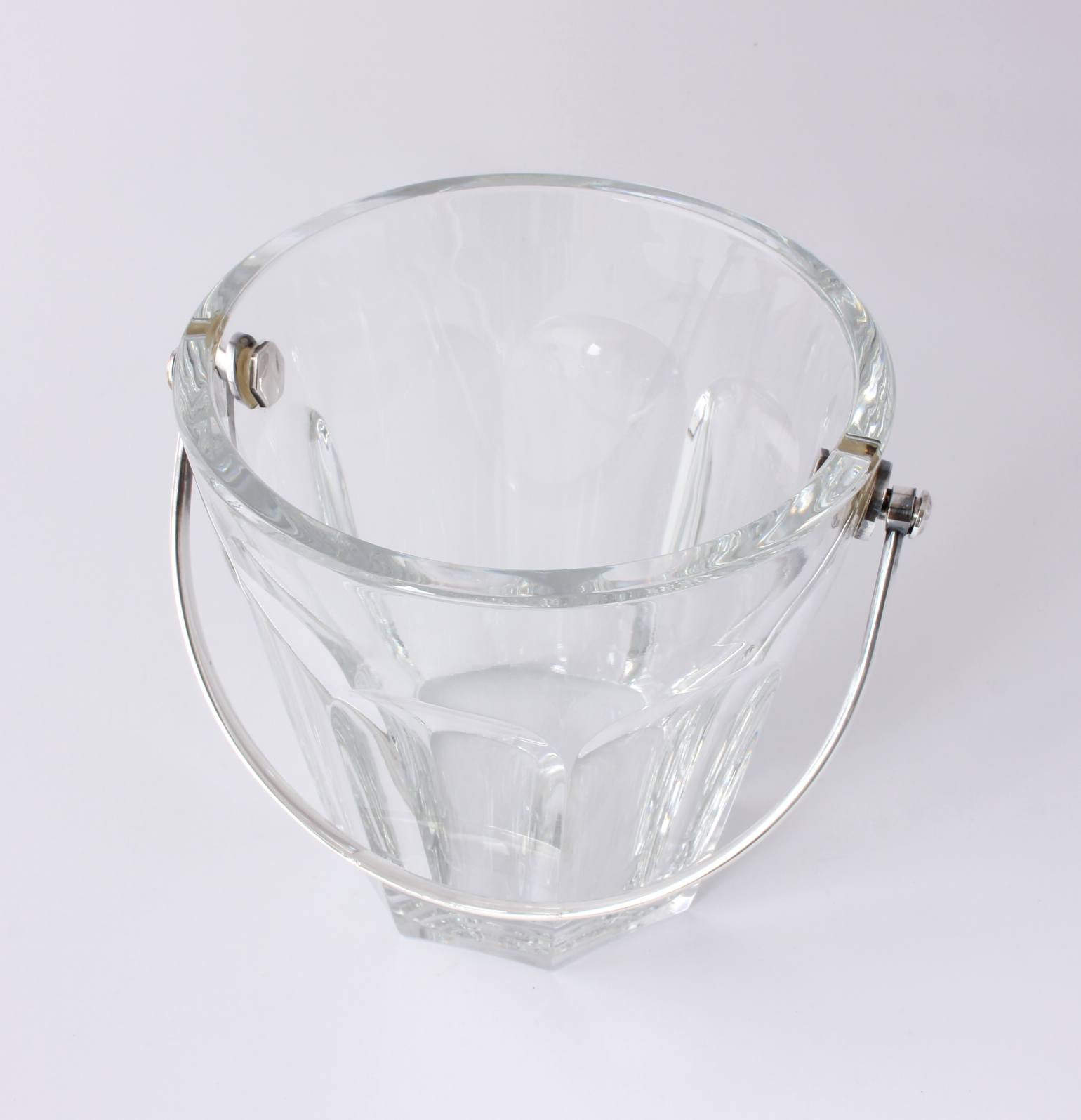 The crystal glass ice bucket which is nice and heavy is the Harcourt design and marked to the base with the Baccarat France logo.