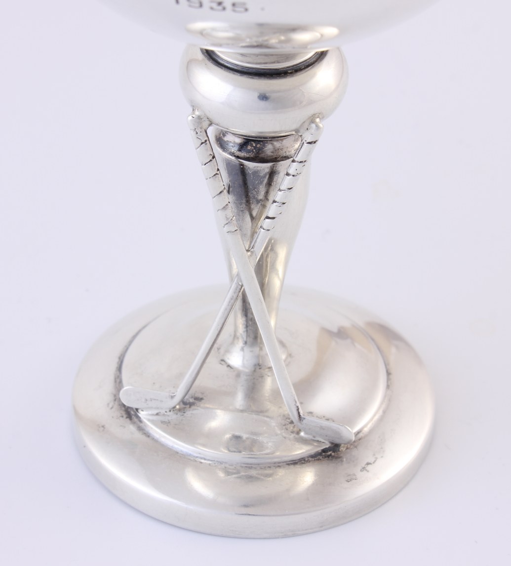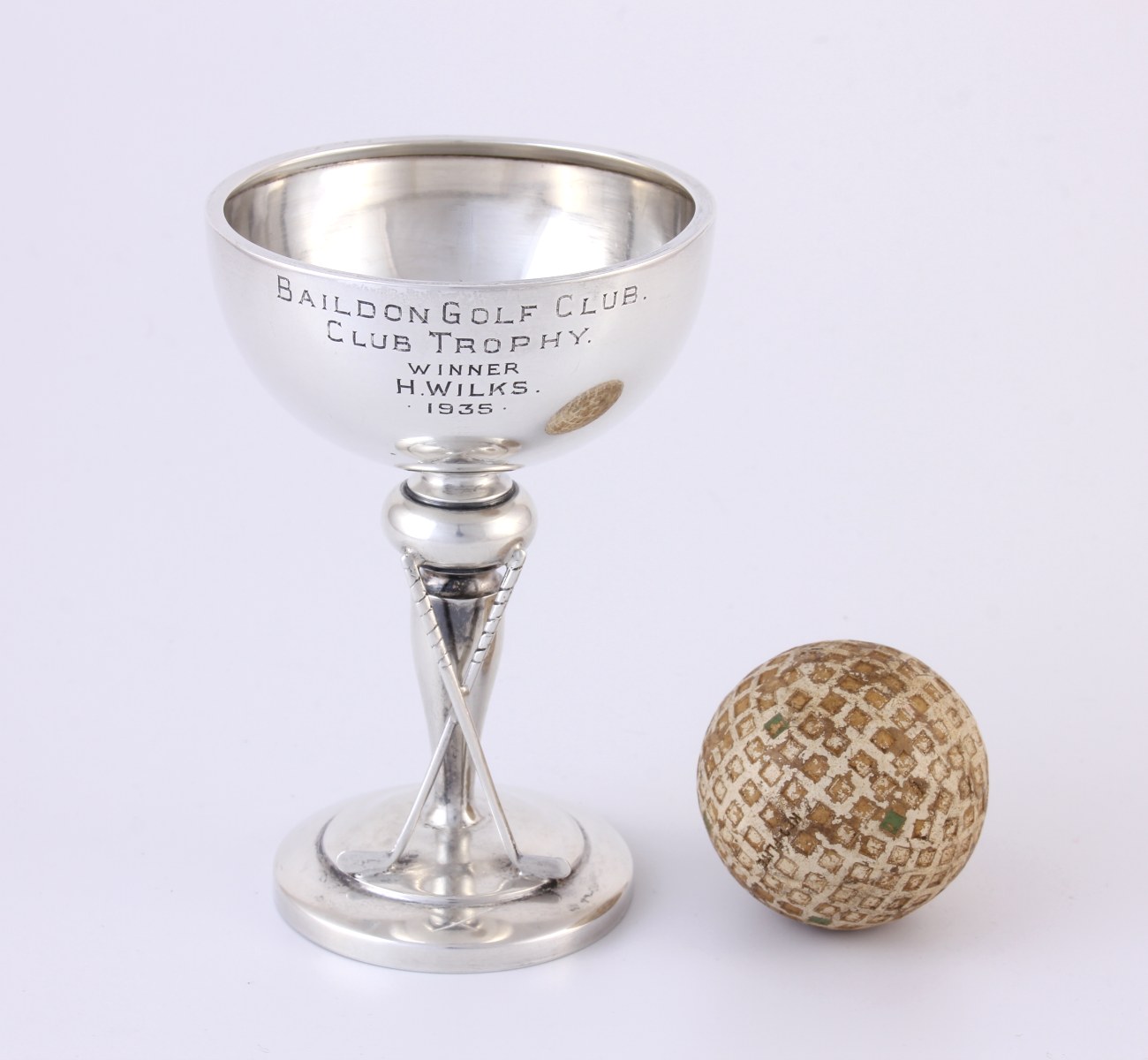 The silver cup which is designed as a bowl with two golf clubs has an interesting inscription that reads Baildon Golf Club. Club Trophy. Winner H. Wilks 1935.