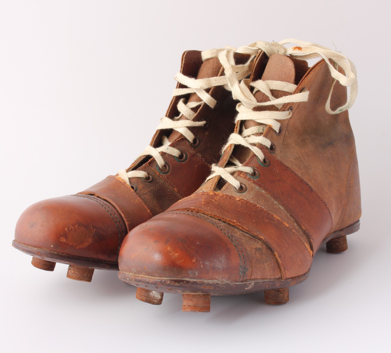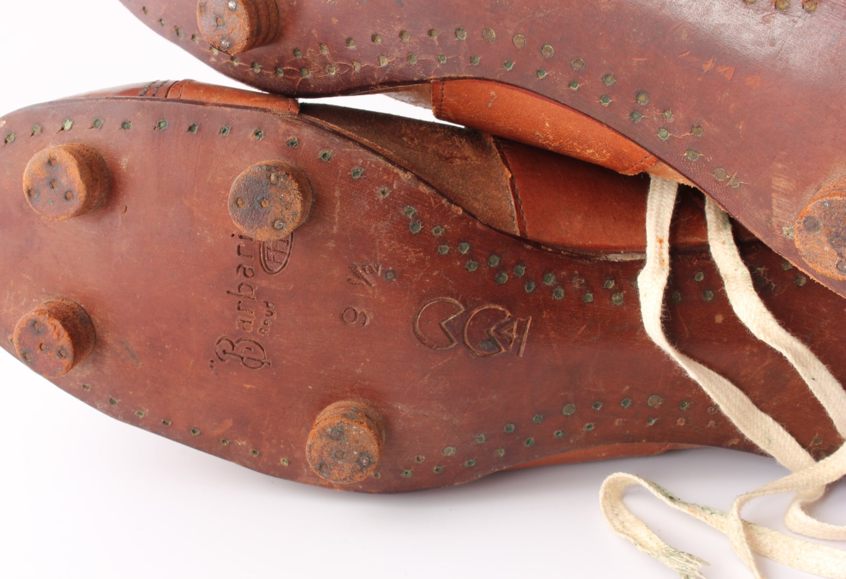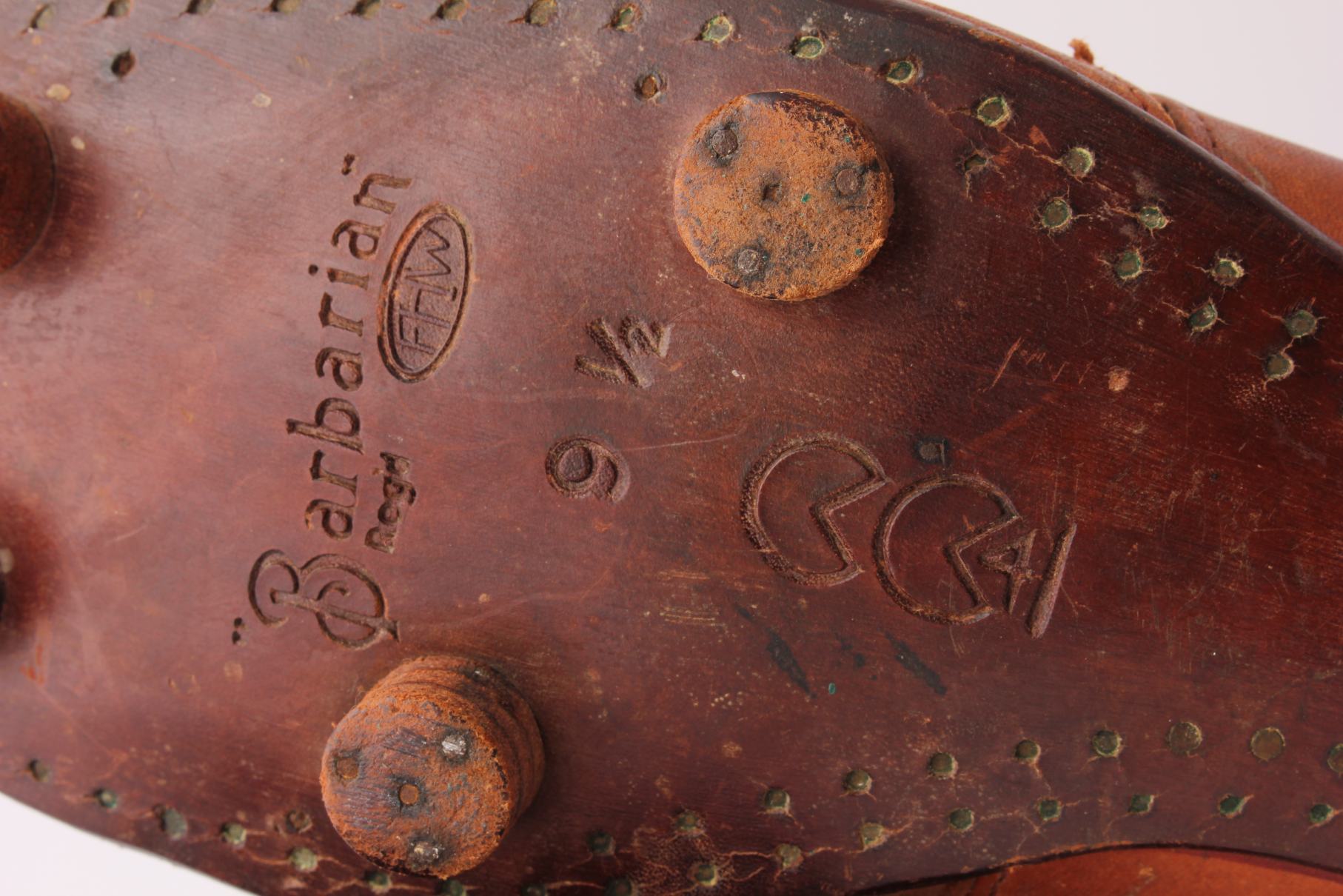 This antique pair of Barbarian football boots by FHW which are made of brown leather with leather soles and nailed on leather studs.