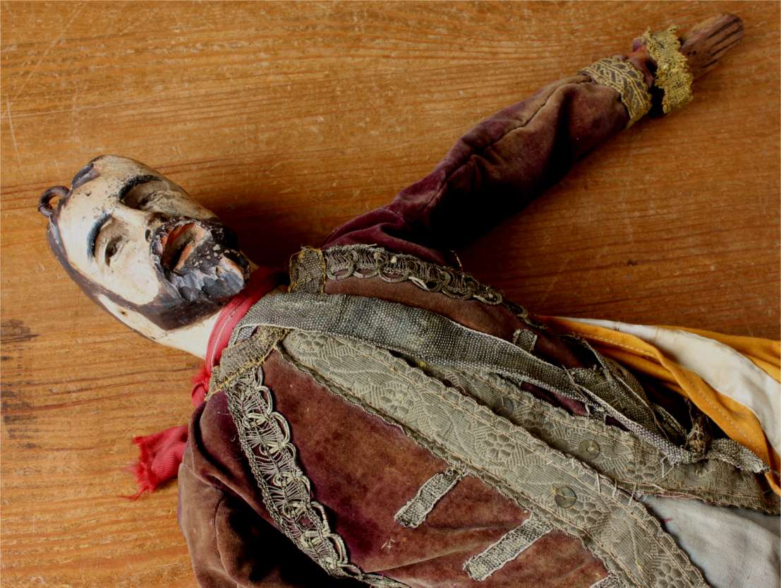 This articulated mannequin puppet figure which is a tall size at 61 cm high has a carved face with painted features such as a beard, original hand stitched clothing which include long trousers, velvet jacket with gold braid, an orange cape and has with a hanging loop to the top of his head.