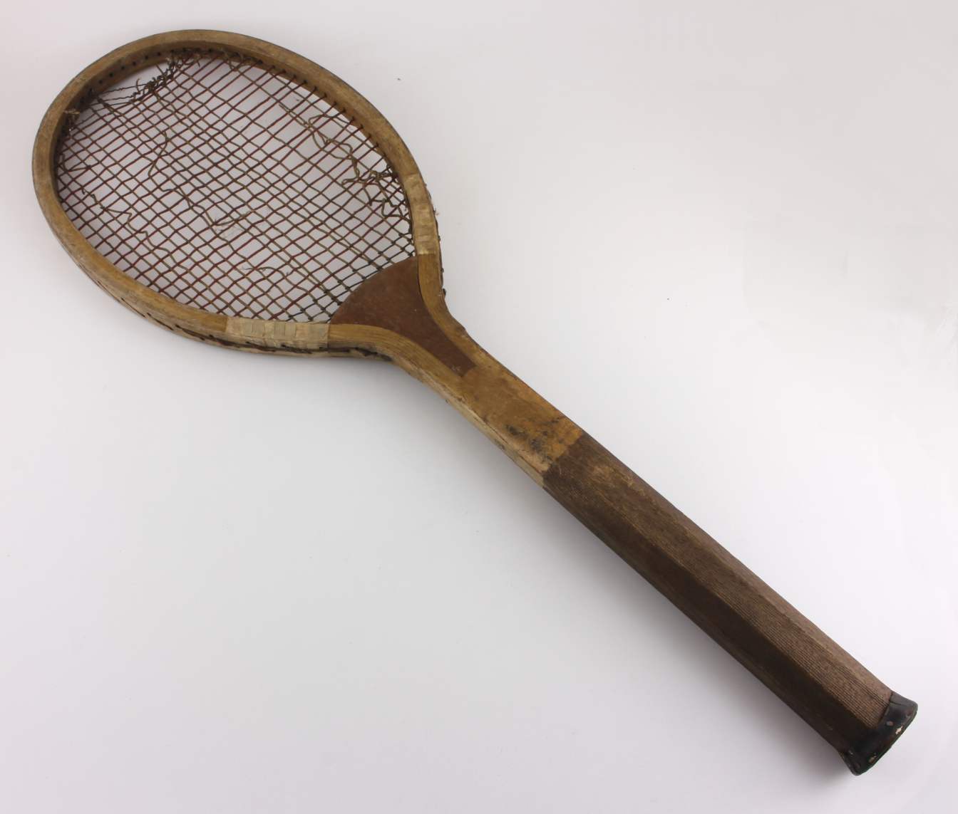 A decorative and collectable tennis racket that has lots of age related wear so looks great on display and would make a super item for a tennis club, shop or prop.