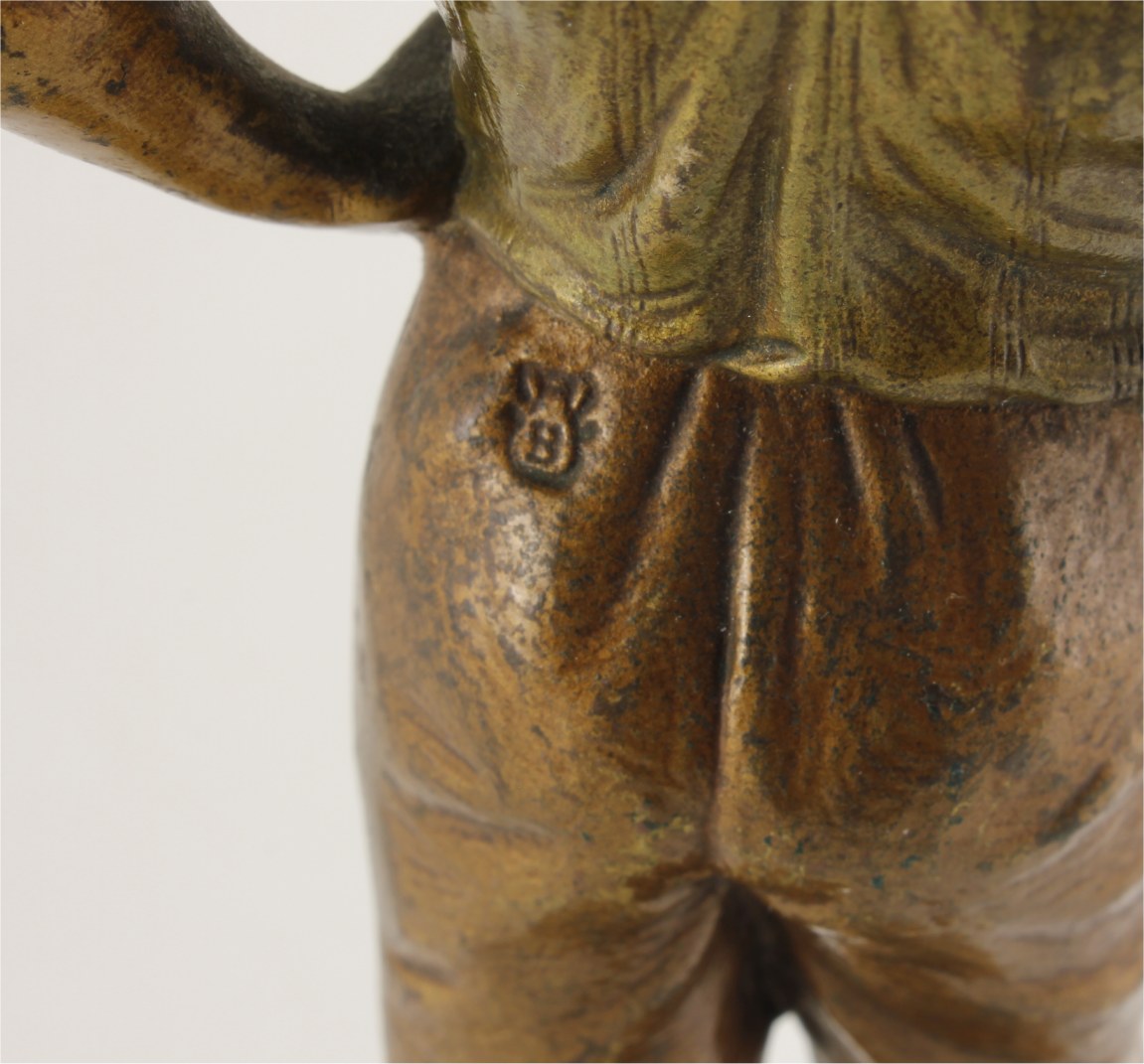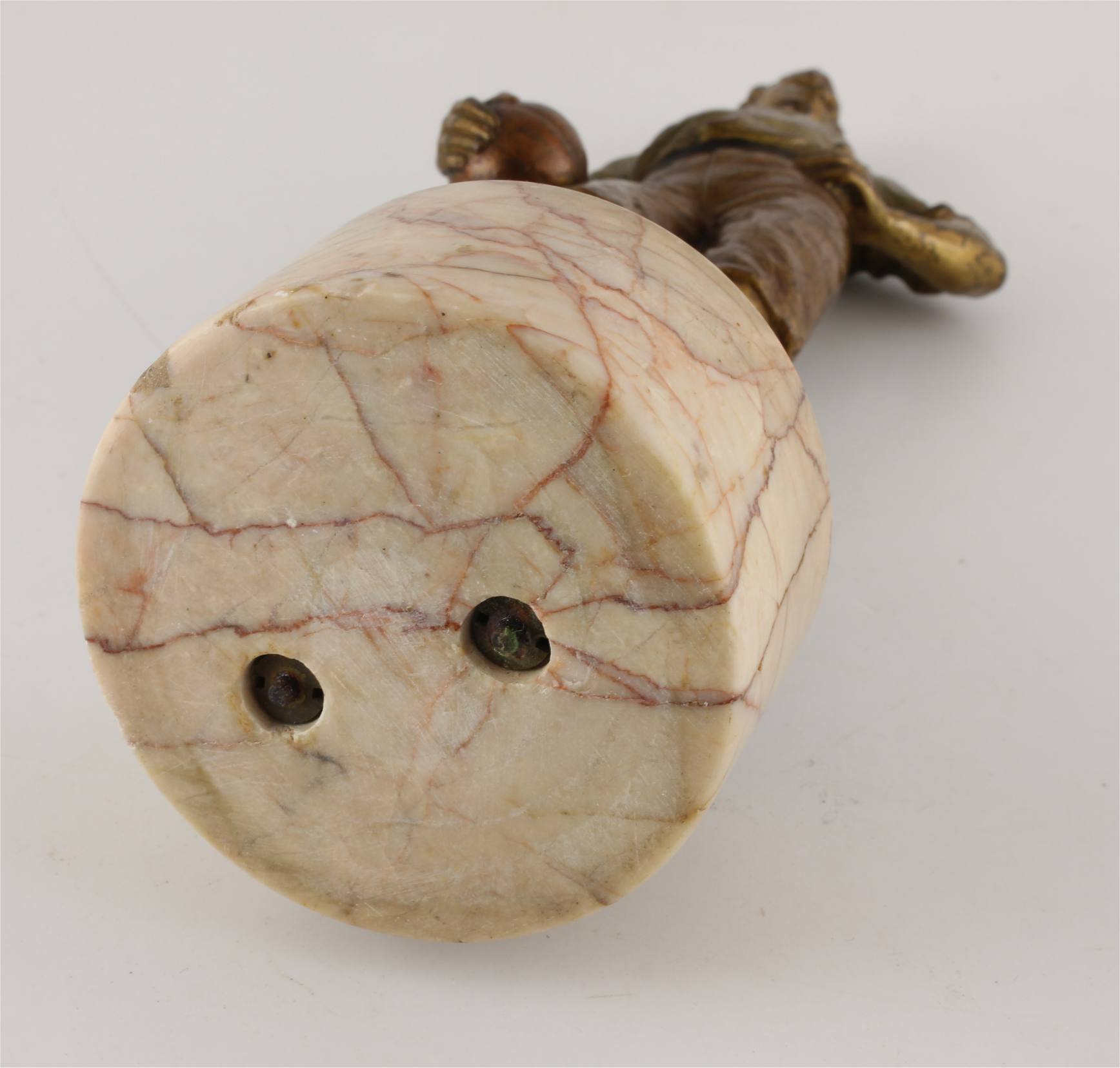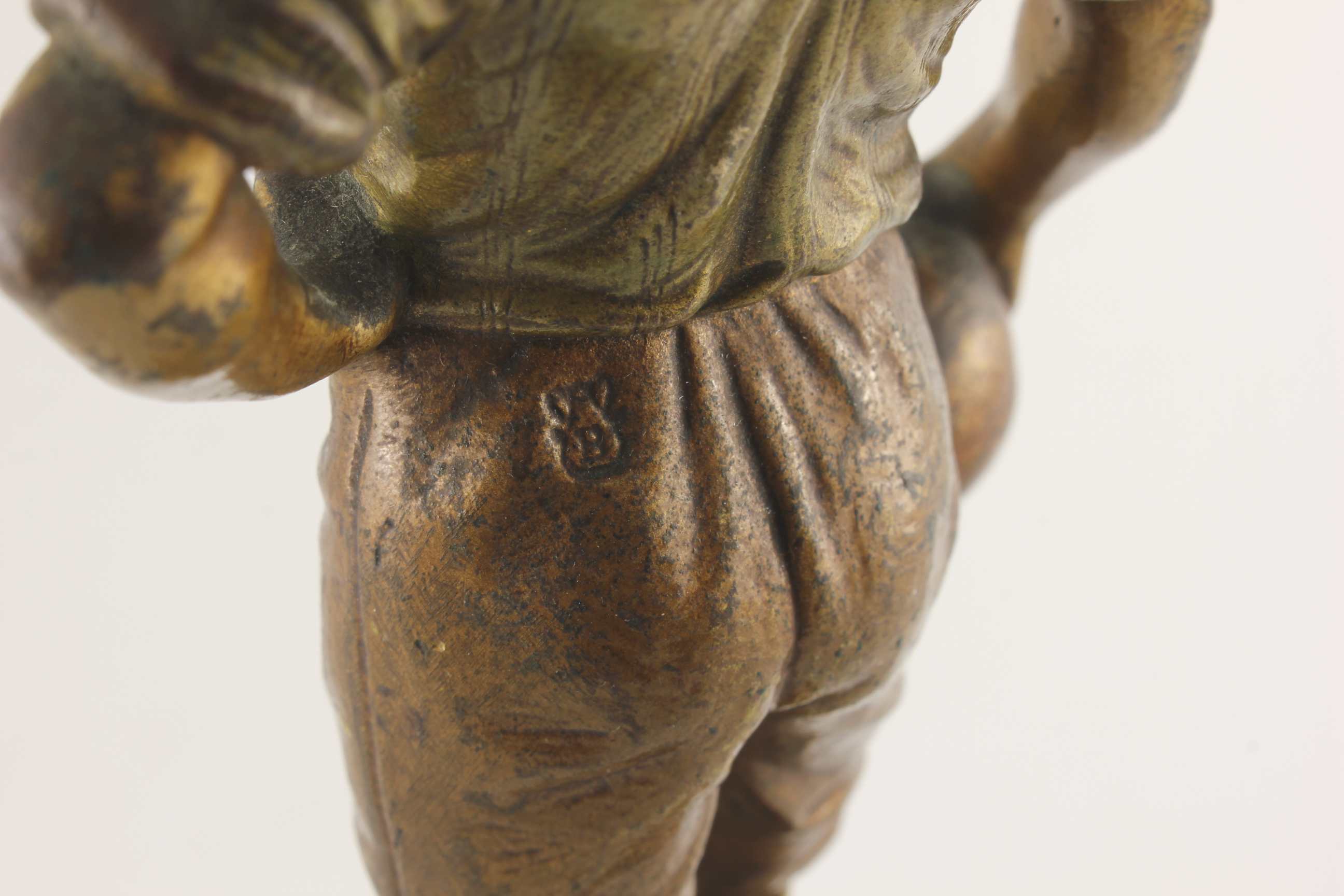 This heavy antique Viennese bronze footballer which stands on it's marble base has fine detail, a polychrome finish and is signed with the Bergman B mark.