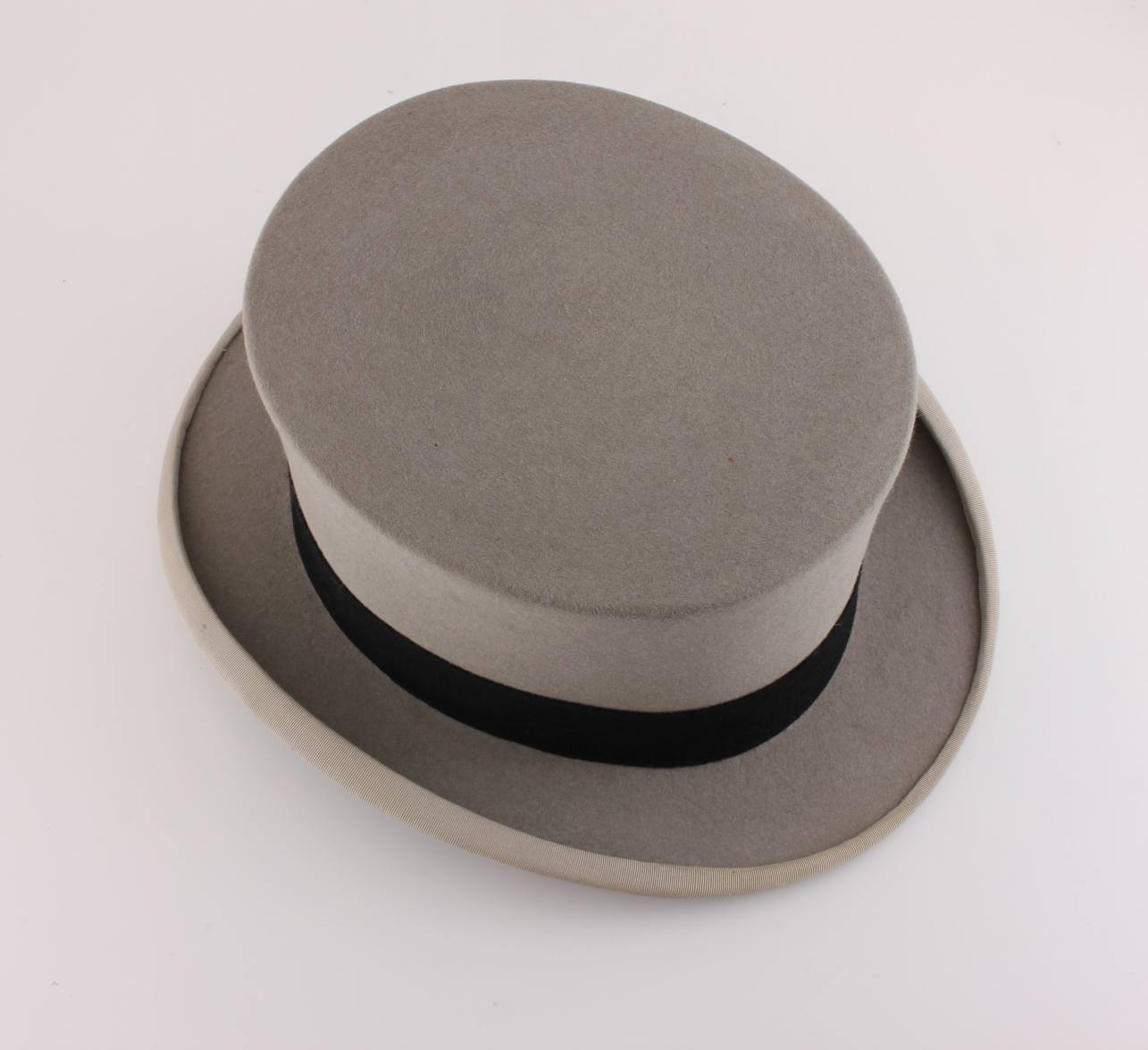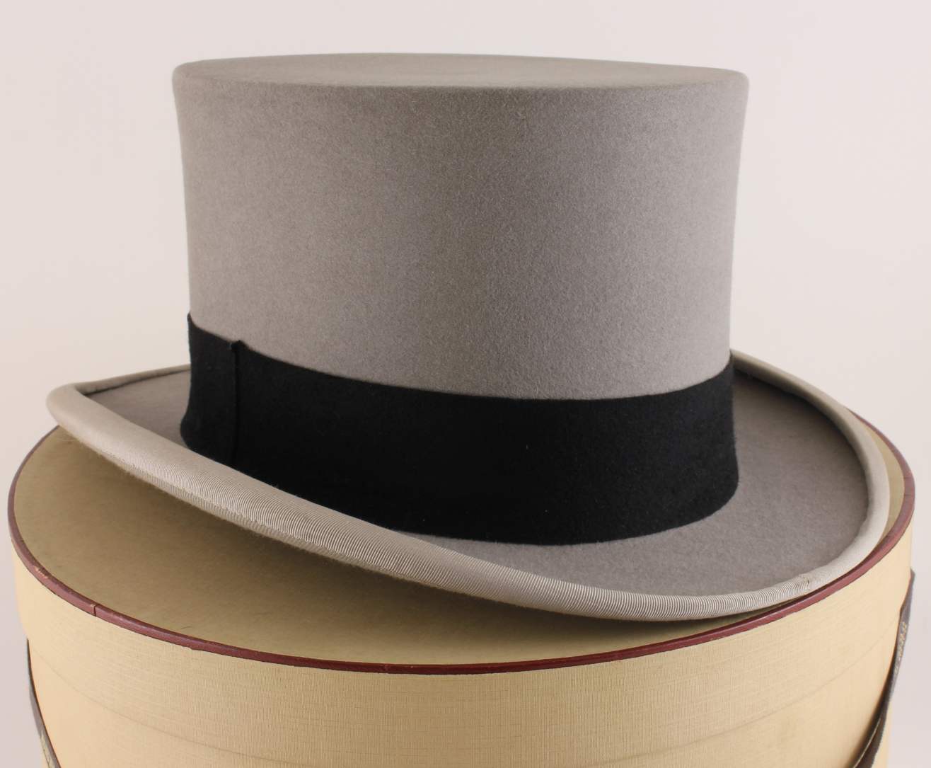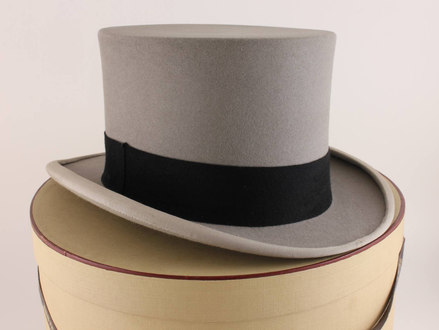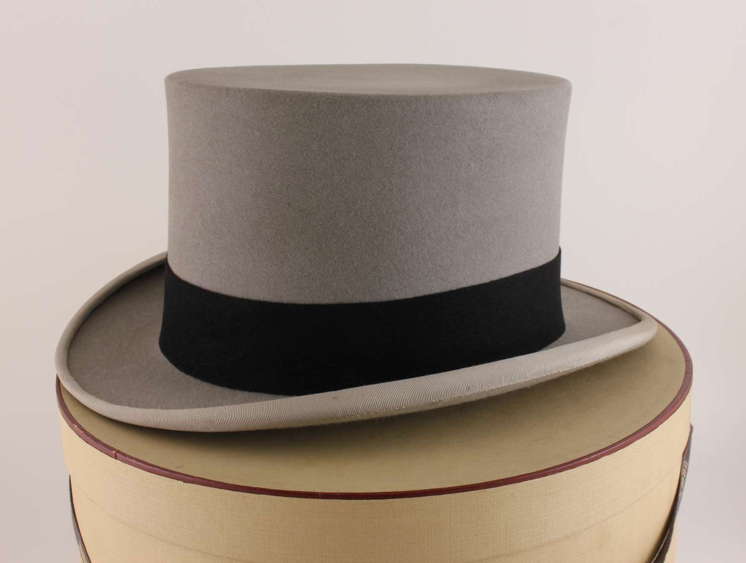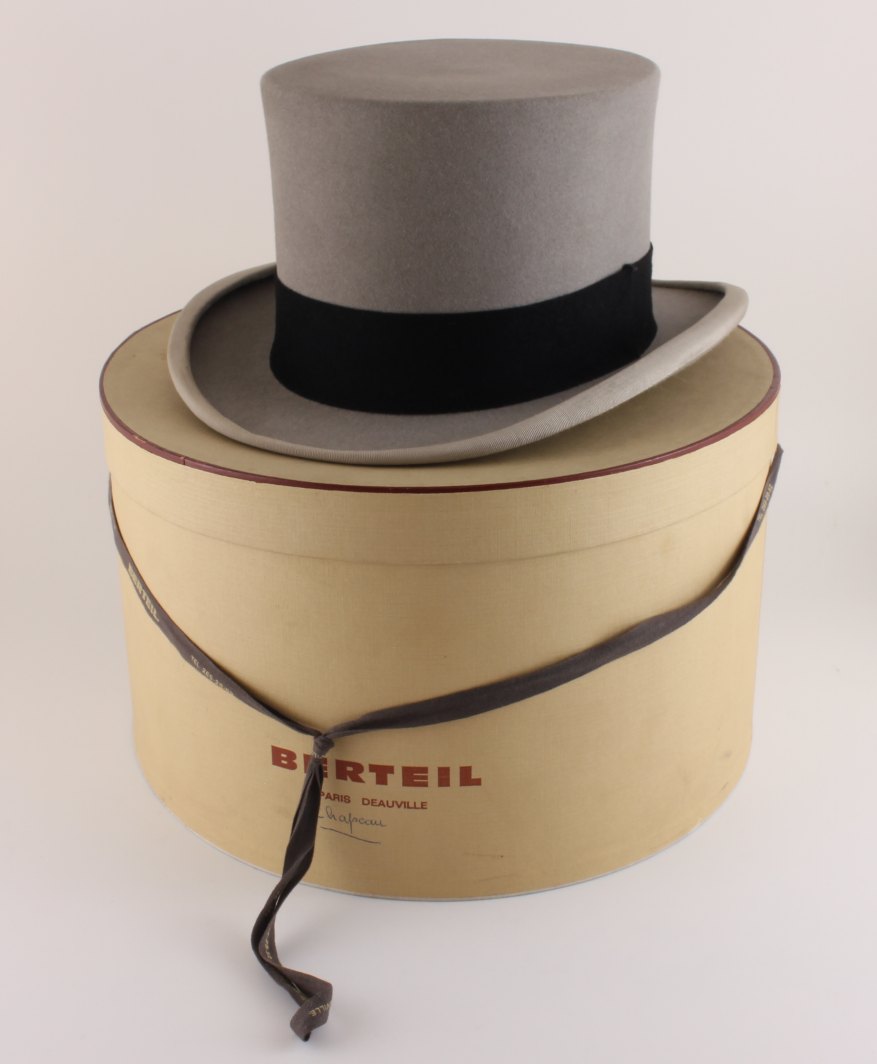 This handsome vintage grey top hat is made by top quality French hat maker Berteil of Paris and is marked to the inside with their logo and also marked with the size of 57. This hat comes in it's Berteil cardboard box to protect it.
