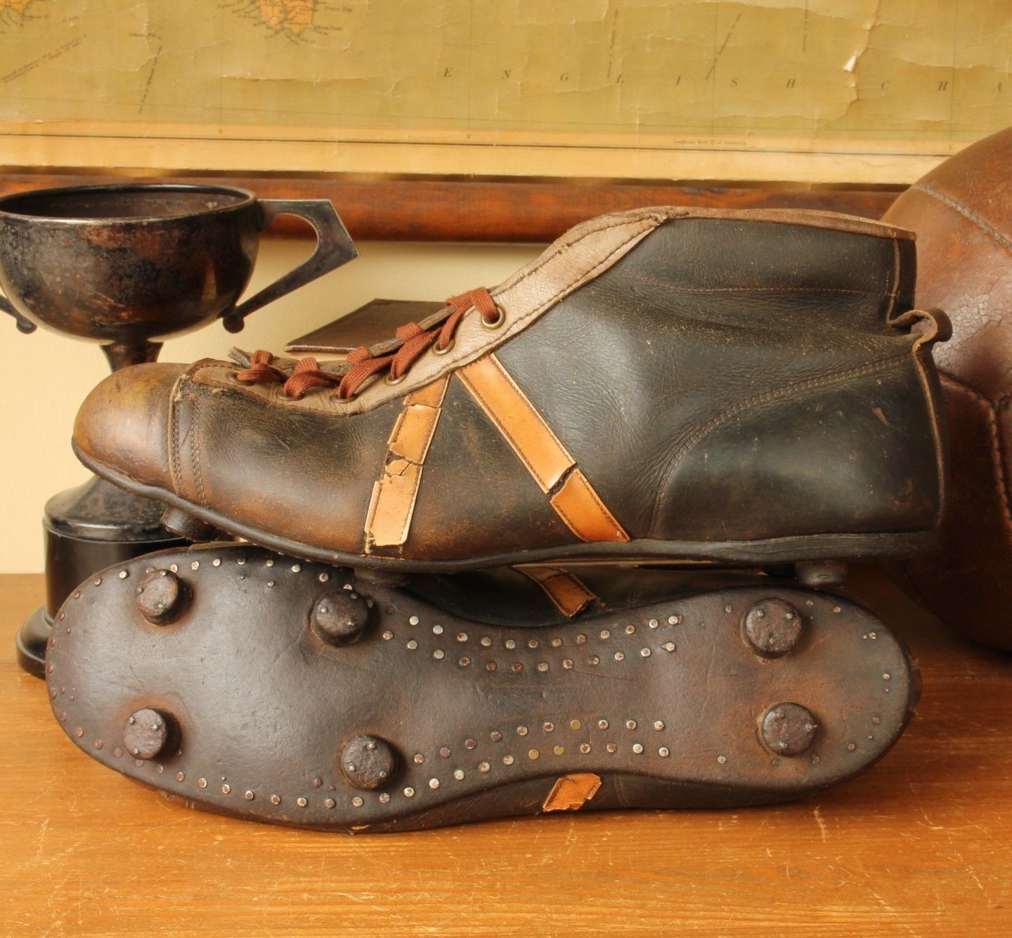 This good looking pair of football boots which date from the 1950's are made of black leather with leather soles and nailed on studs.