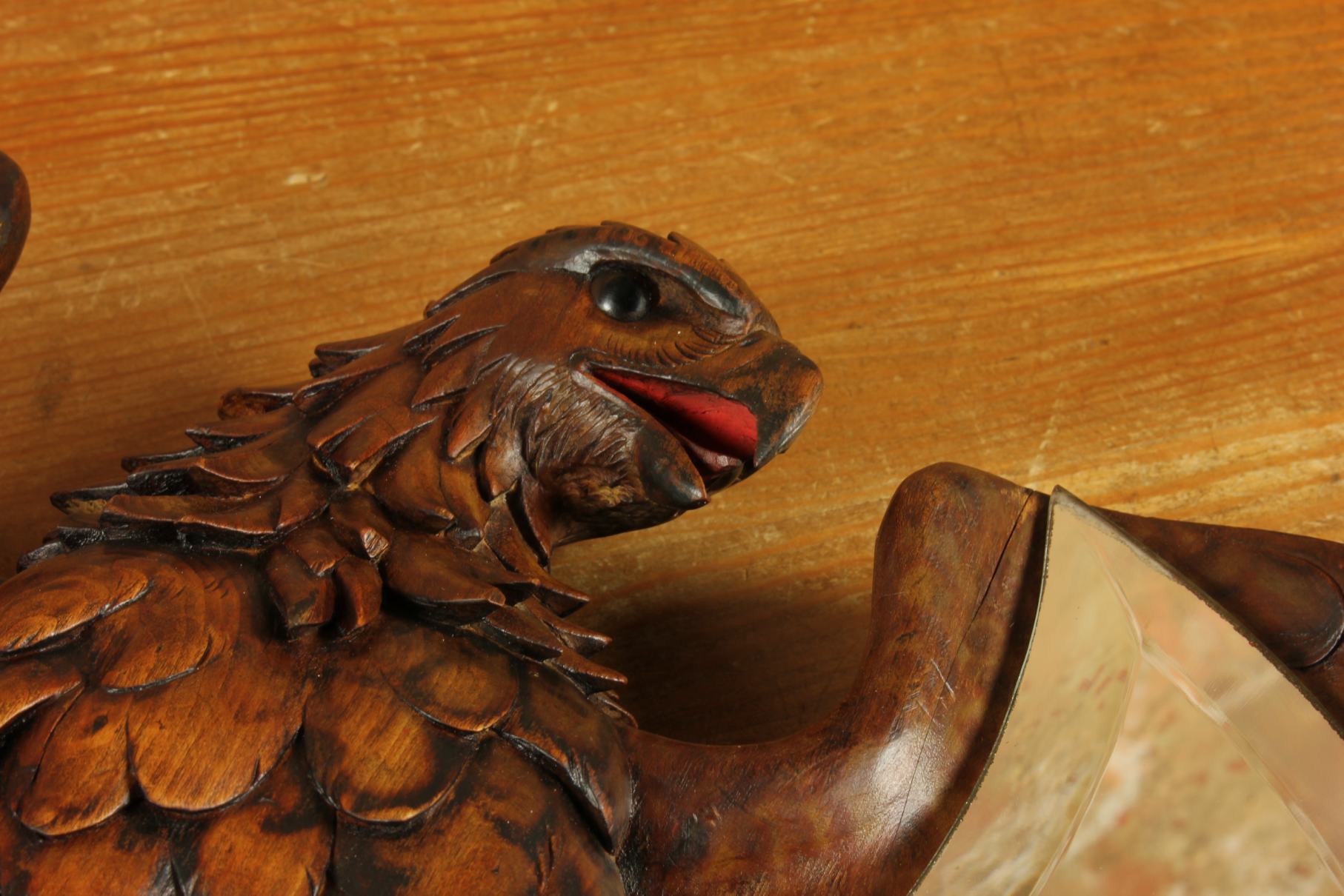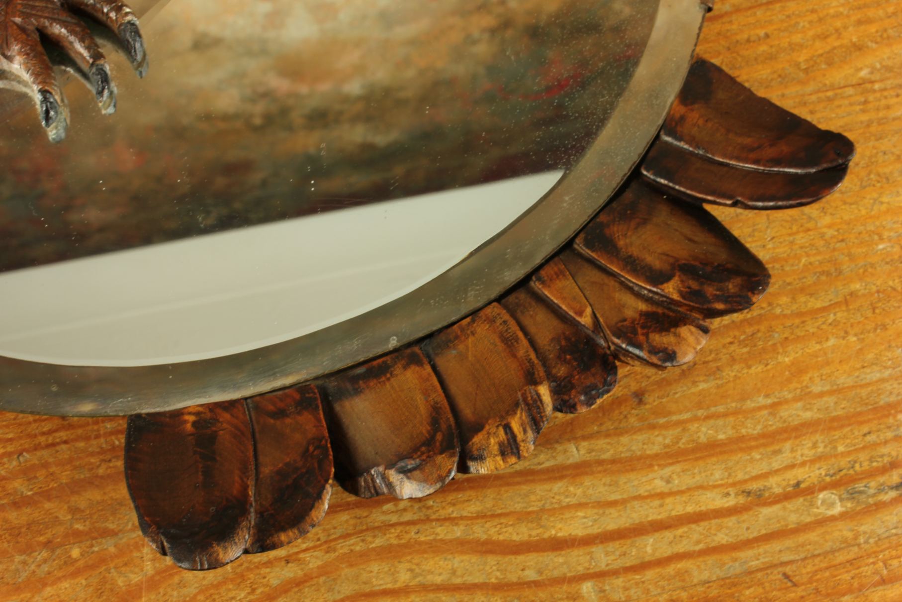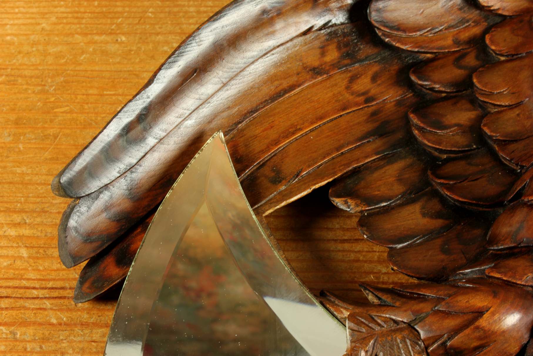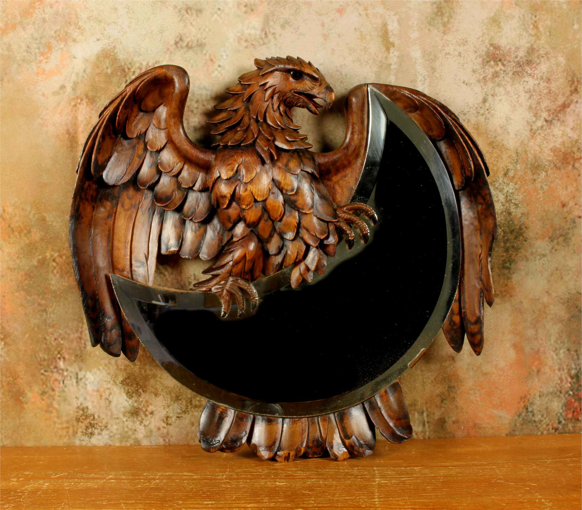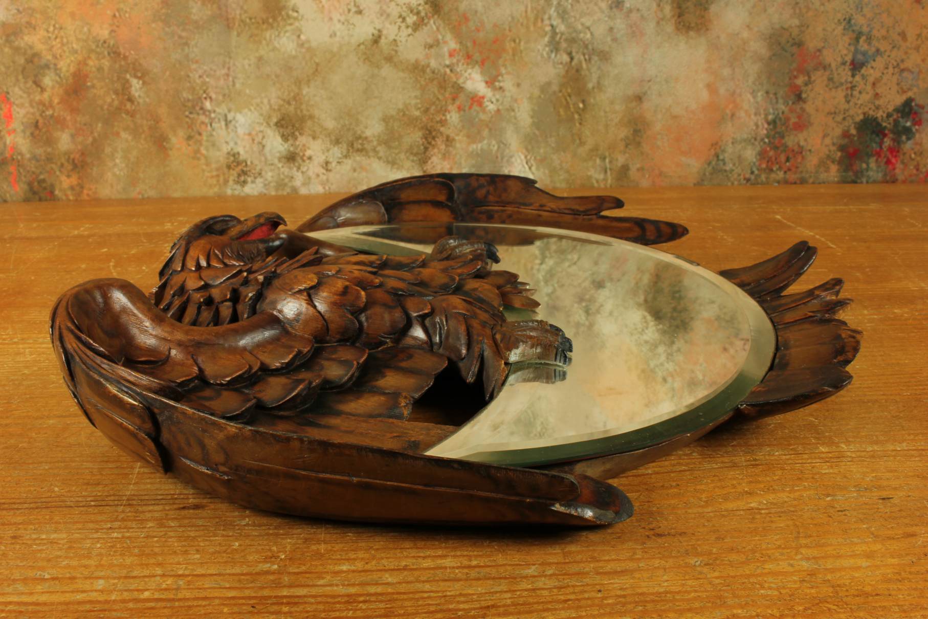 This handsome eagle has fine hand carved detail, two glass eyes and has an open red mouth which shows his upturned tongue. This mirror is fitted with a brass ring to the rear so can be hung on a wall.