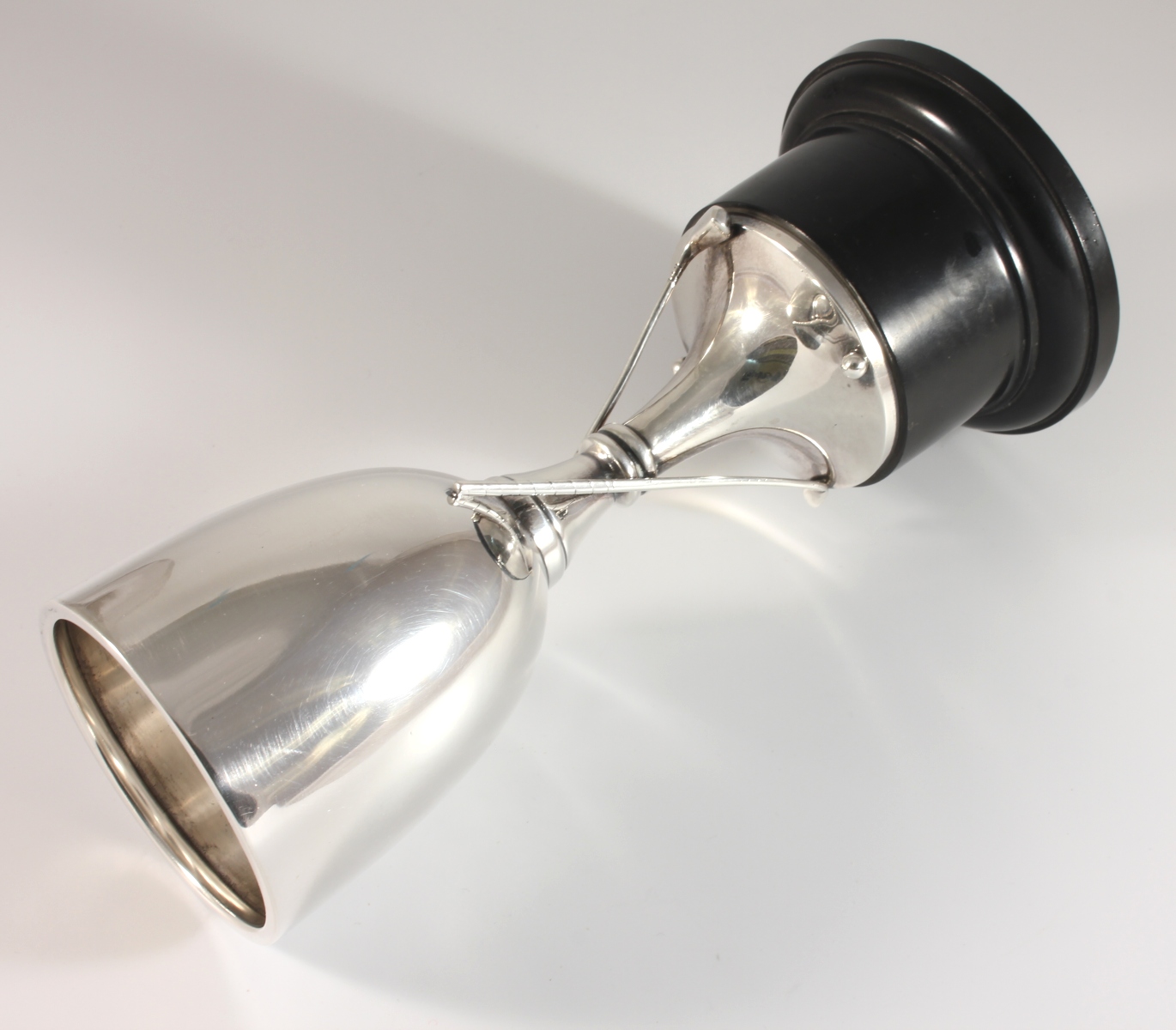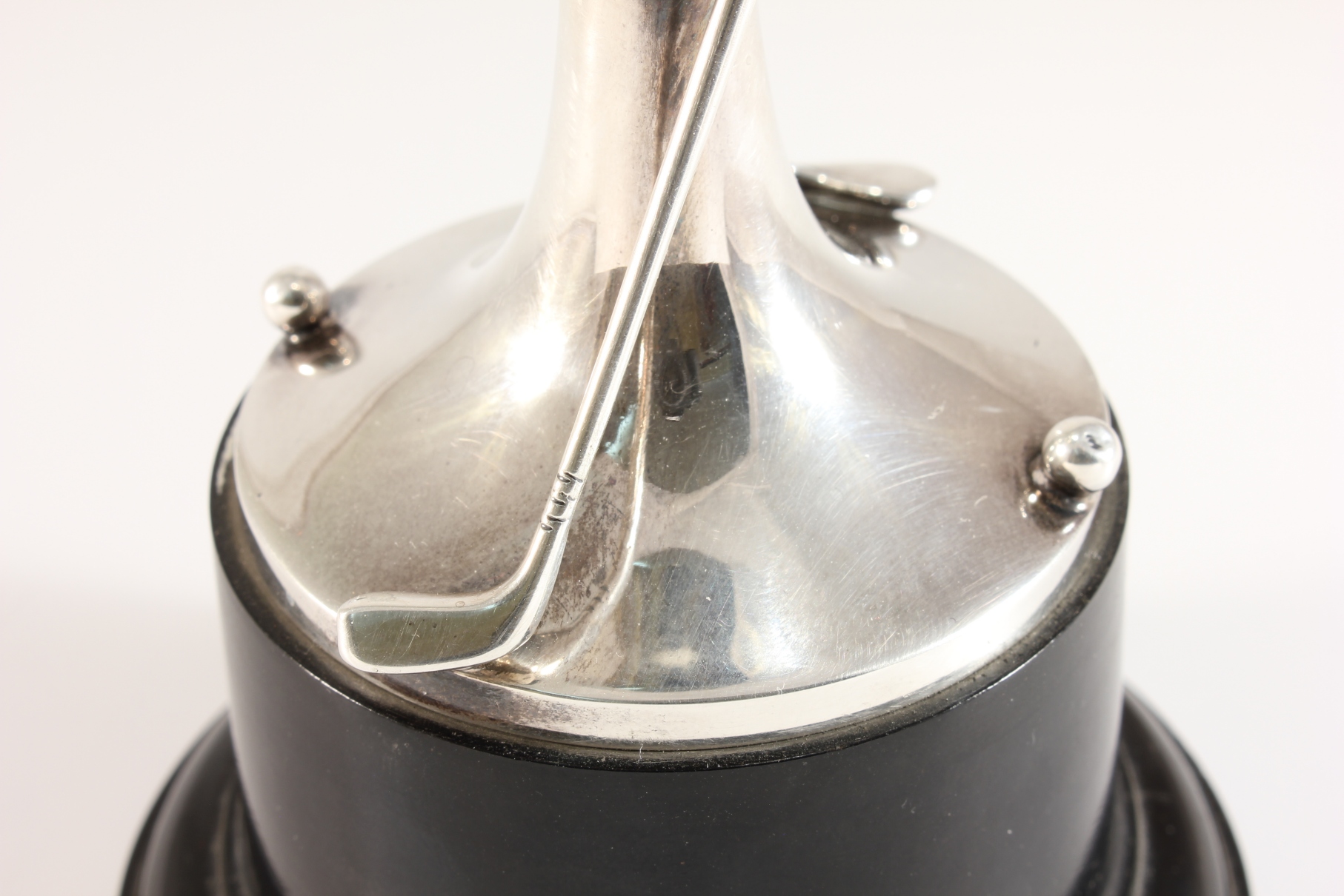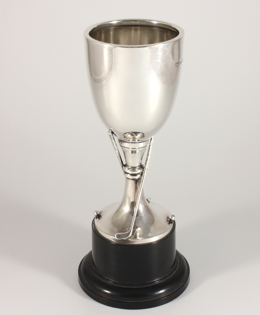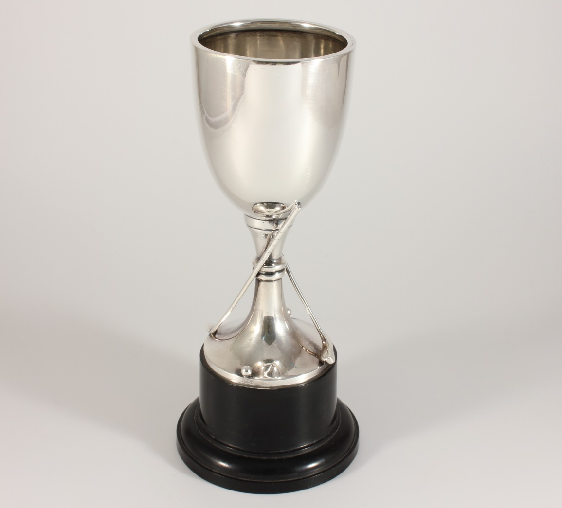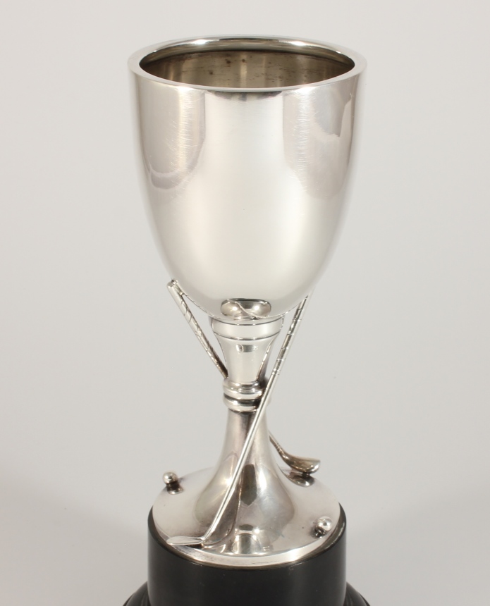 The silver trophy cup which is fully hallmarked for 1937 is designed as a goblet with two golf clubs and balls, sits on it's black base and does not have any inscriptions so is ideal to be used as a presentation trophy and could be engraved with your own award details if you were using it as an award trophy.