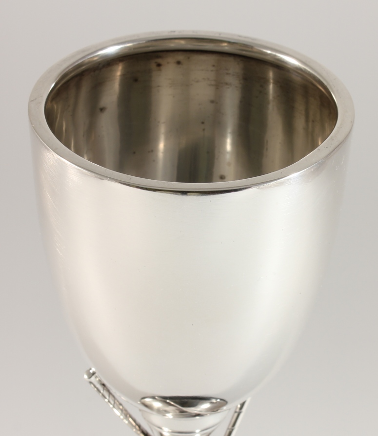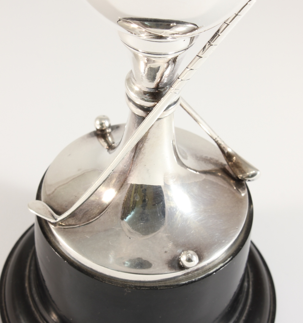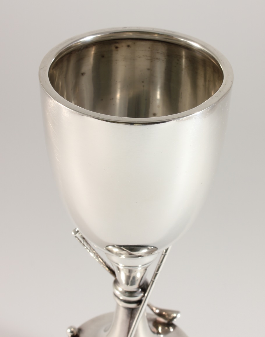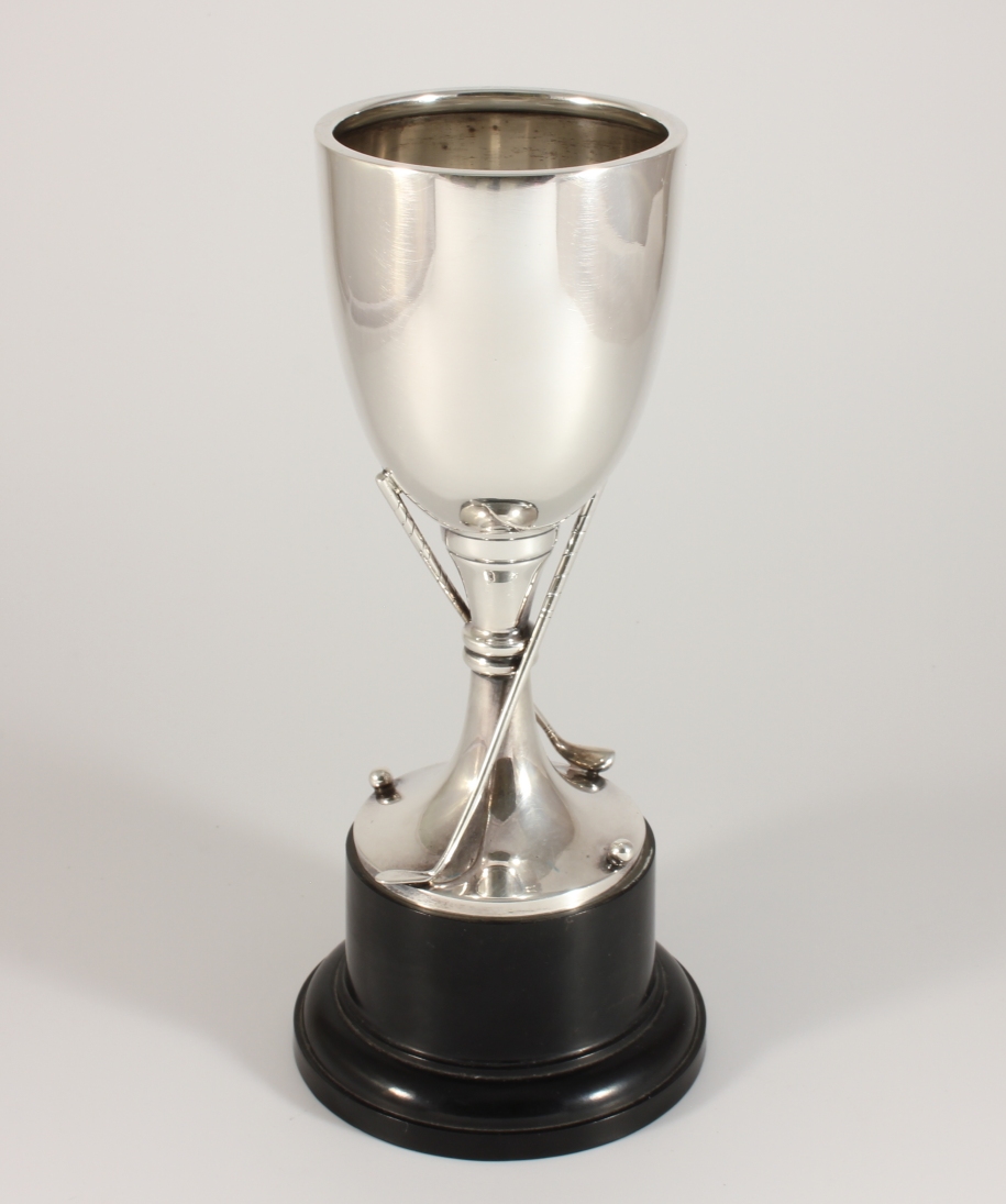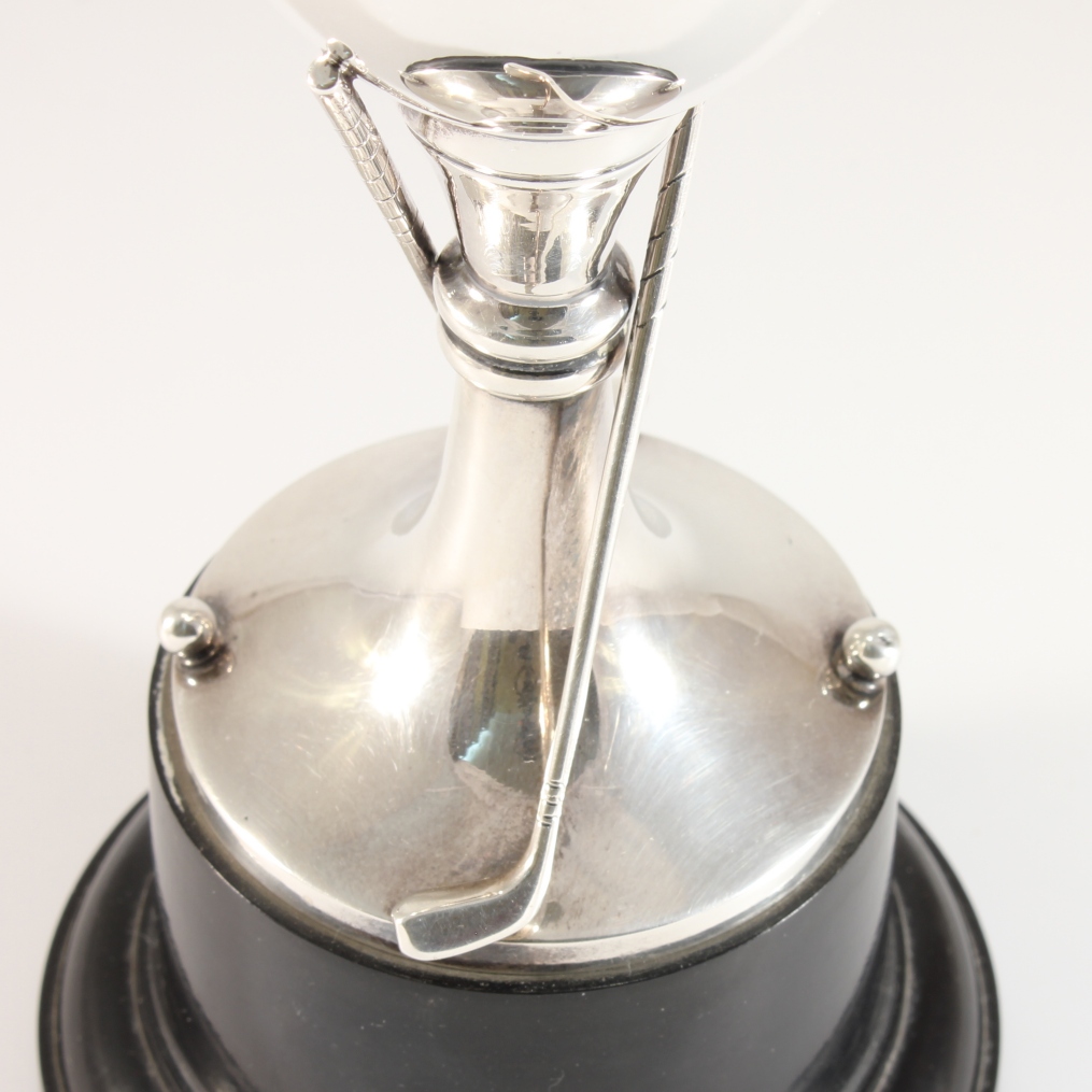 This handsome sterling silver golfing trophy has a wonderful design with two golf clubs and balls and is excellent quality being by silversmith Roberts & Dore.