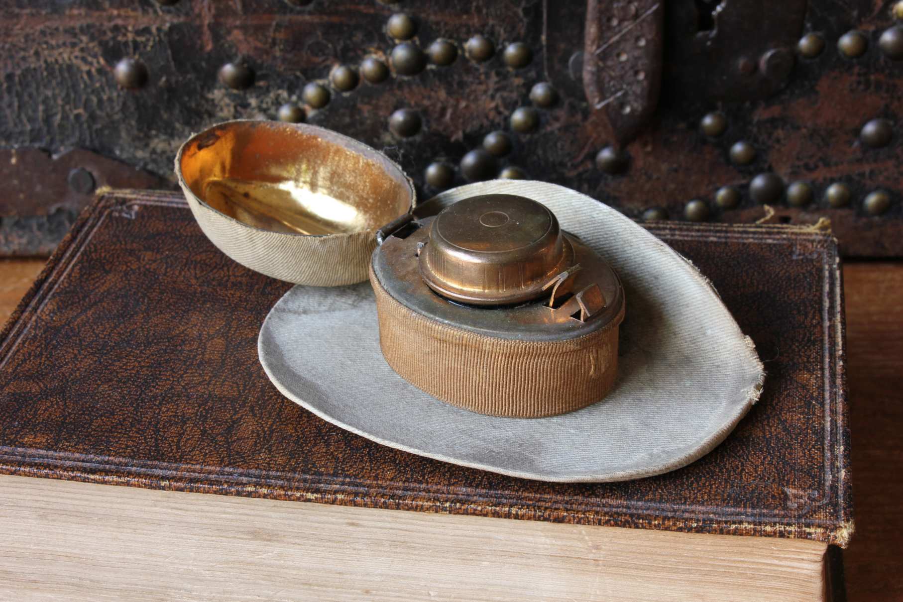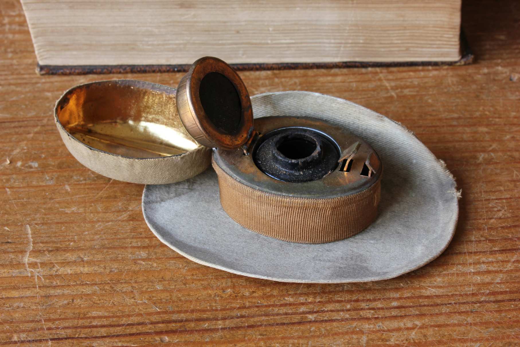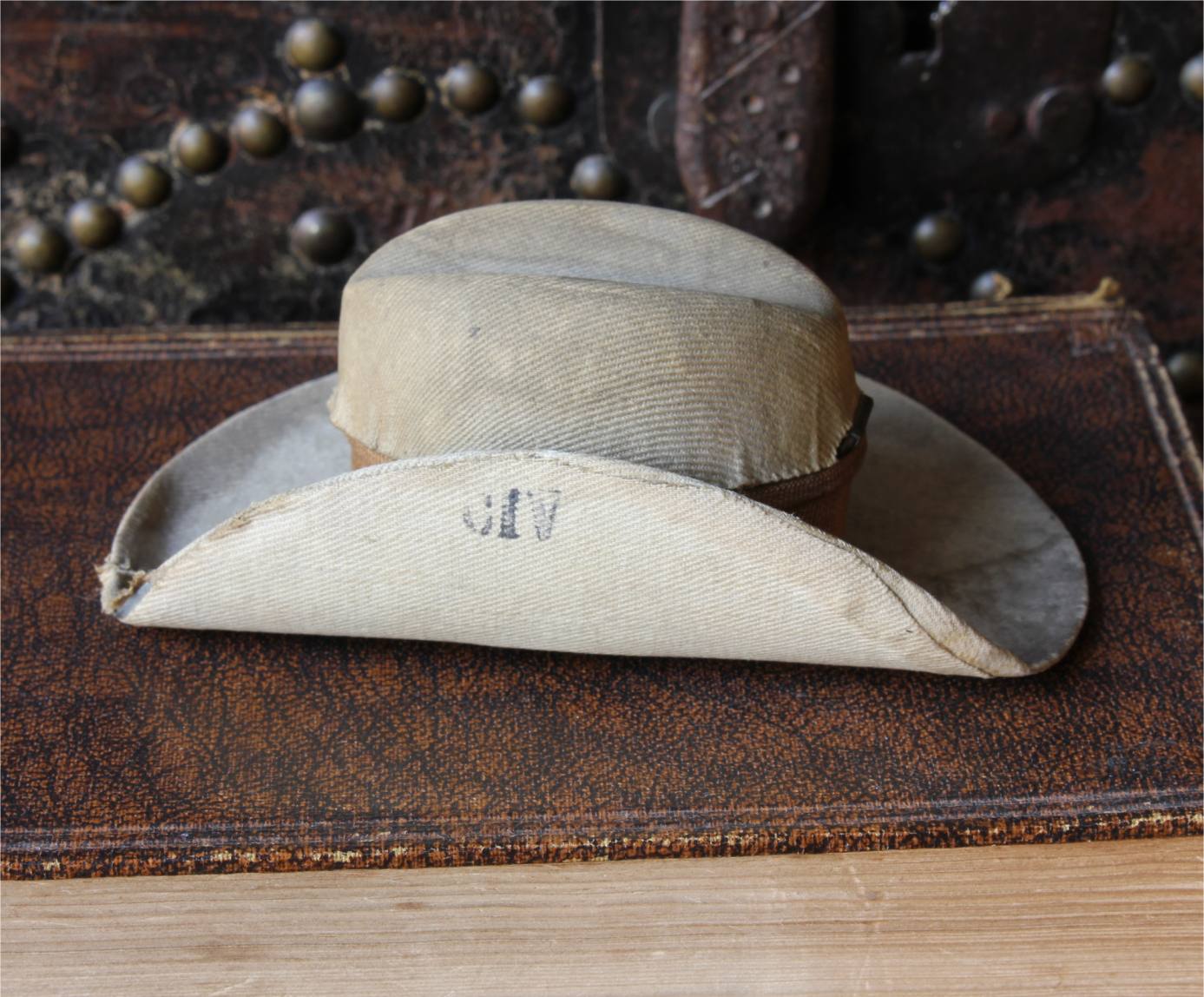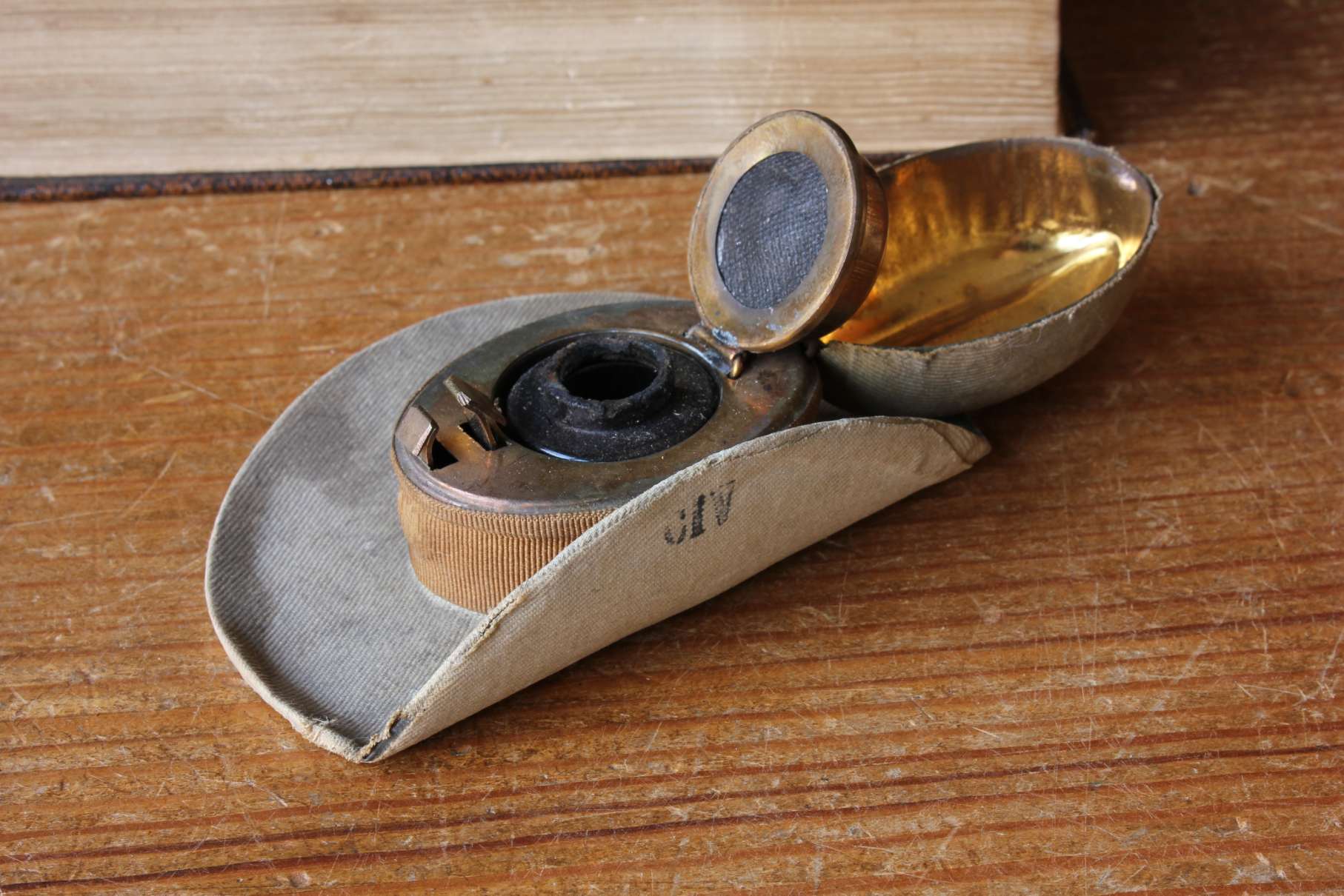 This antique inkwell which is in the form of a slouch hat is made of canvas covered metal and dates from the Boer War.
