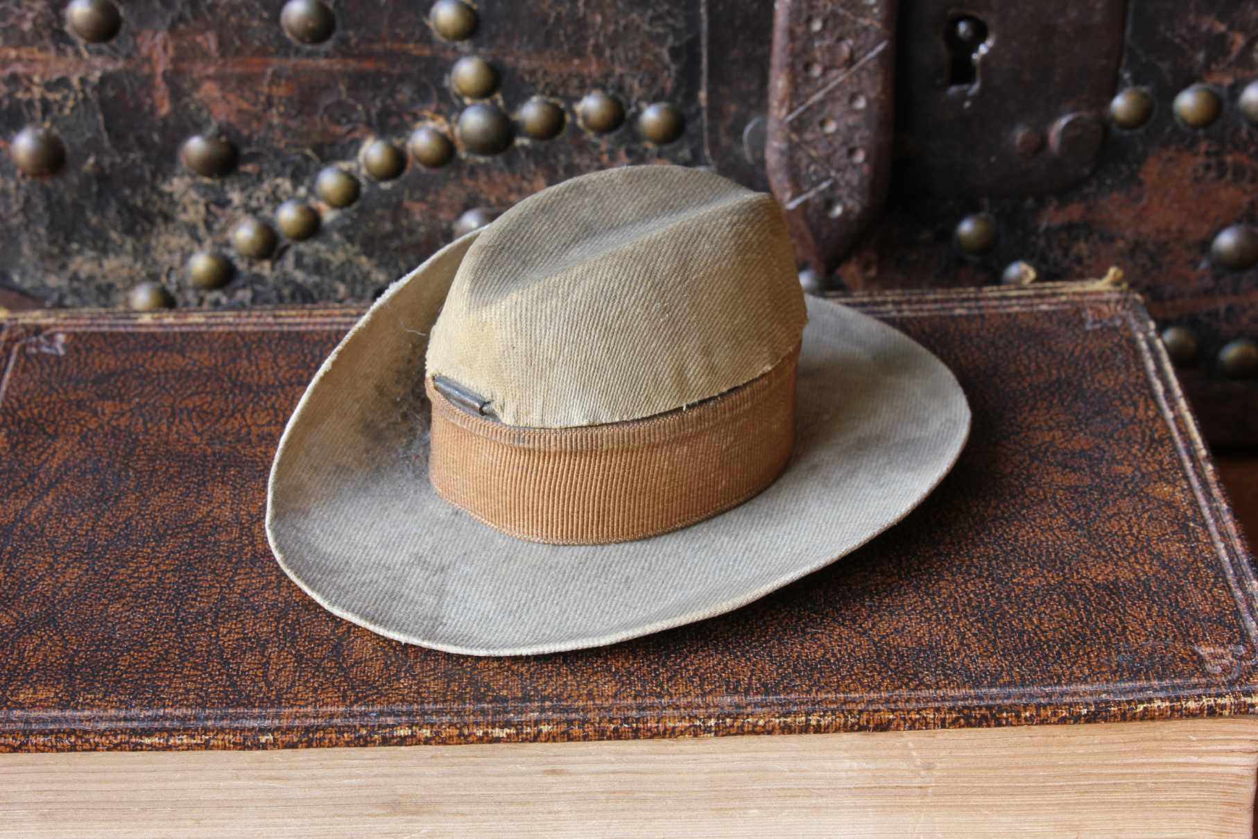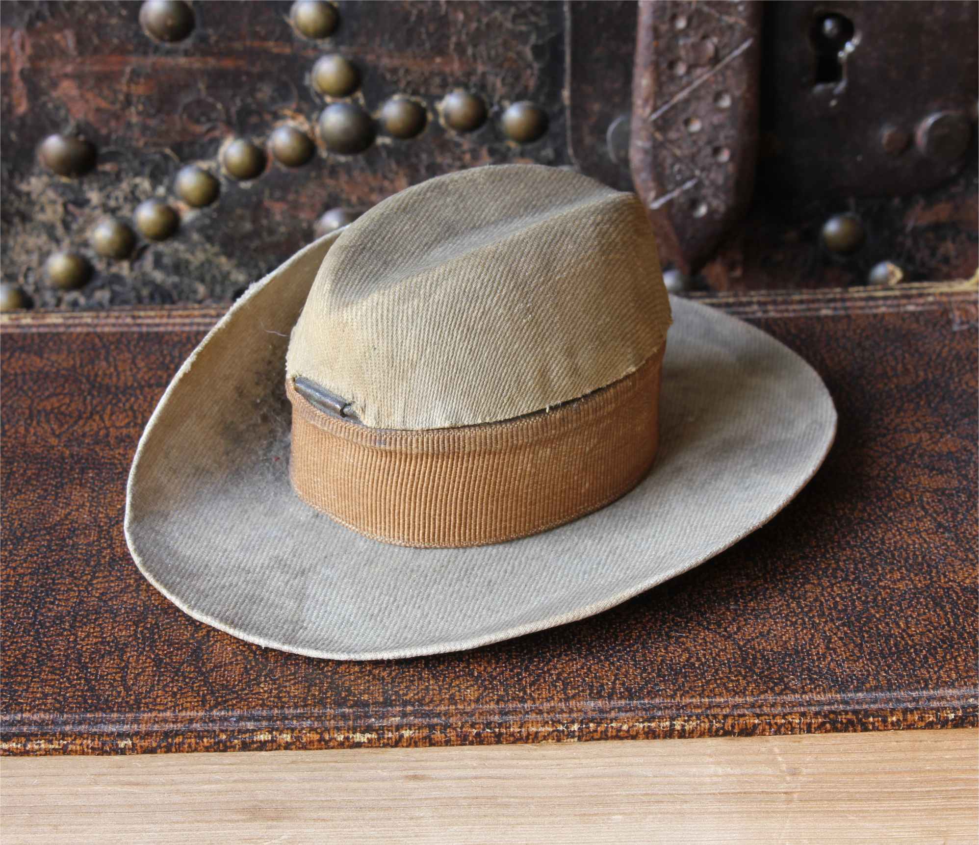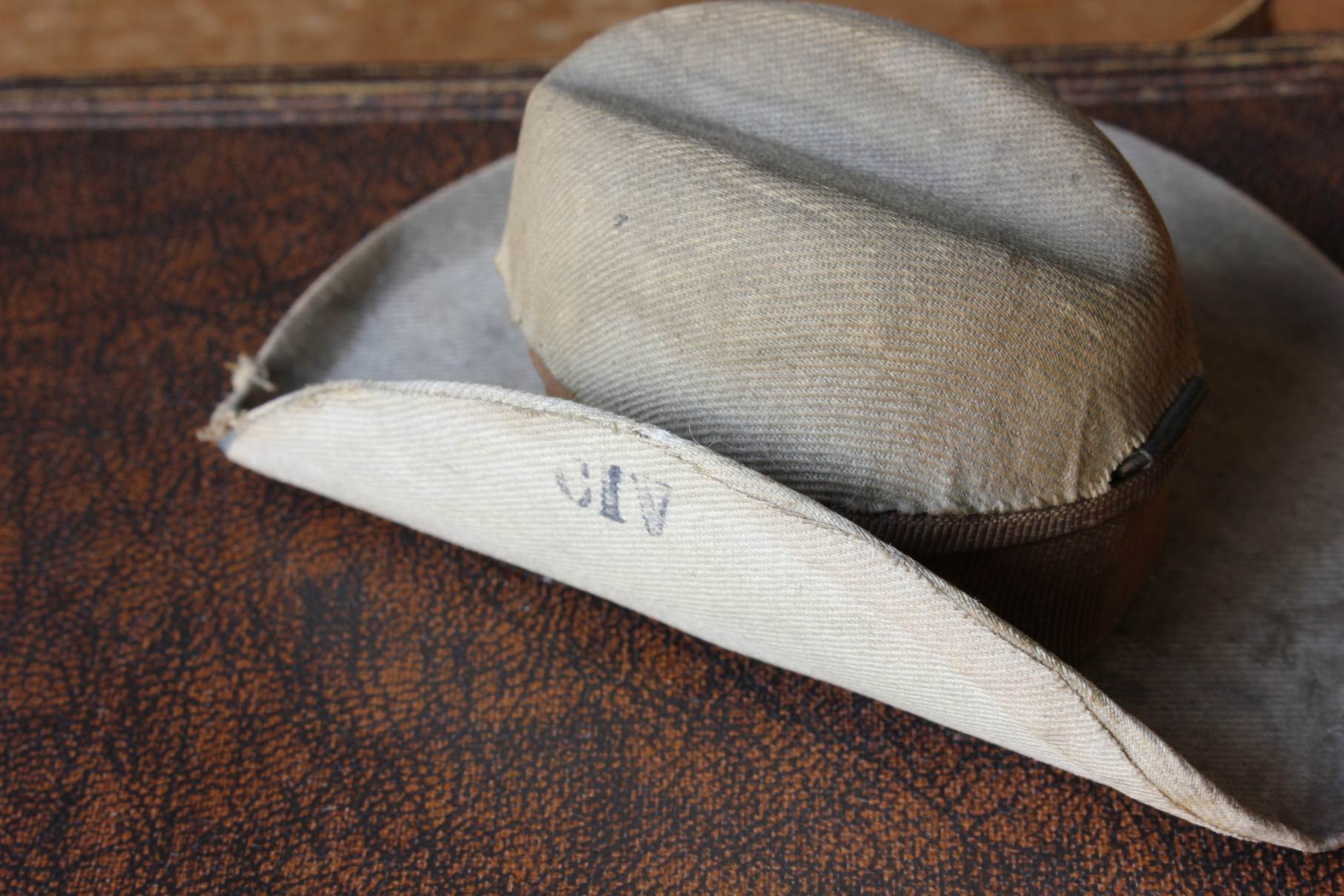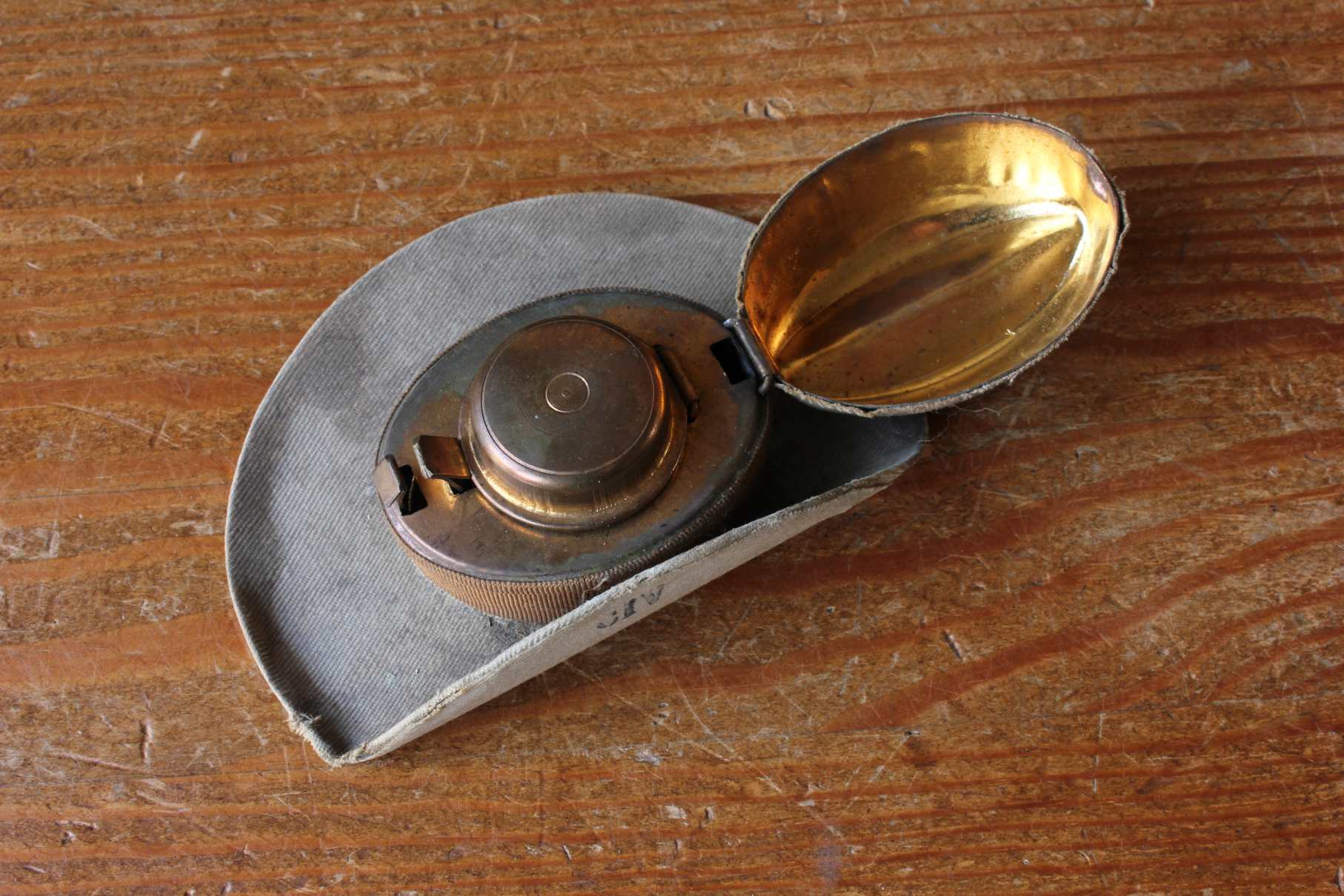 This antique inkwell which is in the form of a slouch hat is made of canvas covered metal and dates from the Boer War.