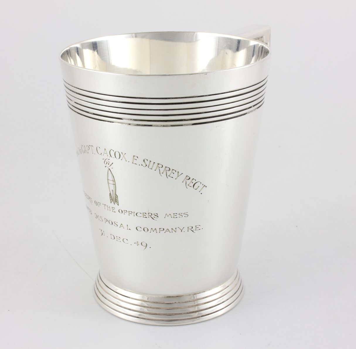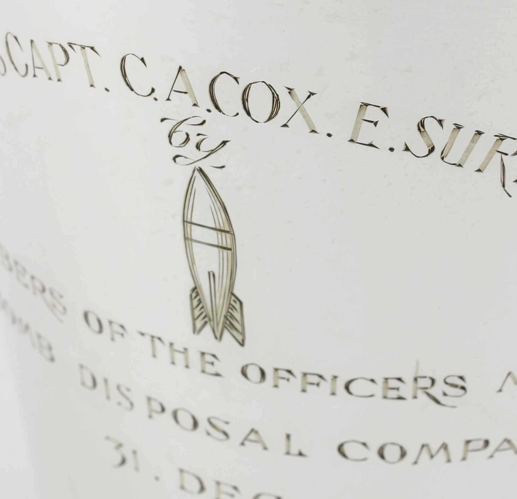 This also shows the 22 Bomb Disposal Company logo and would have been engraved and presented to Captain Cox when their bomb disposal company was disbanded at the end of 1949.