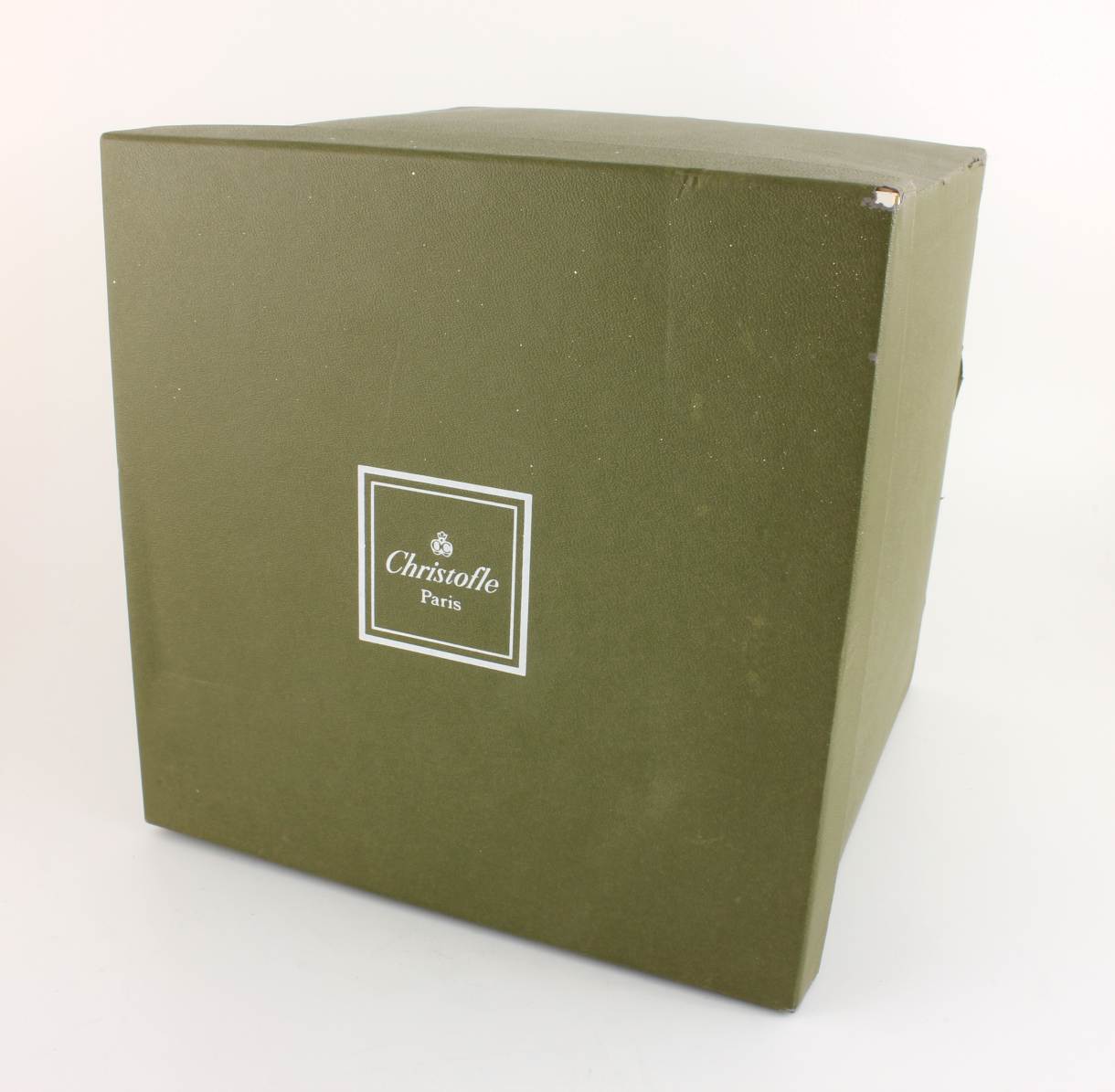 This vintage wine bucket has a stylish look with knob handles to the sides, ring decoration to the body and is a good heavy weight. The underside is marked with the maker's marks, the front is signed Christofle and this wine cooler comes in it's original green Christofle Paris box.
