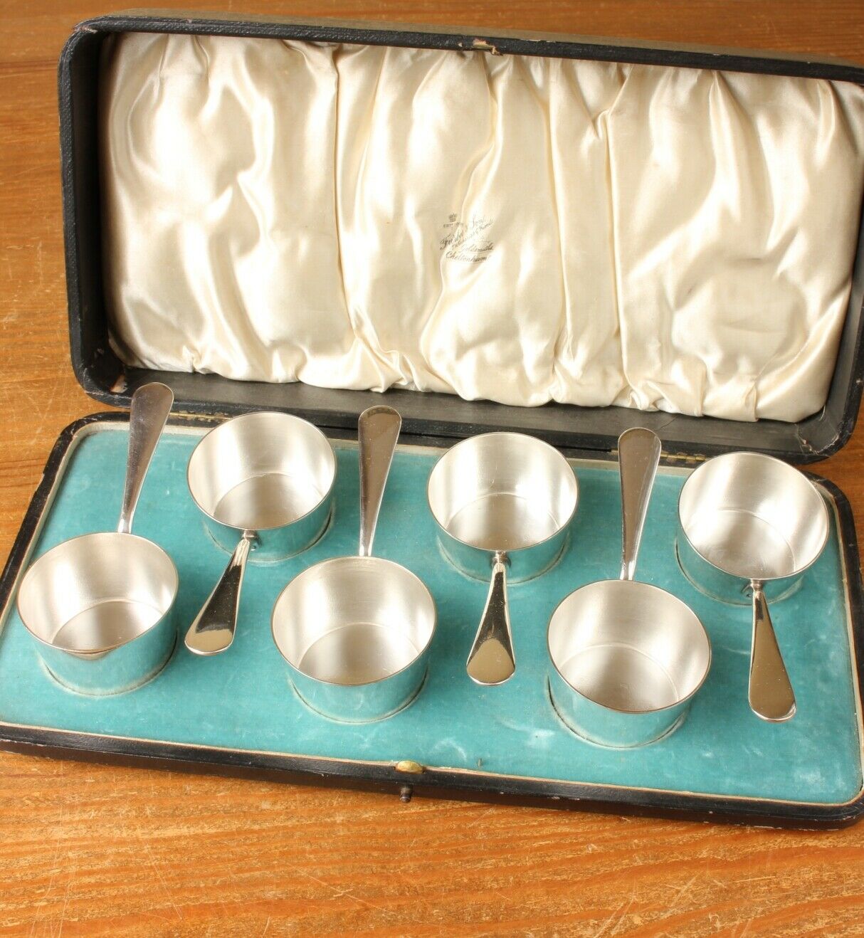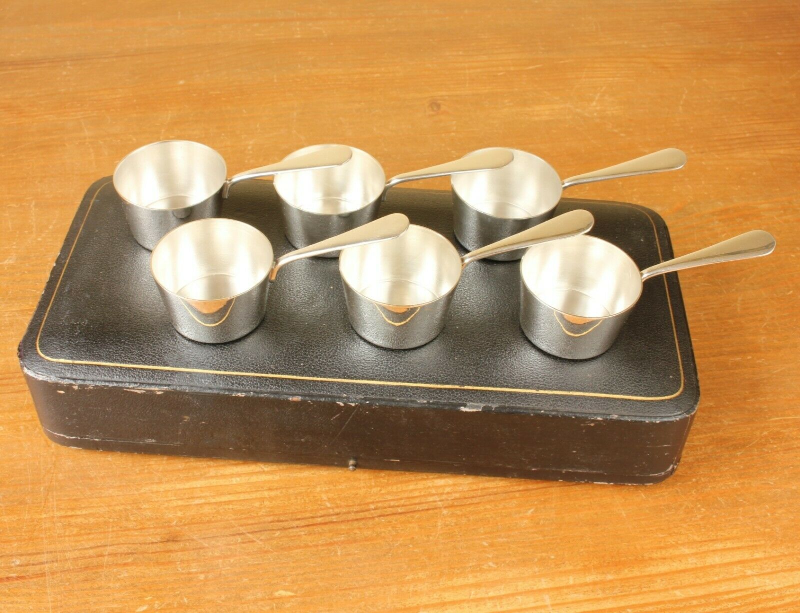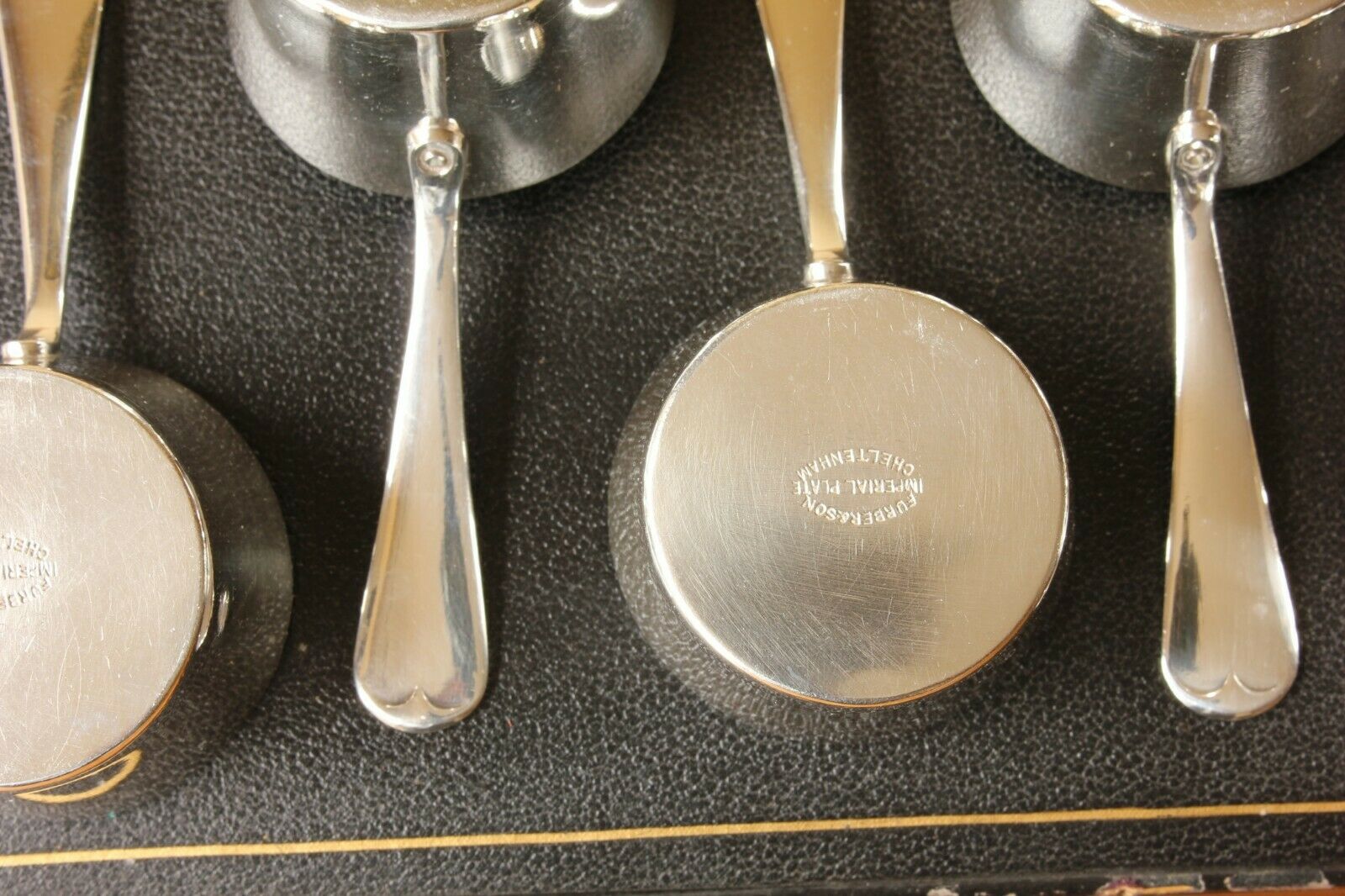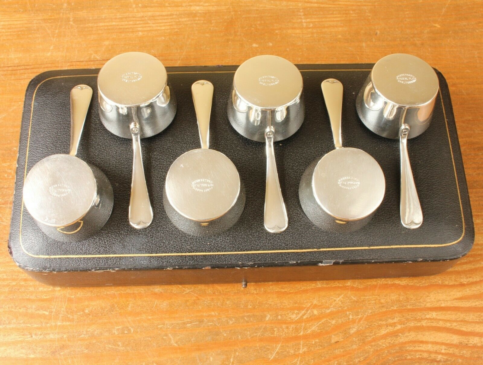 This charming set of six antique brandy warmers which date from c1880 are in the form of petite saucepans, are silver plated, made by Furber & Sons of Cheltenham and come in their original fitted case.