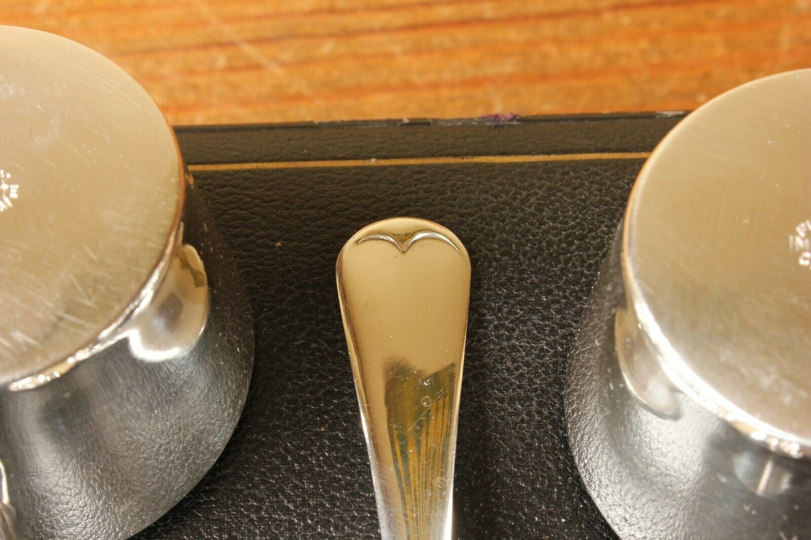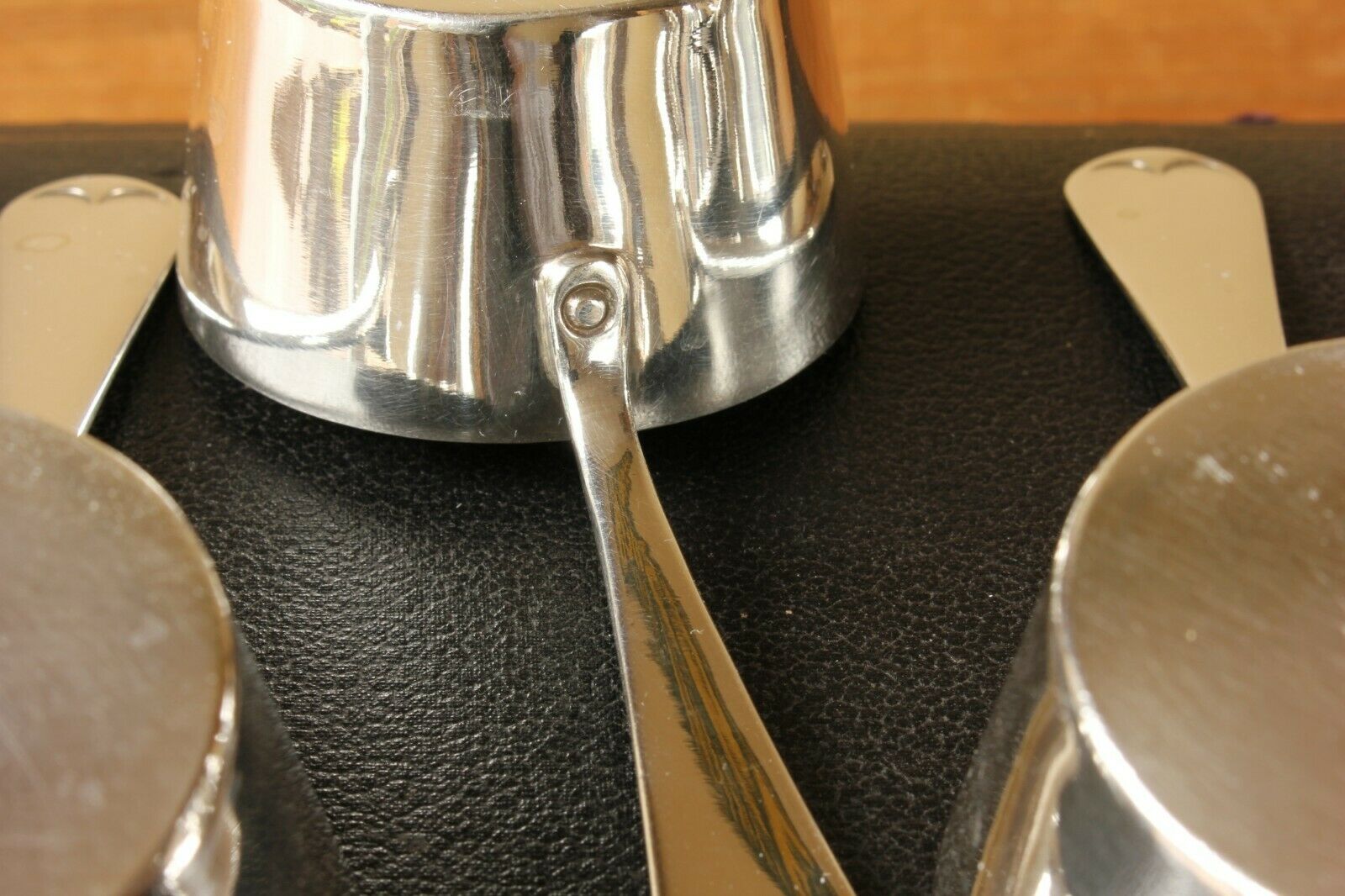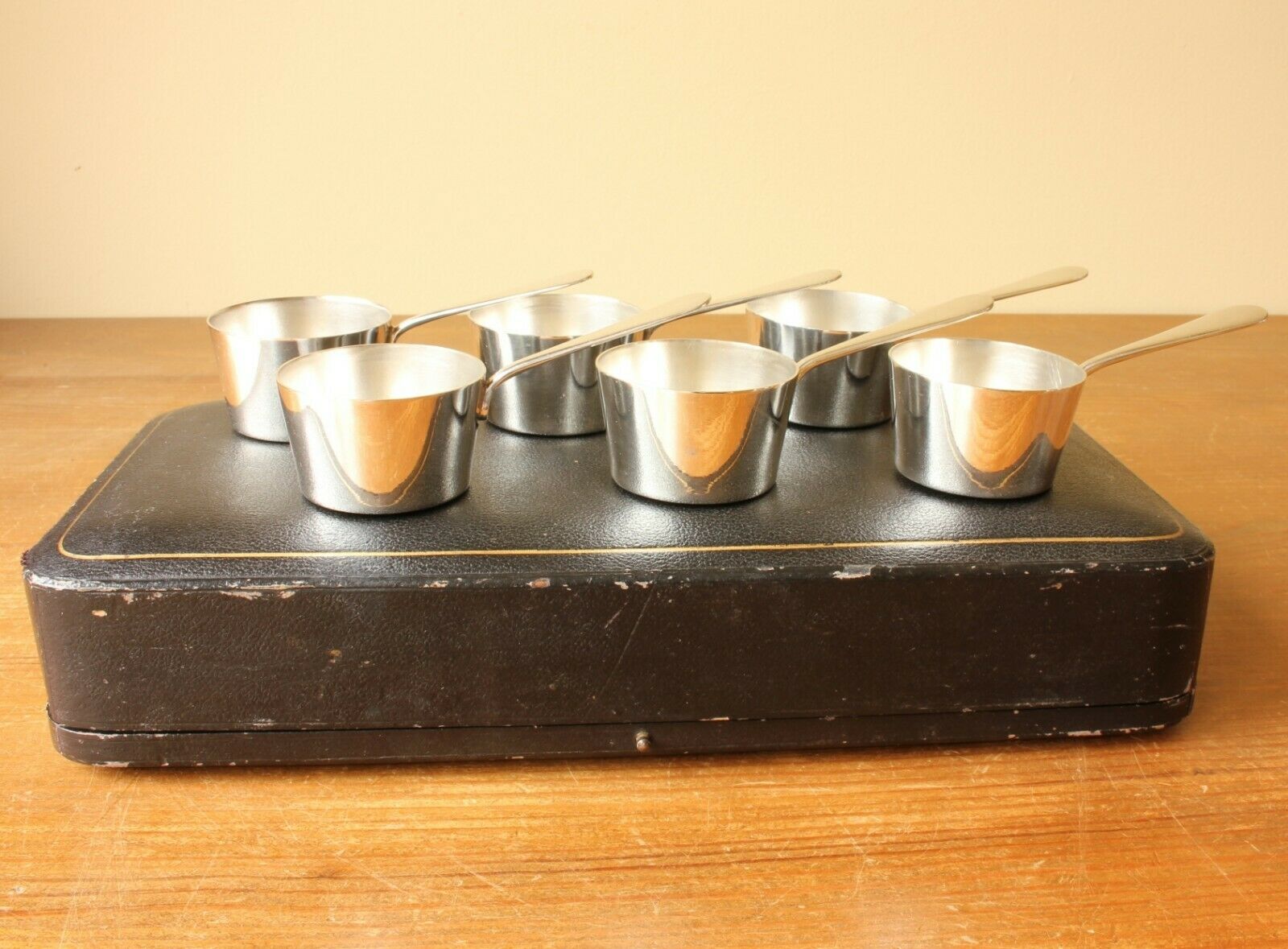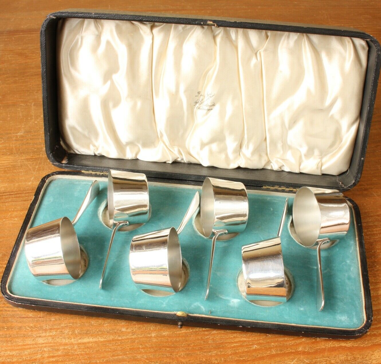 This charming set of six antique brandy warmers which date from c1880 are in the form of petite saucepans, are silver plated, made by Furber & Sons of Cheltenham and come in their original fitted case.