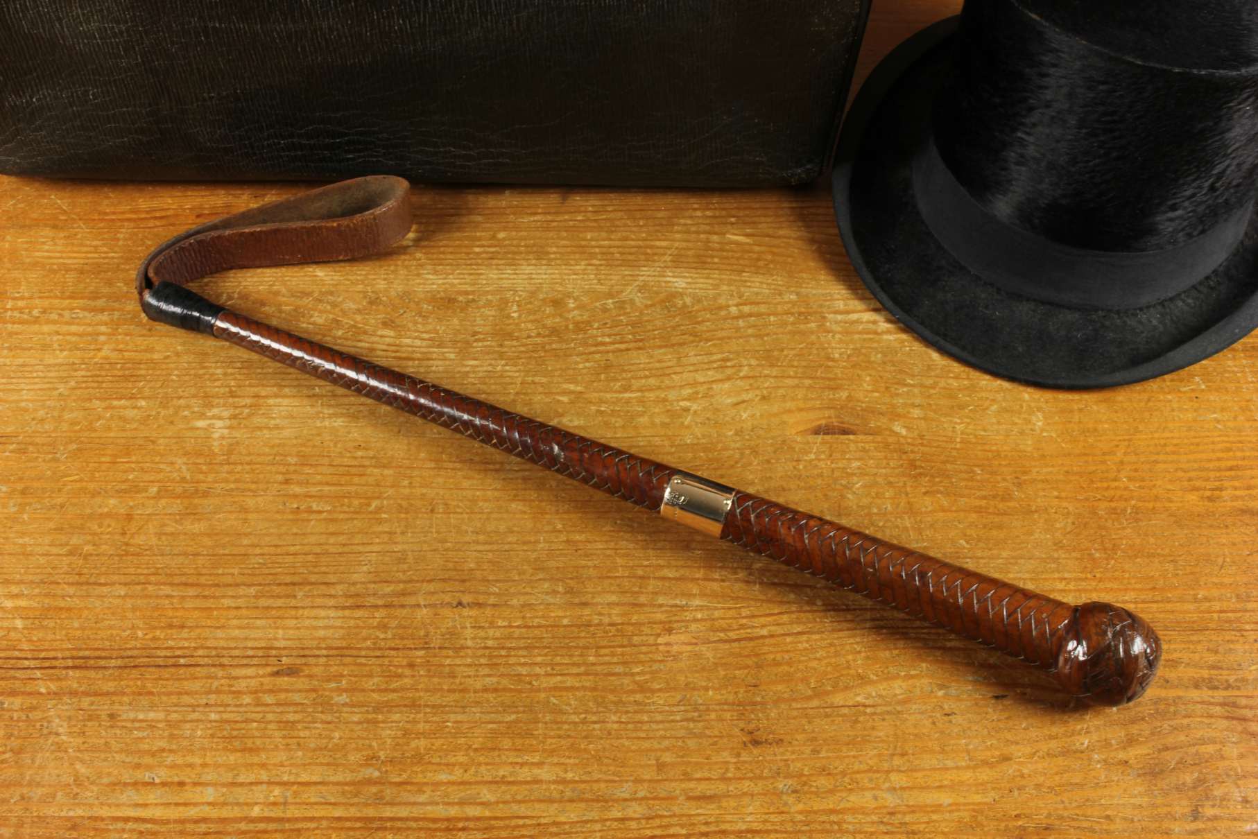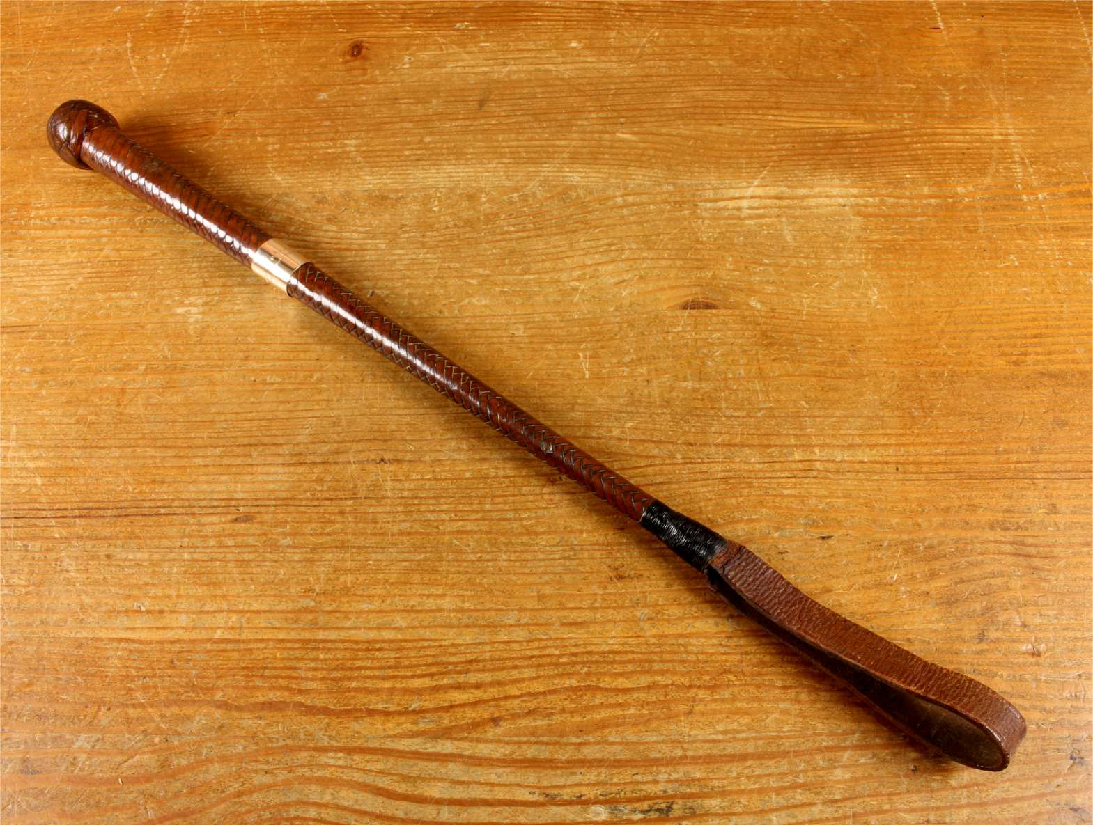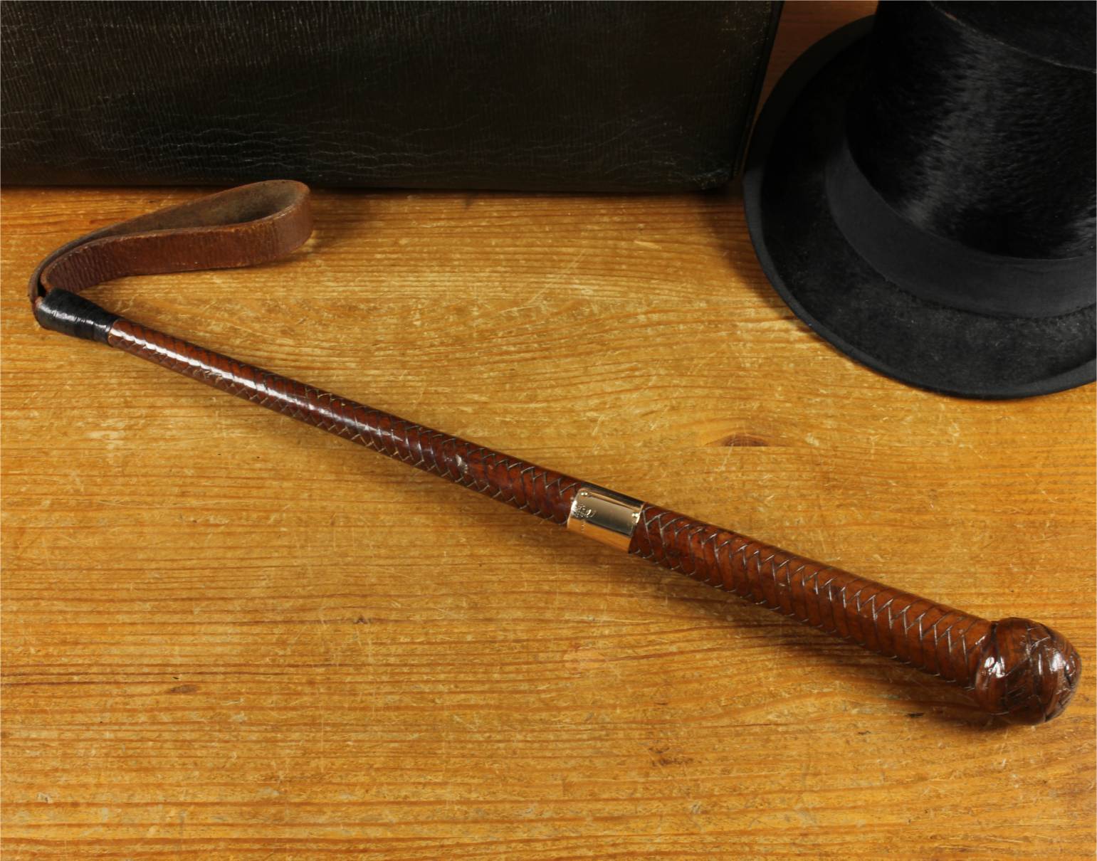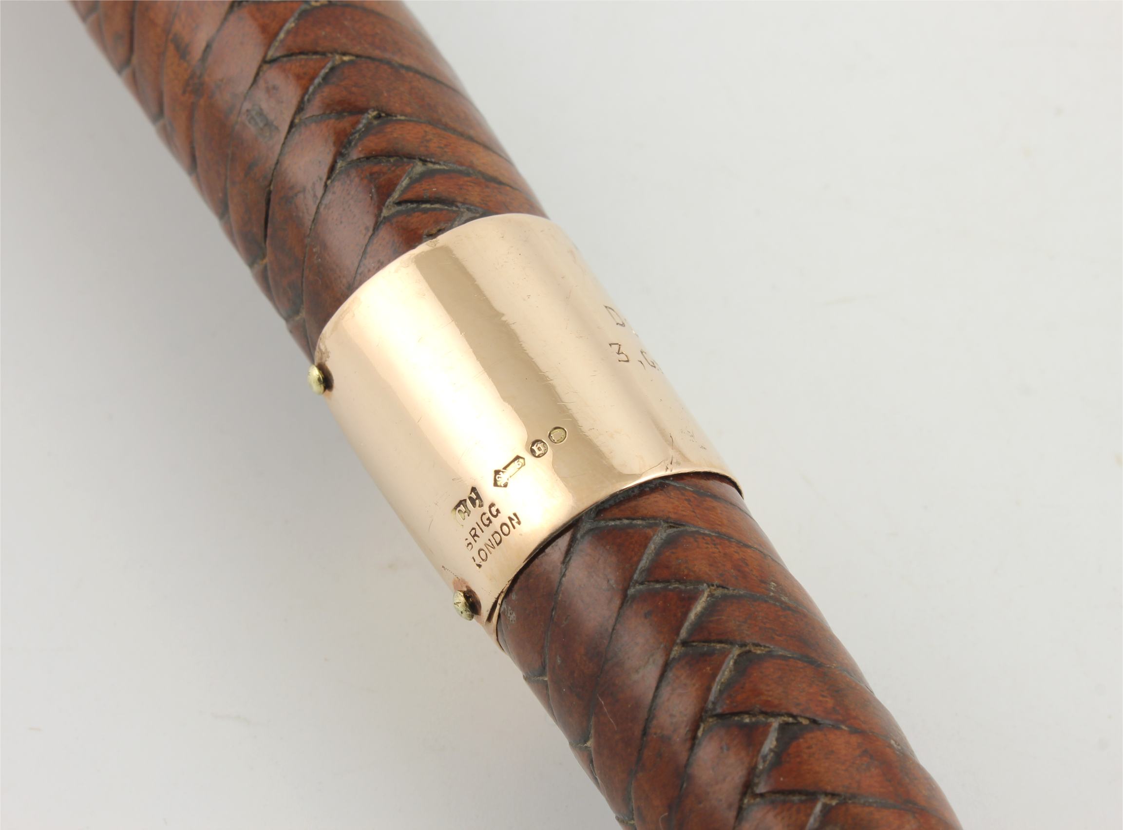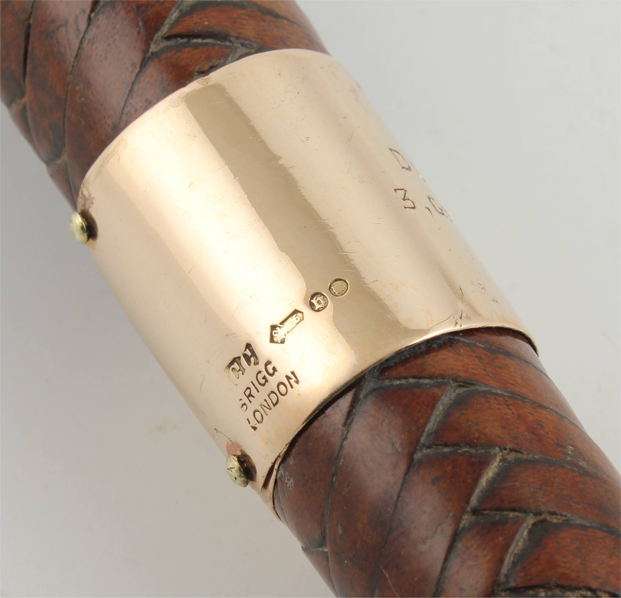This fabulous antique riding crop or whip which is by premier British luxury goods manufacturer Thomas Brigg & Sons of London has been hand braided in brown leather with a heavy weighted ball to one end, leather strap to the other and has a Charles Cooke 12 ct gold collar which dates to 1917.