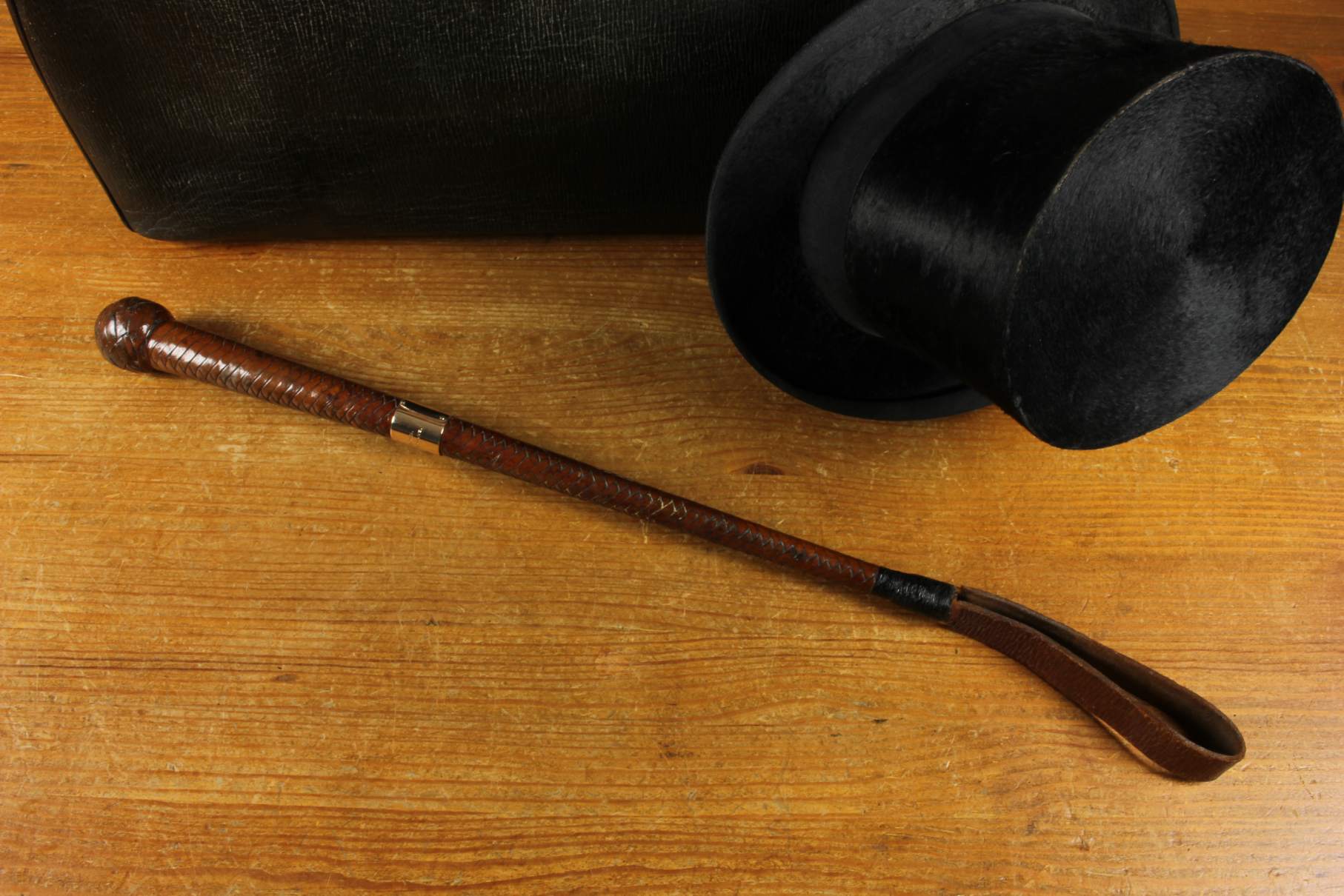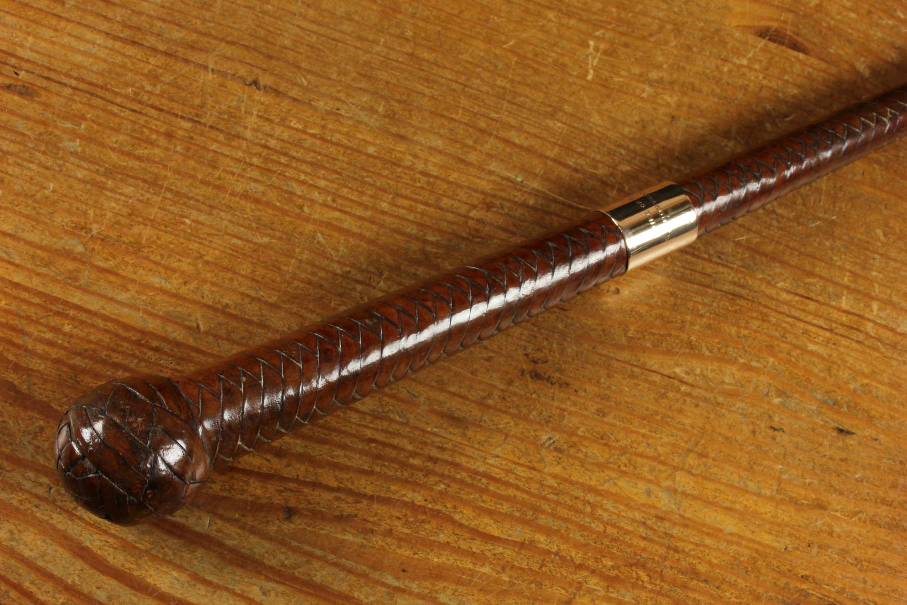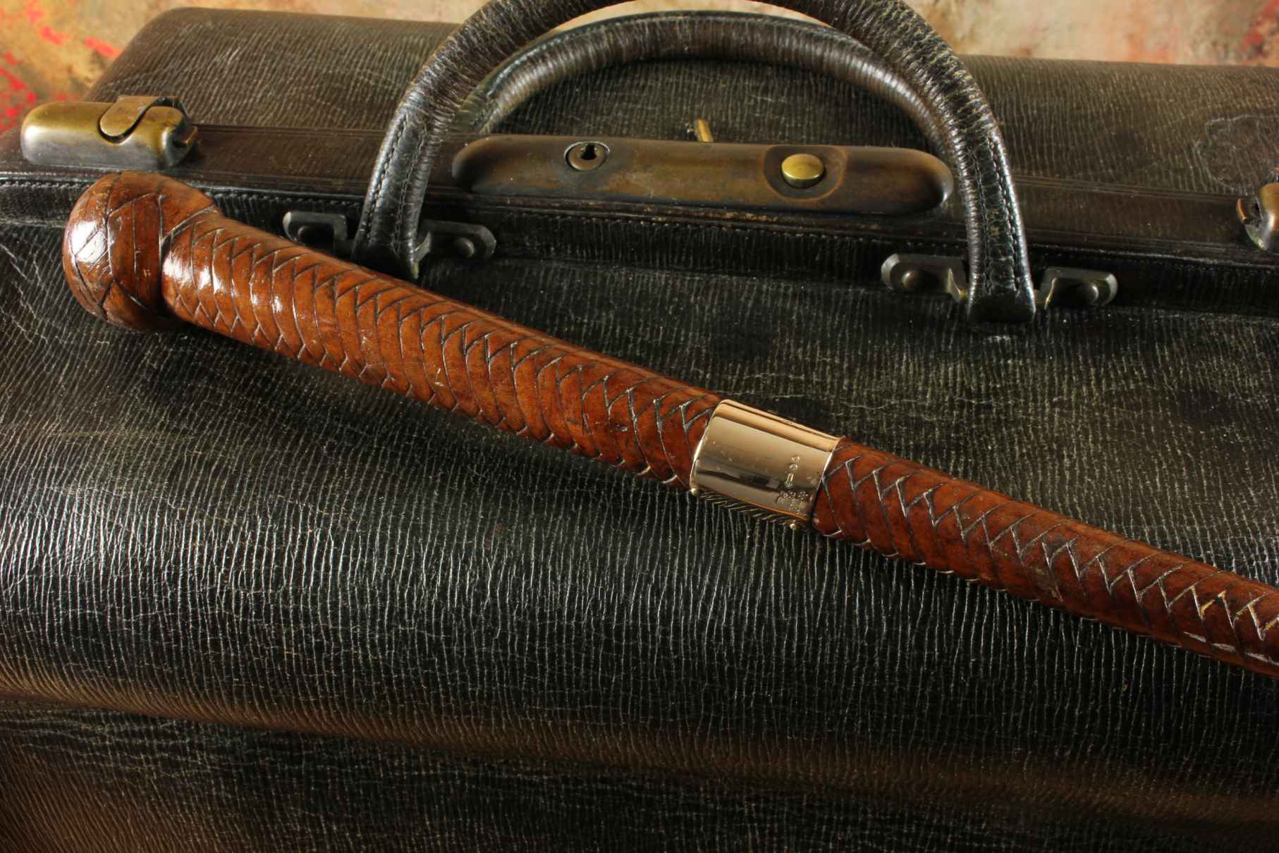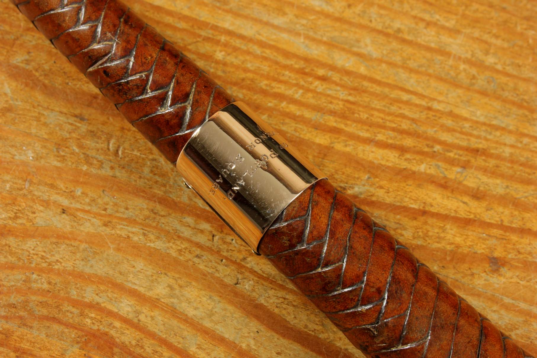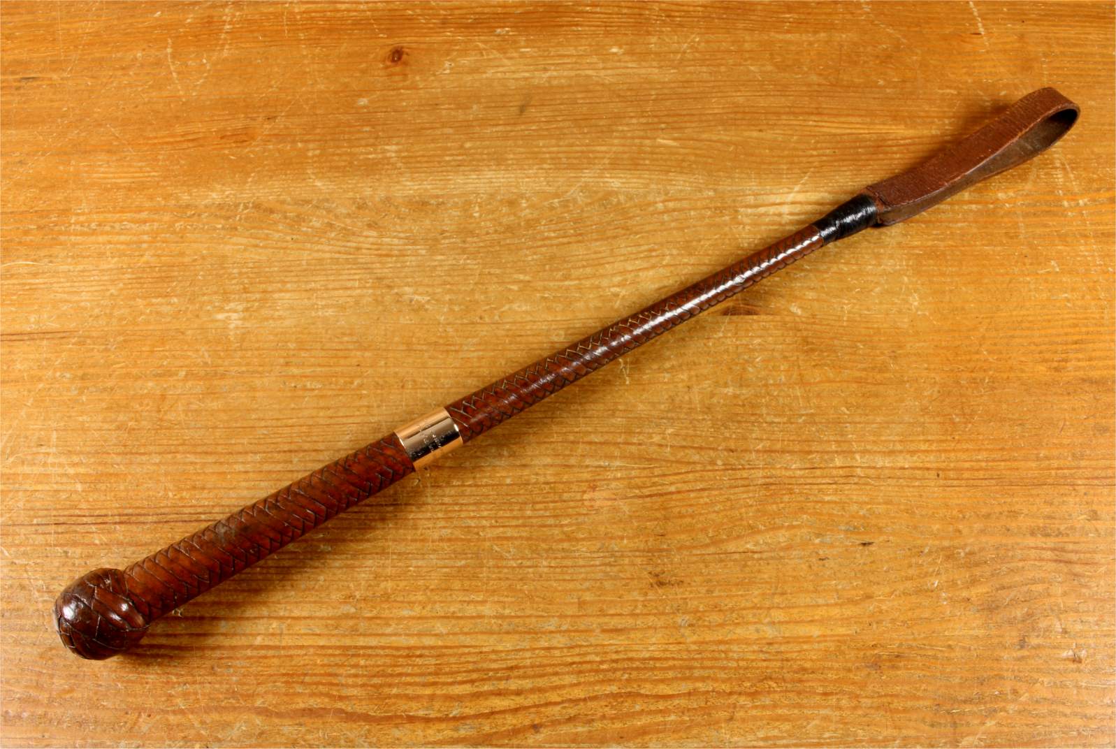 This fabulous antique riding crop or whip which is by premier British luxury goods manufacturer Thomas Brigg & Sons of London has been hand braided in brown leather with a heavy weighted ball to one end, leather strap to the other and has a Charles Cooke 12 ct gold collar which dates to 1917.