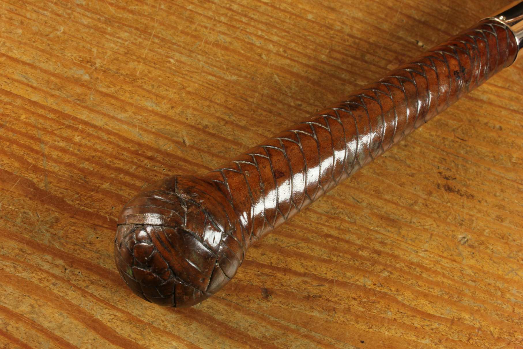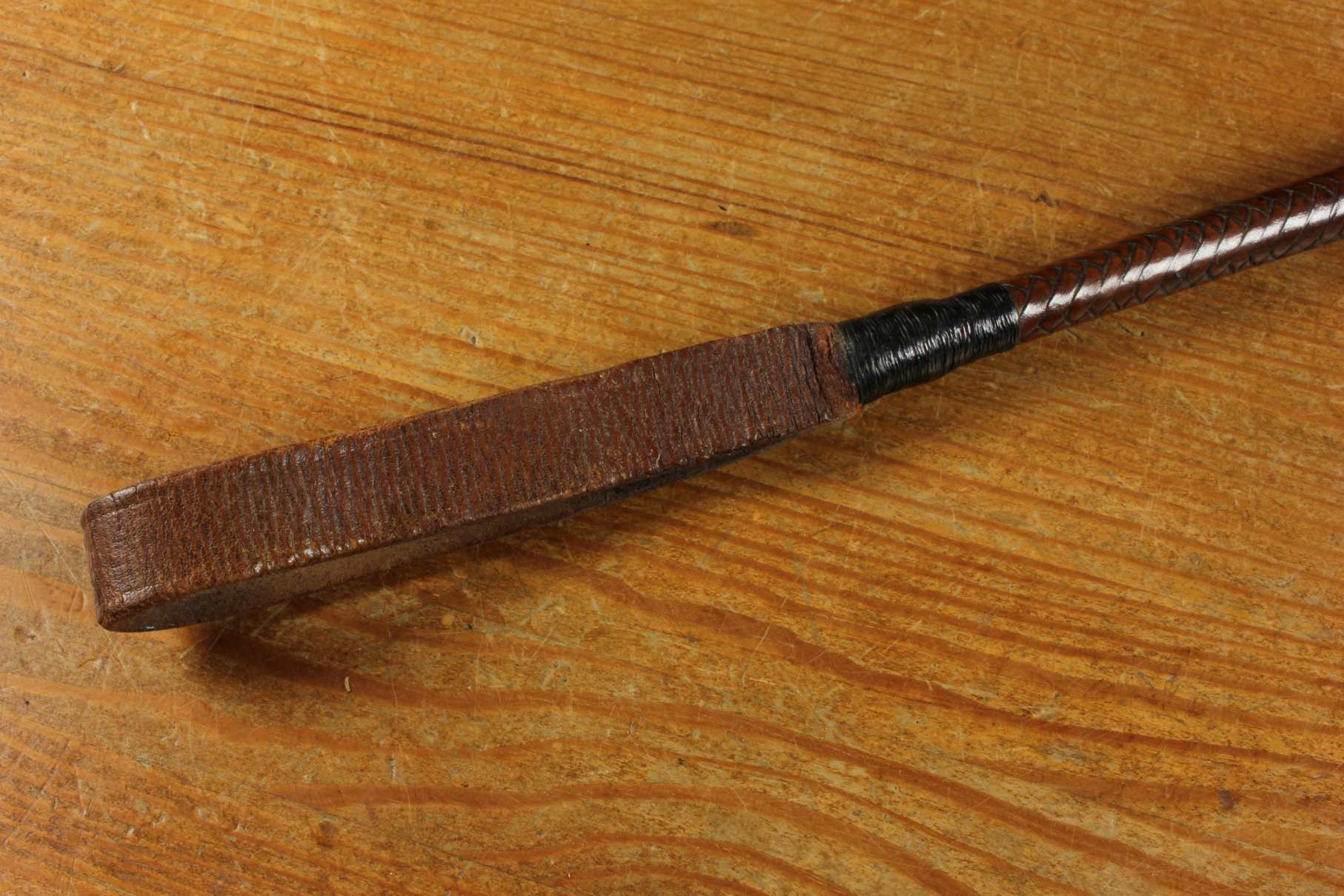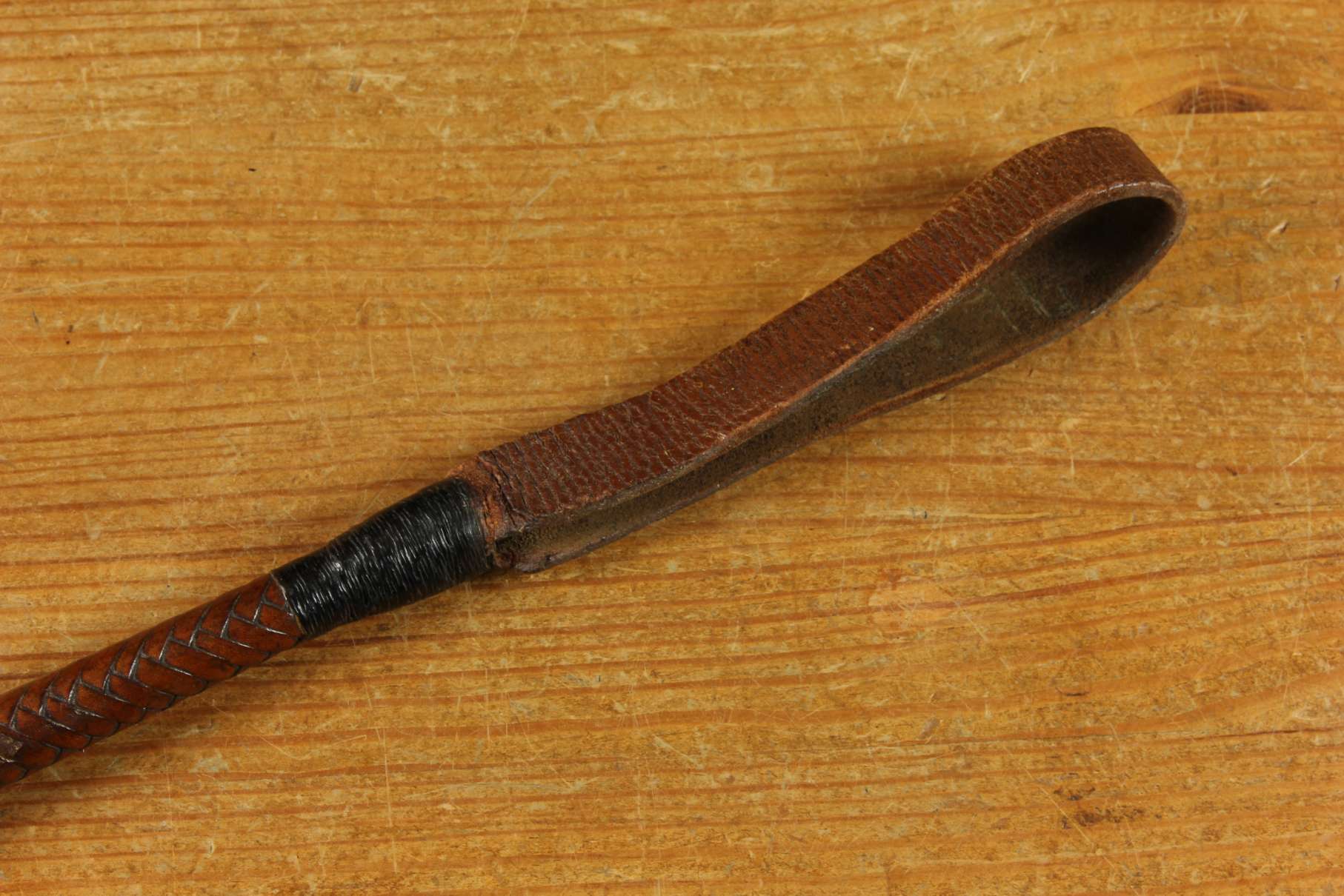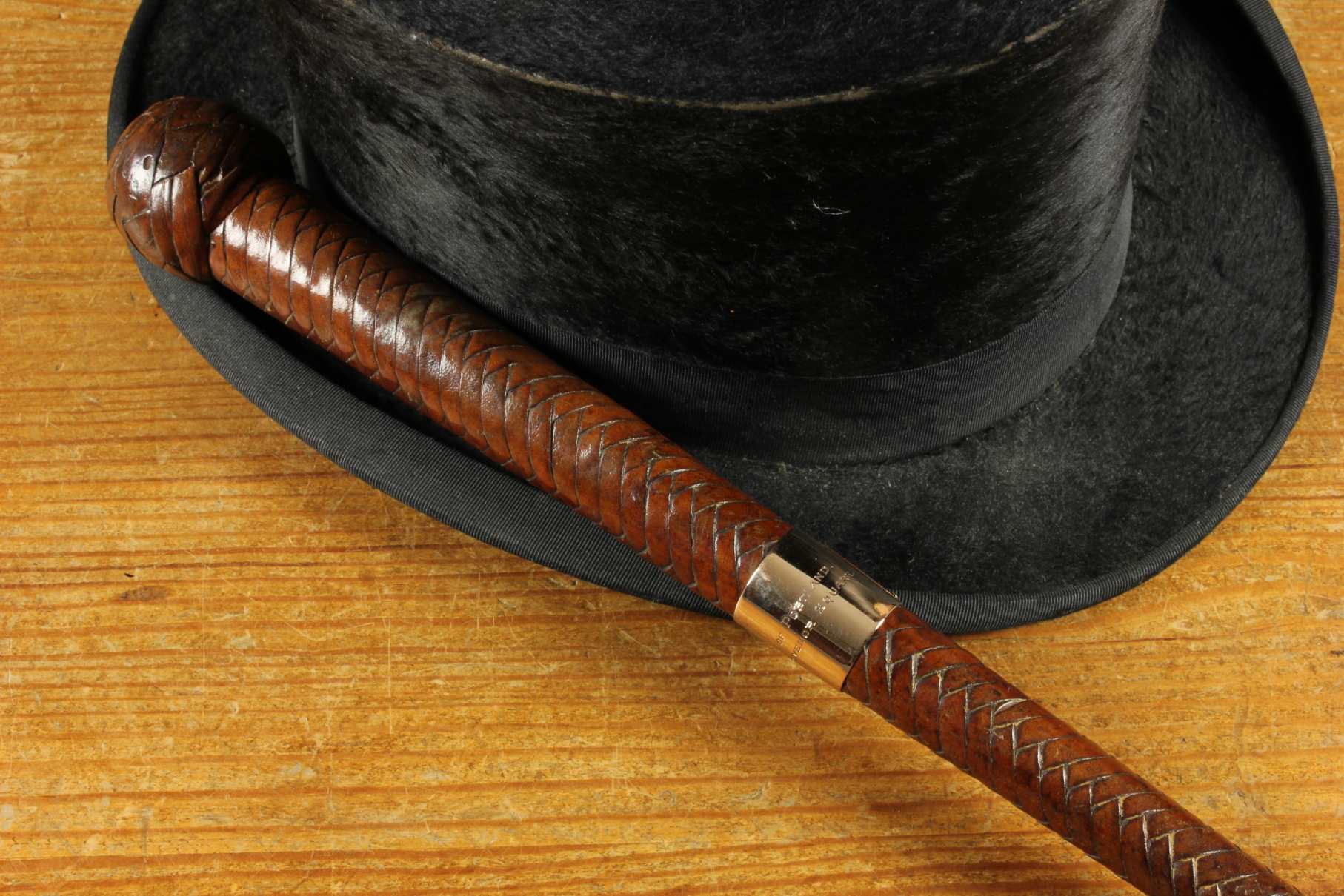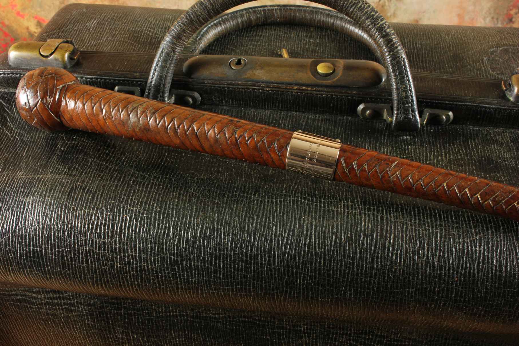 This fabulous antique riding crop or whip which is by premier British luxury goods manufacturer Thomas Brigg & Sons of London has been hand braided in brown leather with a heavy weighted ball to one end, leather strap to the other and has a Charles Cooke 12 ct gold collar which dates to 1917.