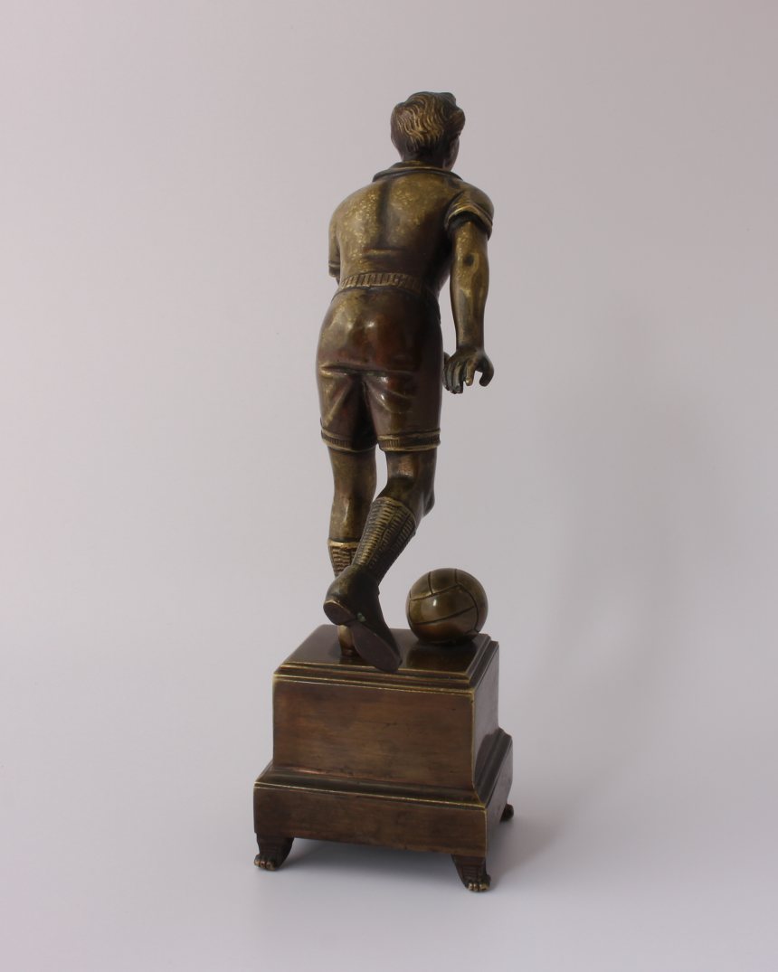 This original French Art Deco football statue which is made of heavy bronze dates from c1925 and is of an early style player about to kick a football. This heavy antique bronze footballer which stands on it's bronze raised rectangle base features good detail to his clothing, socks and boots.