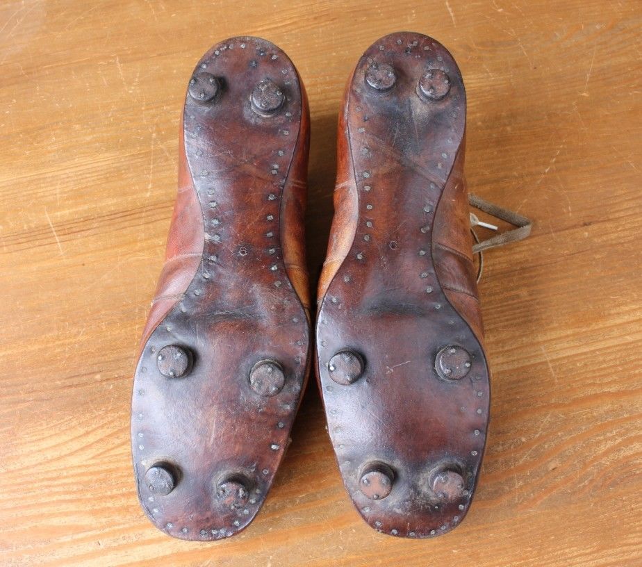 This superb pair of International football boots which date from the 1940's/1950's are made of brown leather with leather nailed soles and studs.