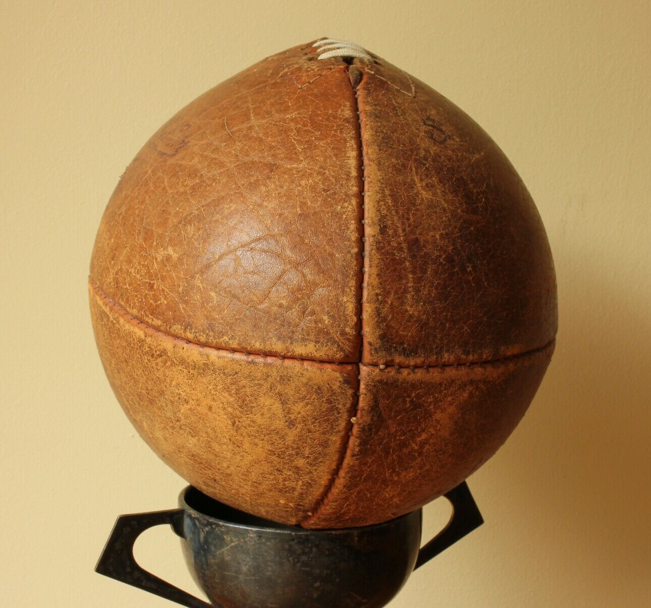 This unusual ball is a 4 panel design with 6 pairs of lace holes. The Beritex bladder which looks like the original is inside which is inflated. The ball holds it's shape well for display.