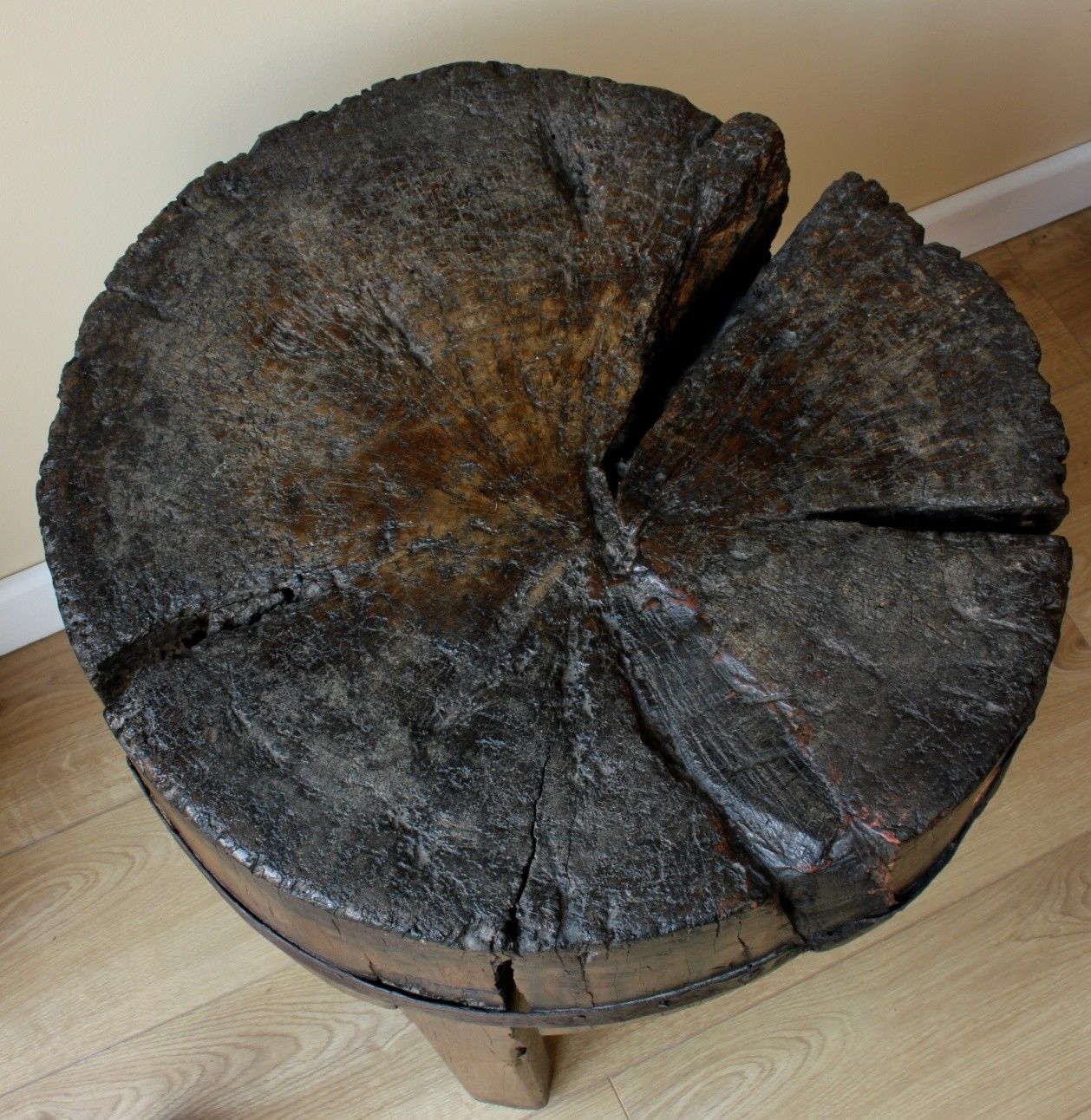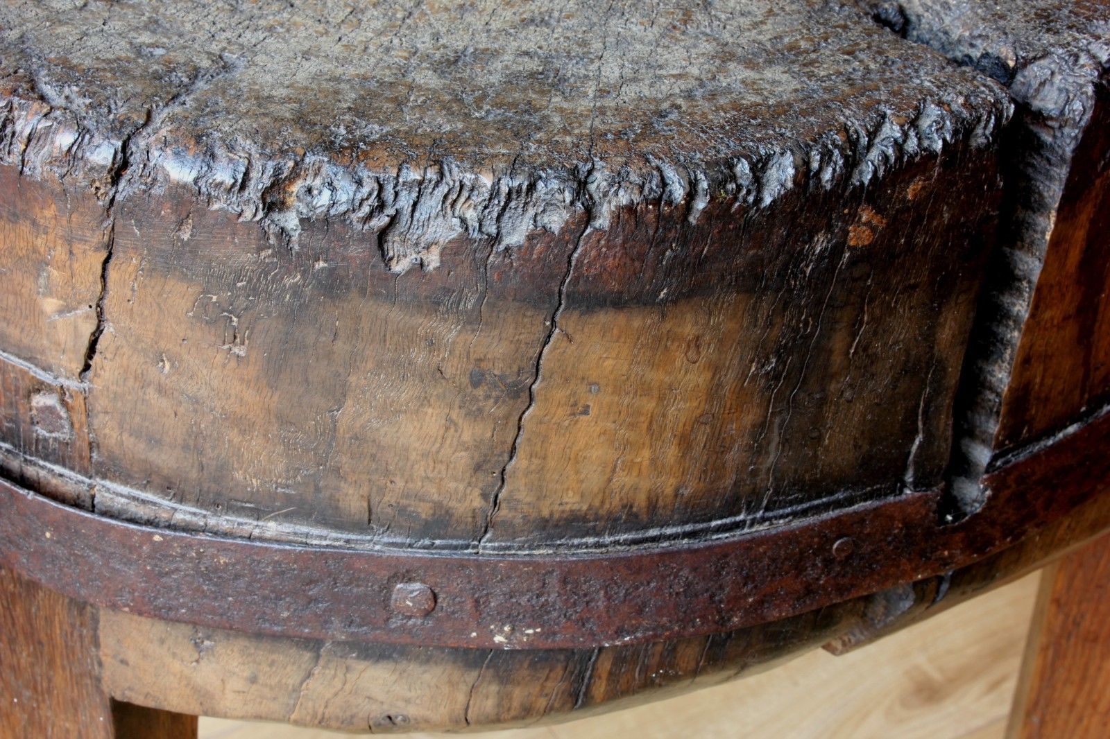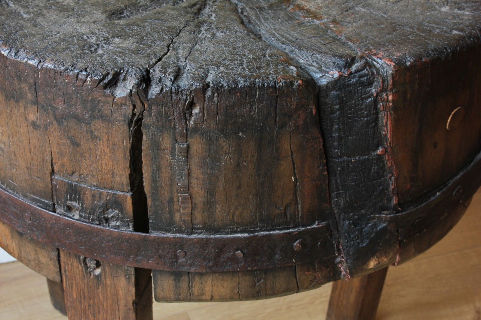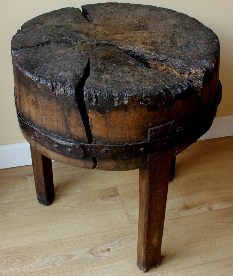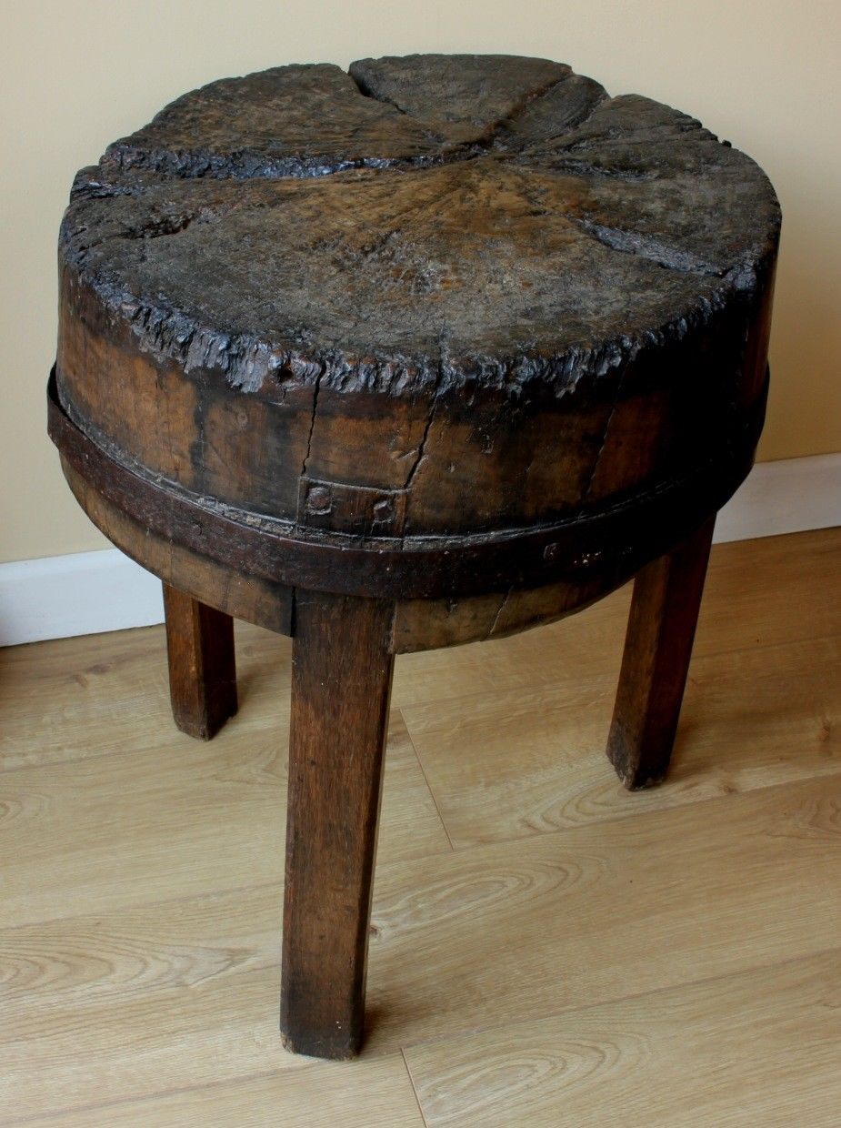 The rich dark colour of the butcher's block is amazing due to it's patina from many years of use. This is a very old and very heavy piece of wood that makes a wonderful table.