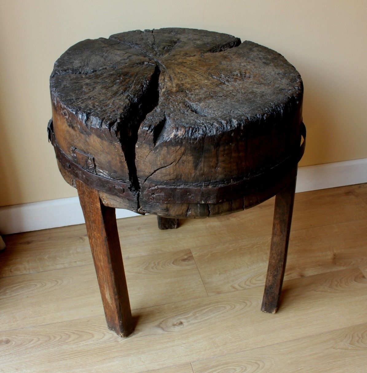 This stunning antique butcher's block is in the form of a primitive table with three chamferred legs and iron banding.