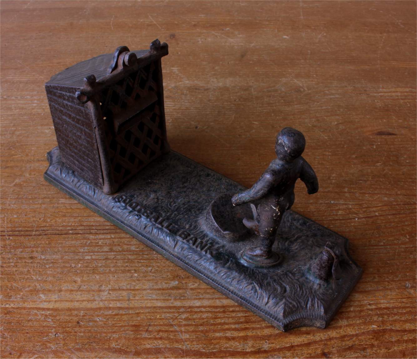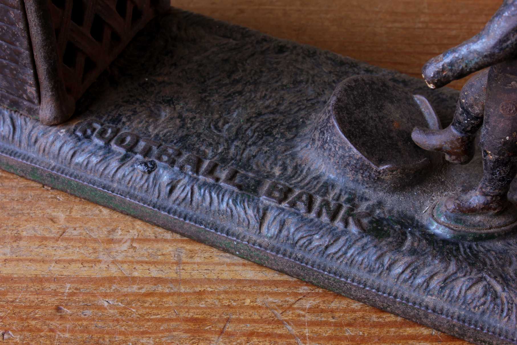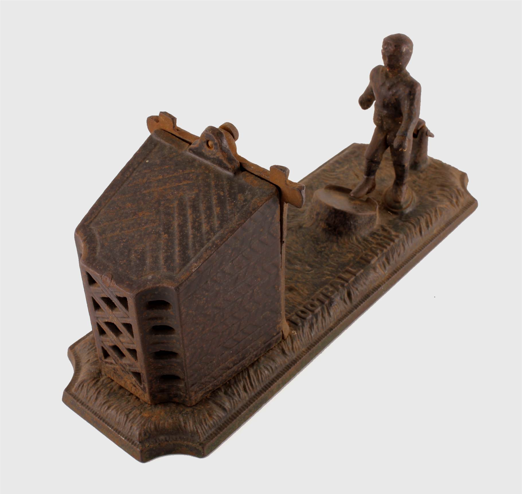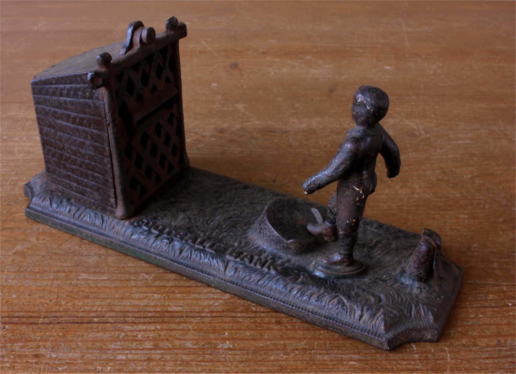This scarce antique money bank which dates from the late 19th century is made of cast iron by John Harper & Co and is in the form of a football player shooting a goal into the net.