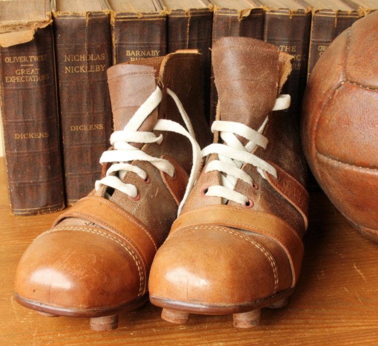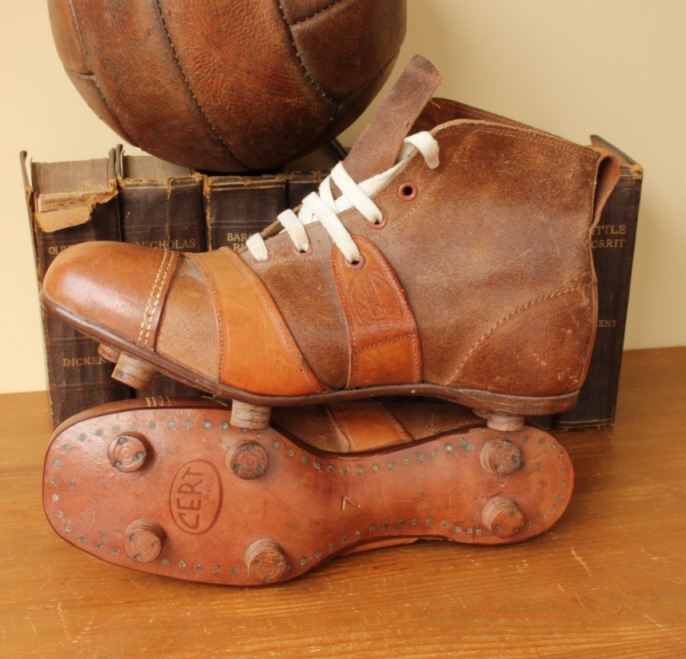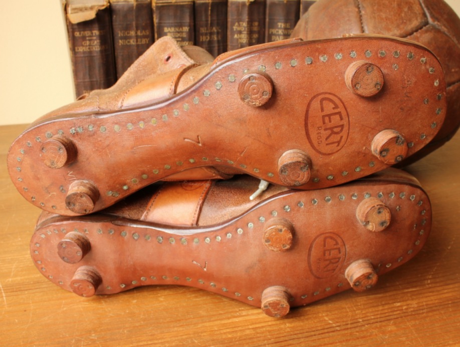 This rare pair of early 20th century Cert Gripwell football boots are made of brown leather with leather soles and nailed on leather studs.