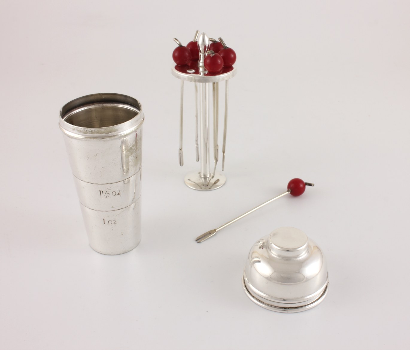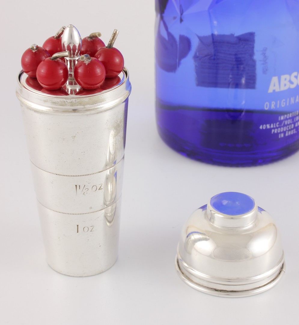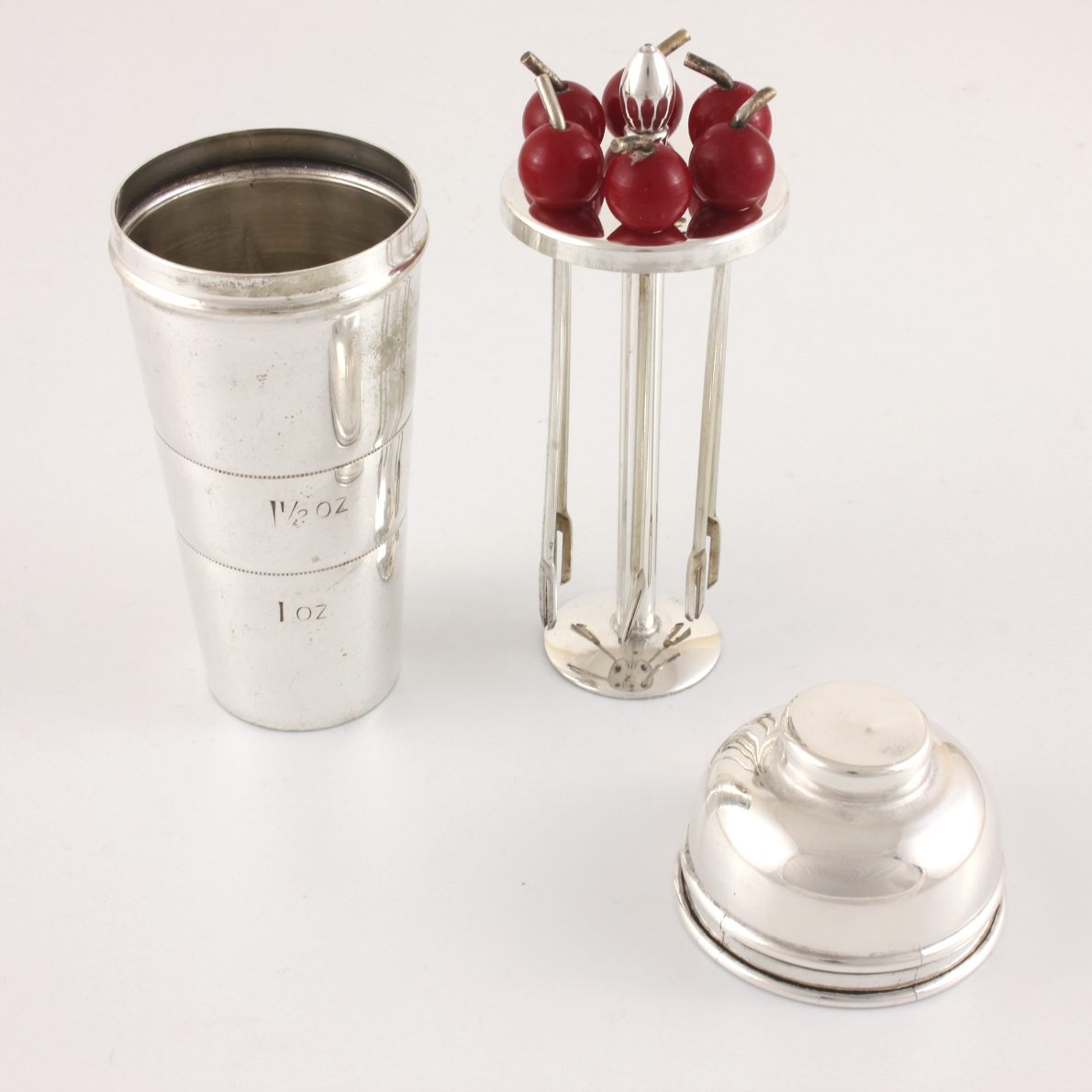 This fun vintage set of six cocktail sticks which feature red cherry tops come complete in their silver plated spirit measure which is in the form of a miniature art deco cocktail shaker with lid.