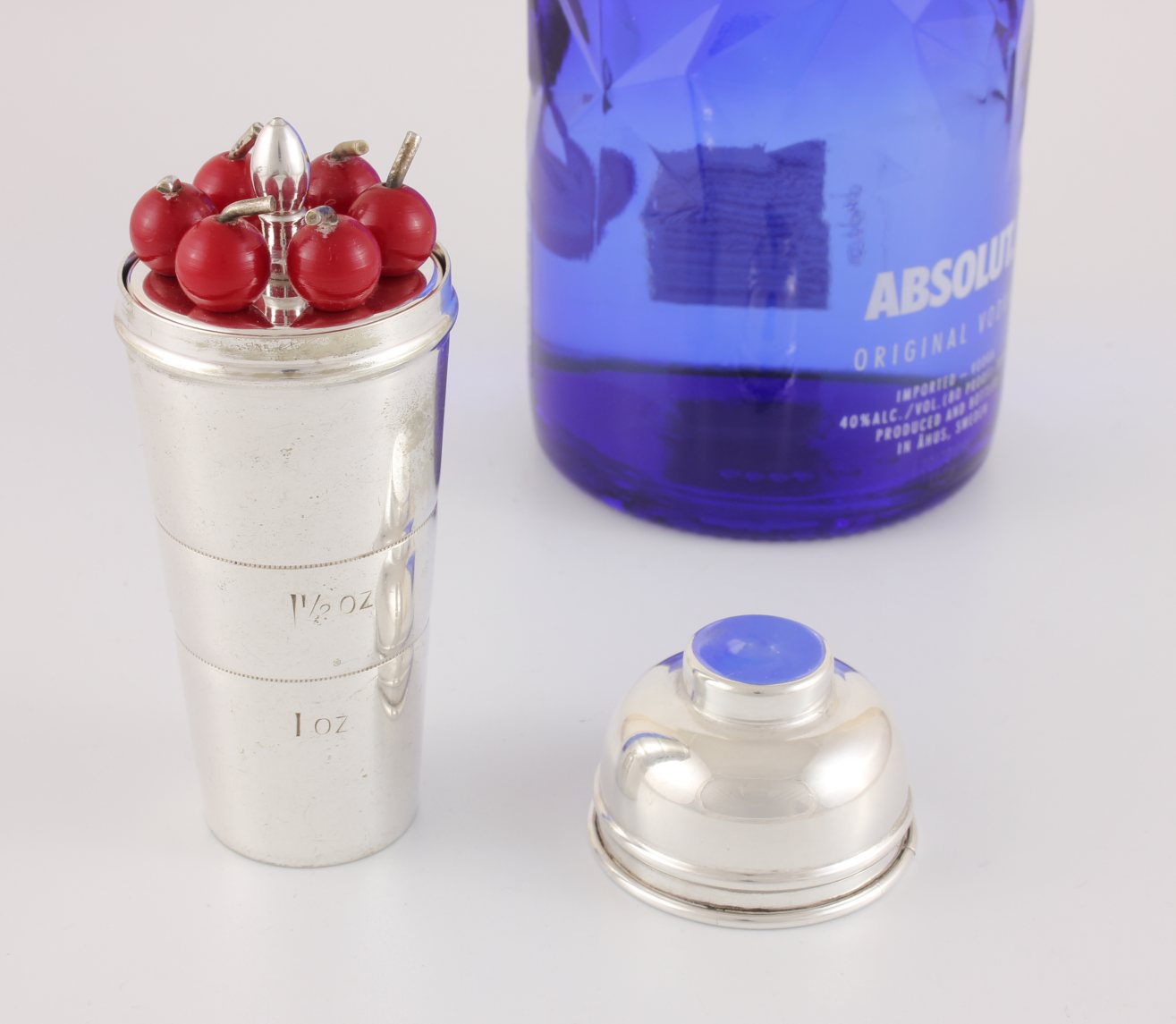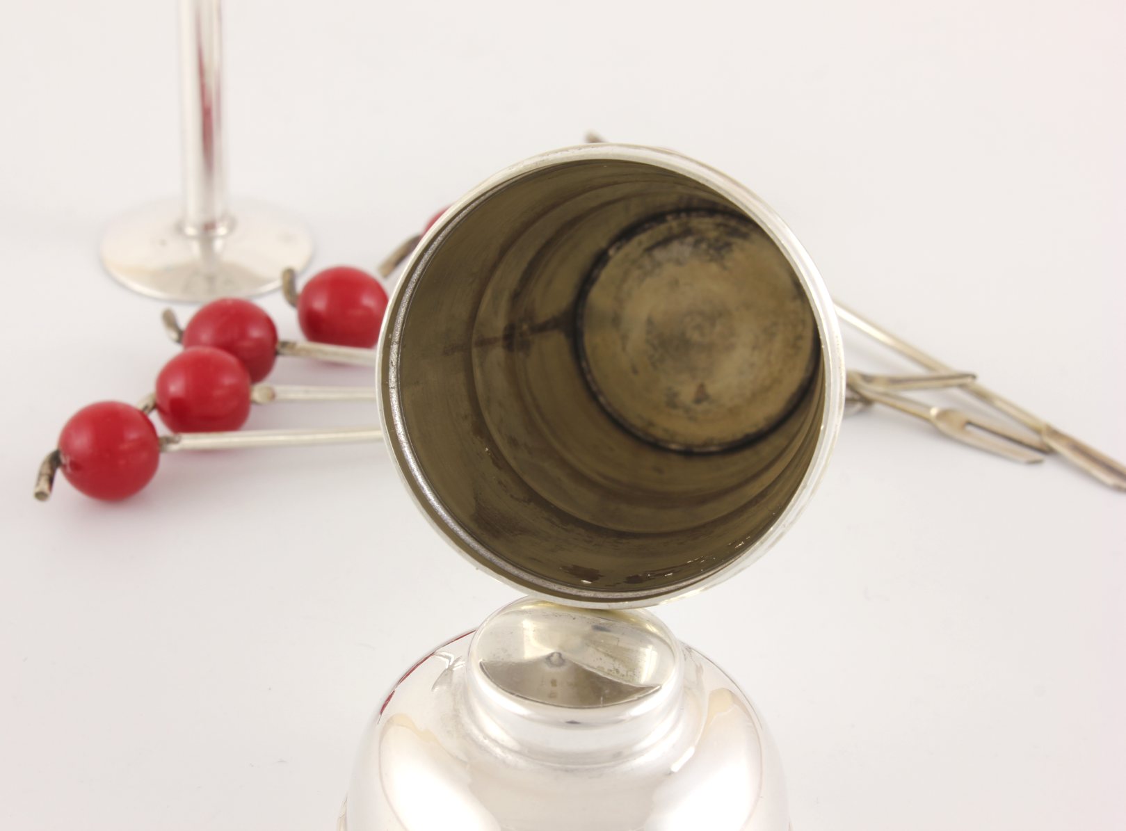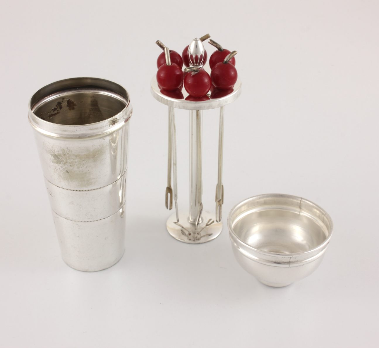 This fun vintage set of six cocktail sticks which feature red cherry tops come complete in their silver plated spirit measure which is in the form of a miniature art deco cocktail shaker with lid.
