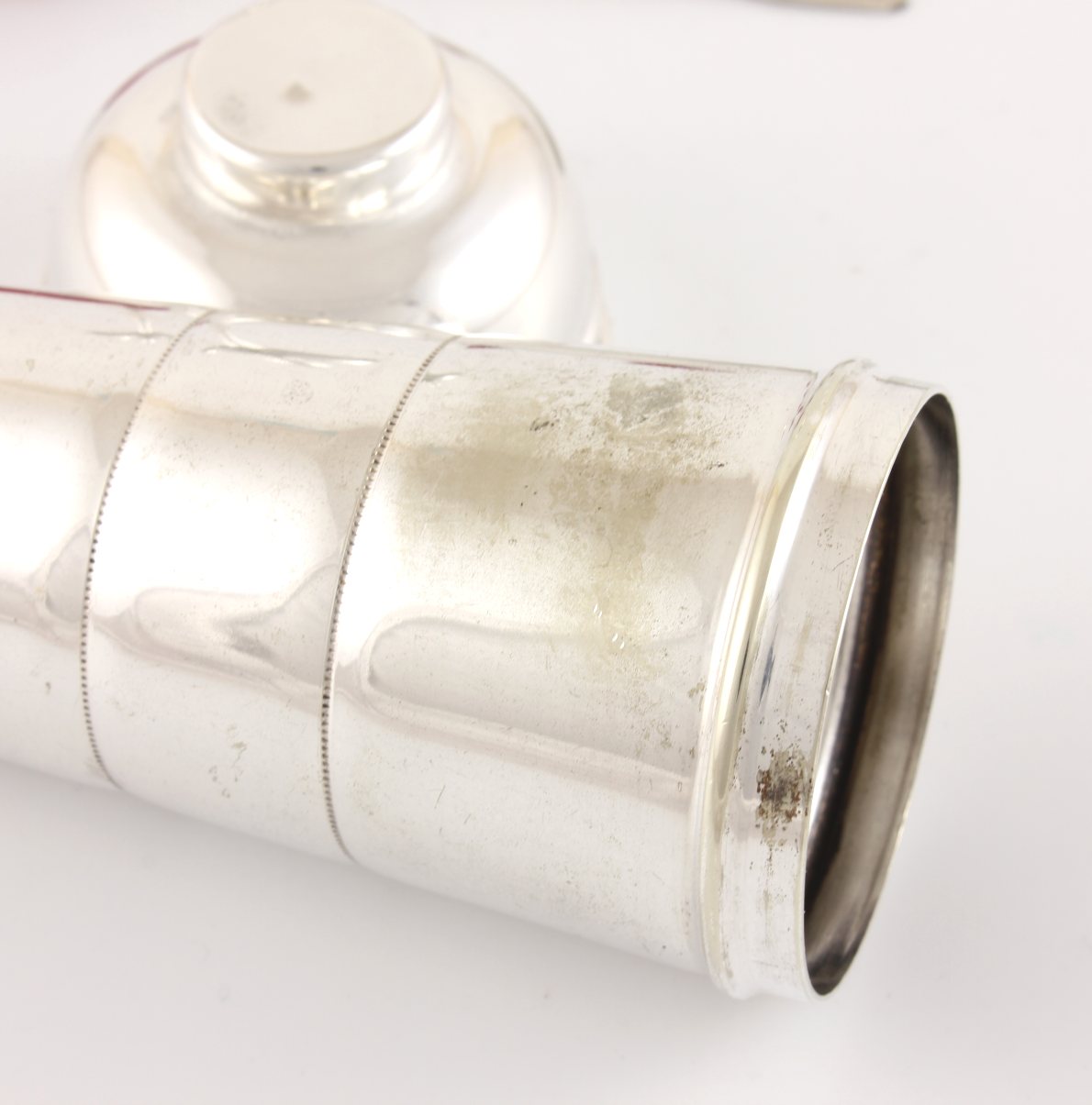 Condition: Nice original used vintage condition with some age related wear. A small amount of wear to the silver plate on the outer of measure and some staining to the inside. Some splits around the edge of top. Please see pictures.