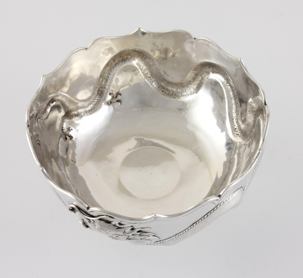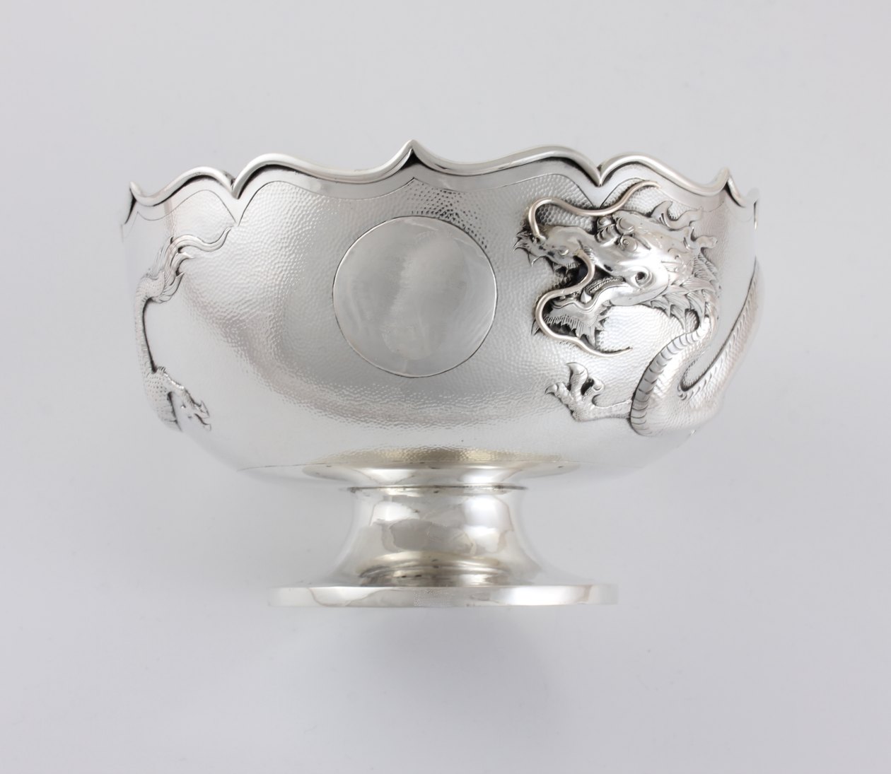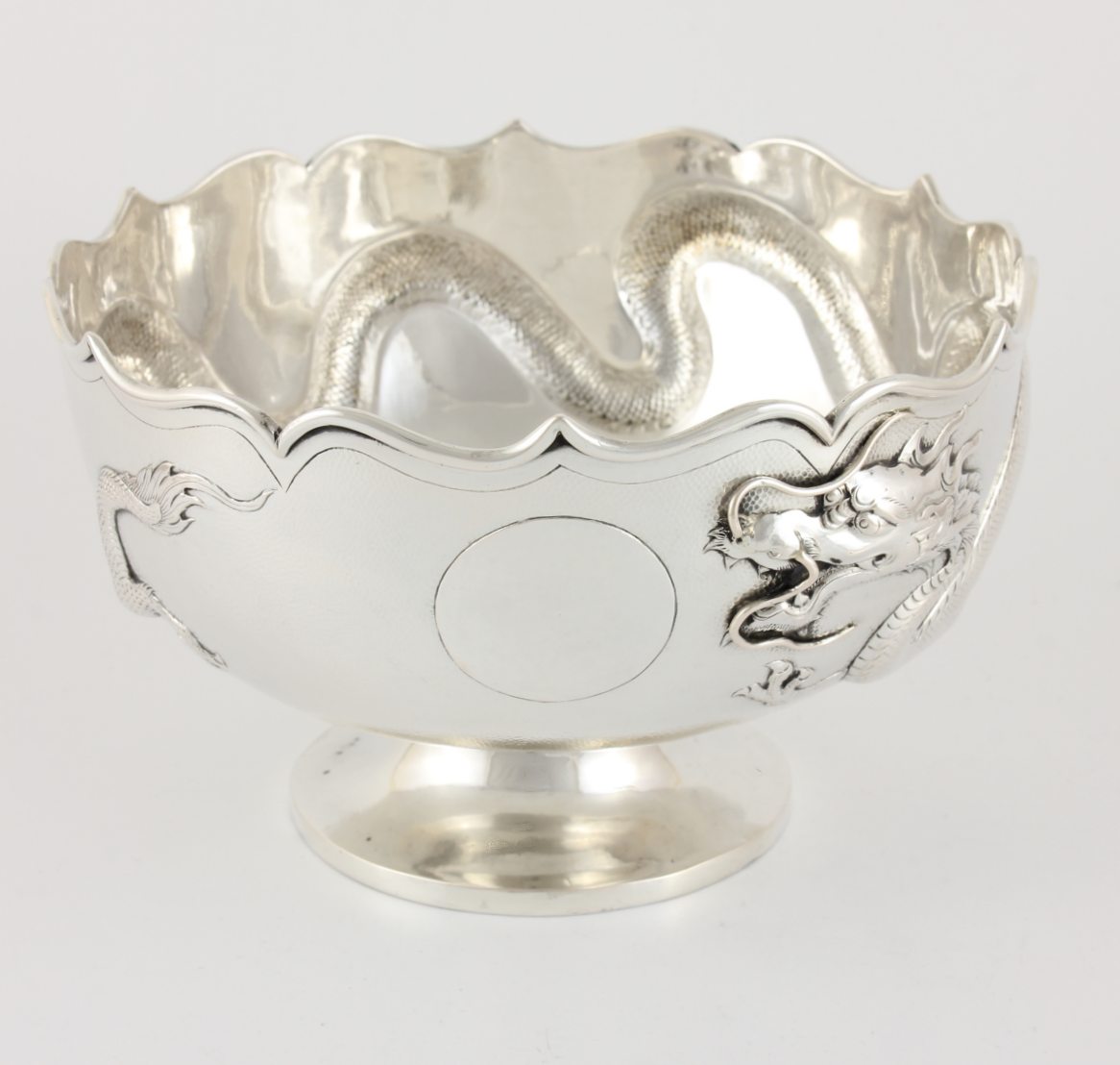 This fabulous antique Chinese silver bowl which dates from the 19th century, is in the style of a lotus flower and features a raised scrolling whiskered dragon that circles the outer of the bowl with a central blank cartouche.