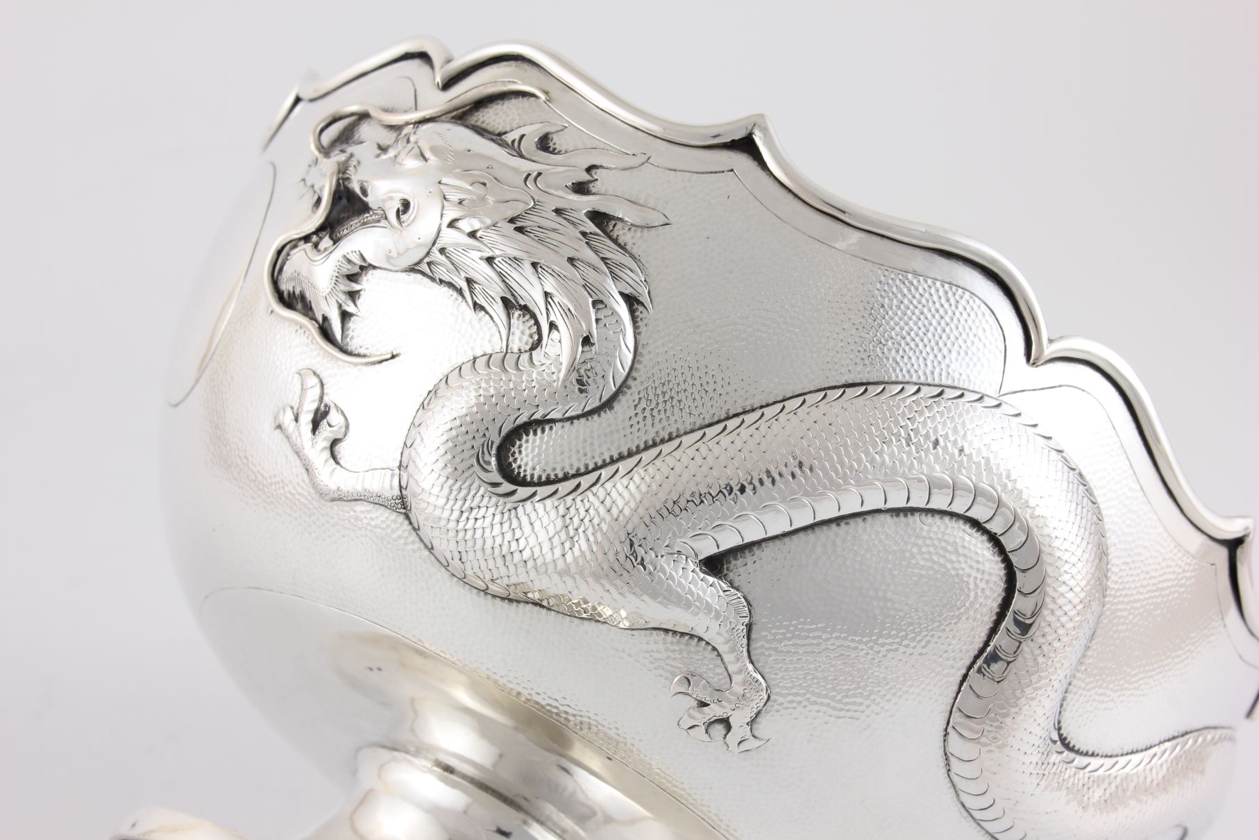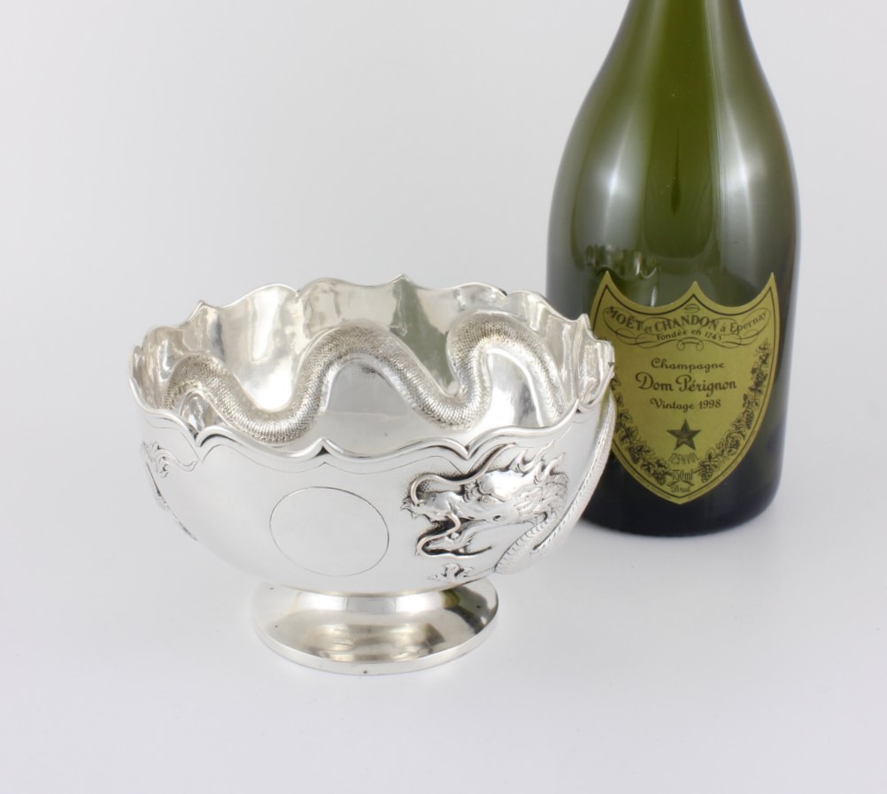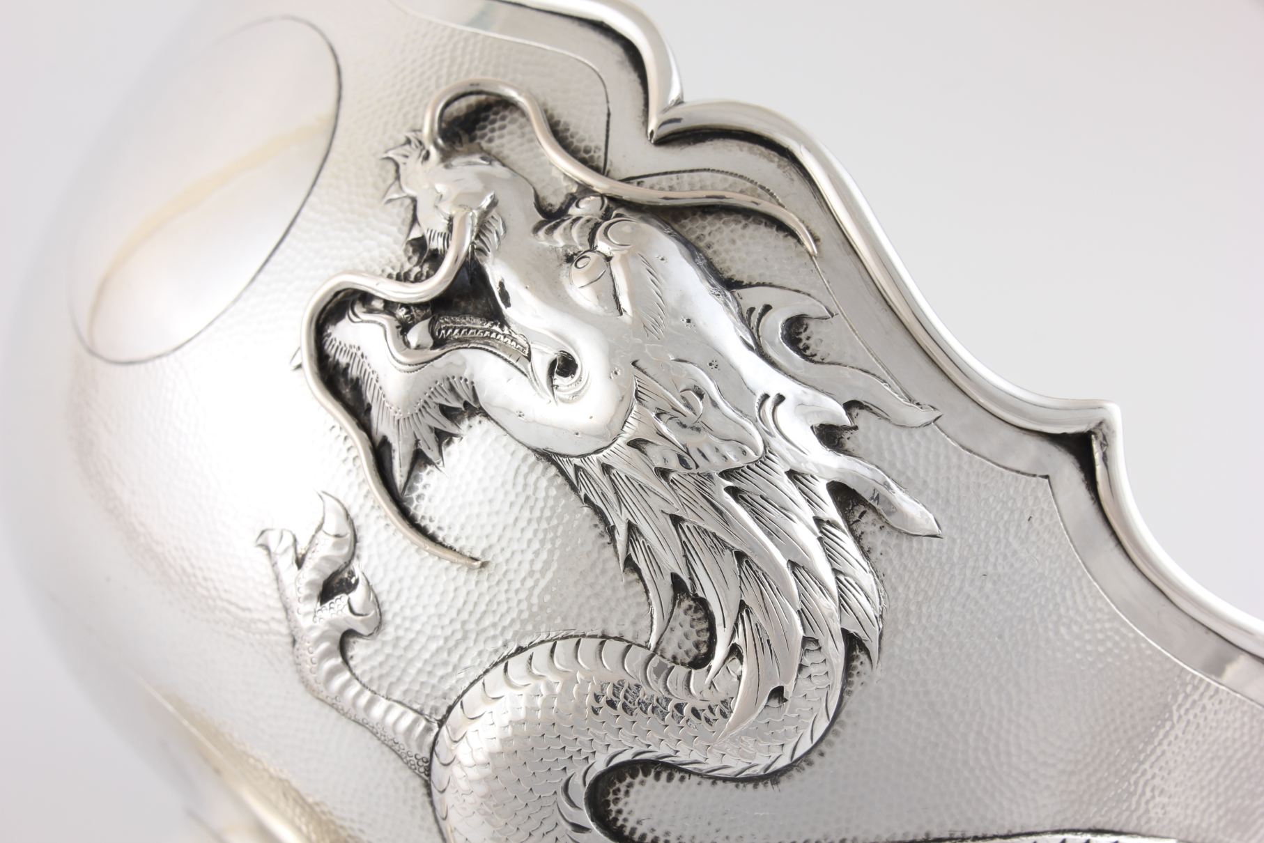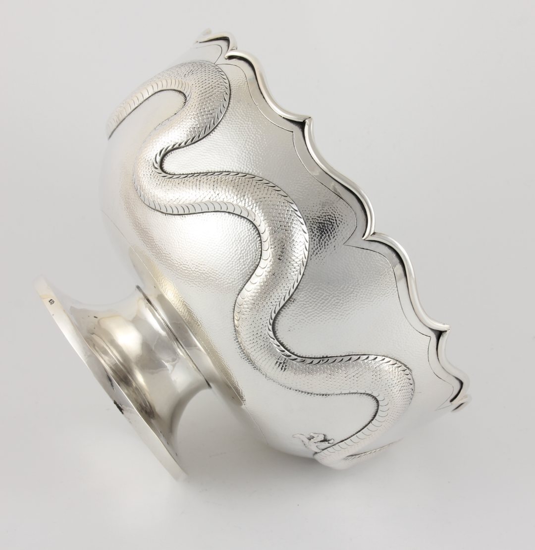 This fabulous antique Chinese silver bowl which dates from the 19th century, is in the style of a lotus flower and features a raised scrolling whiskered dragon that circles the outer of the bowl with a central blank cartouche.