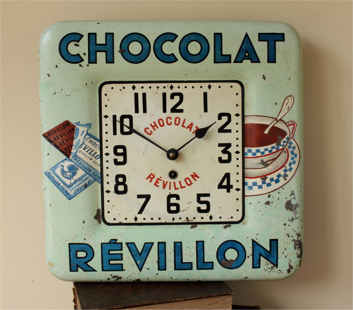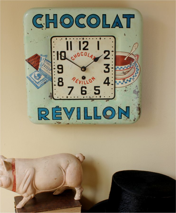 This stylish vintage / antique French chocolate advertising wall clock which dates from the second quarter of the 20th century is made of painted metal and would have originally been hung in a French Cafe to advertise Chocolat Revillon.
