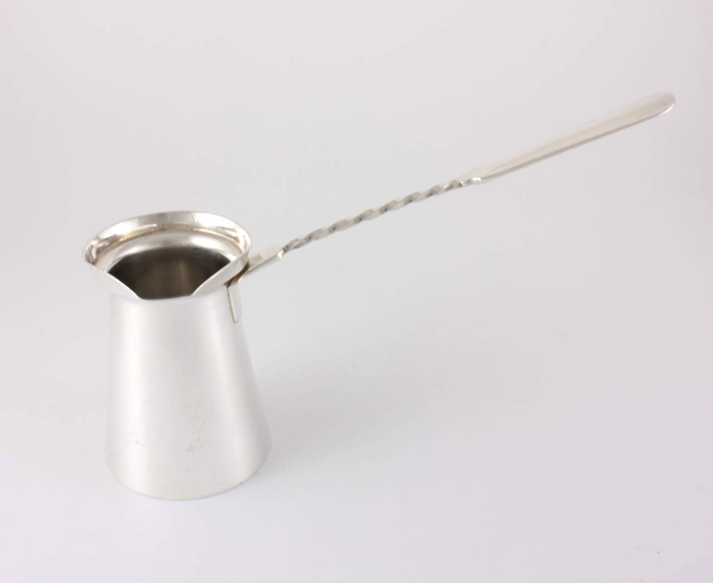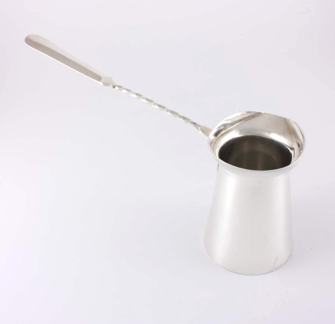 This unusual antique silver plate brandy warmer which dates from c1900 is by renowned French silversmith Christofle, has a long twisted design handle with a good size pan.