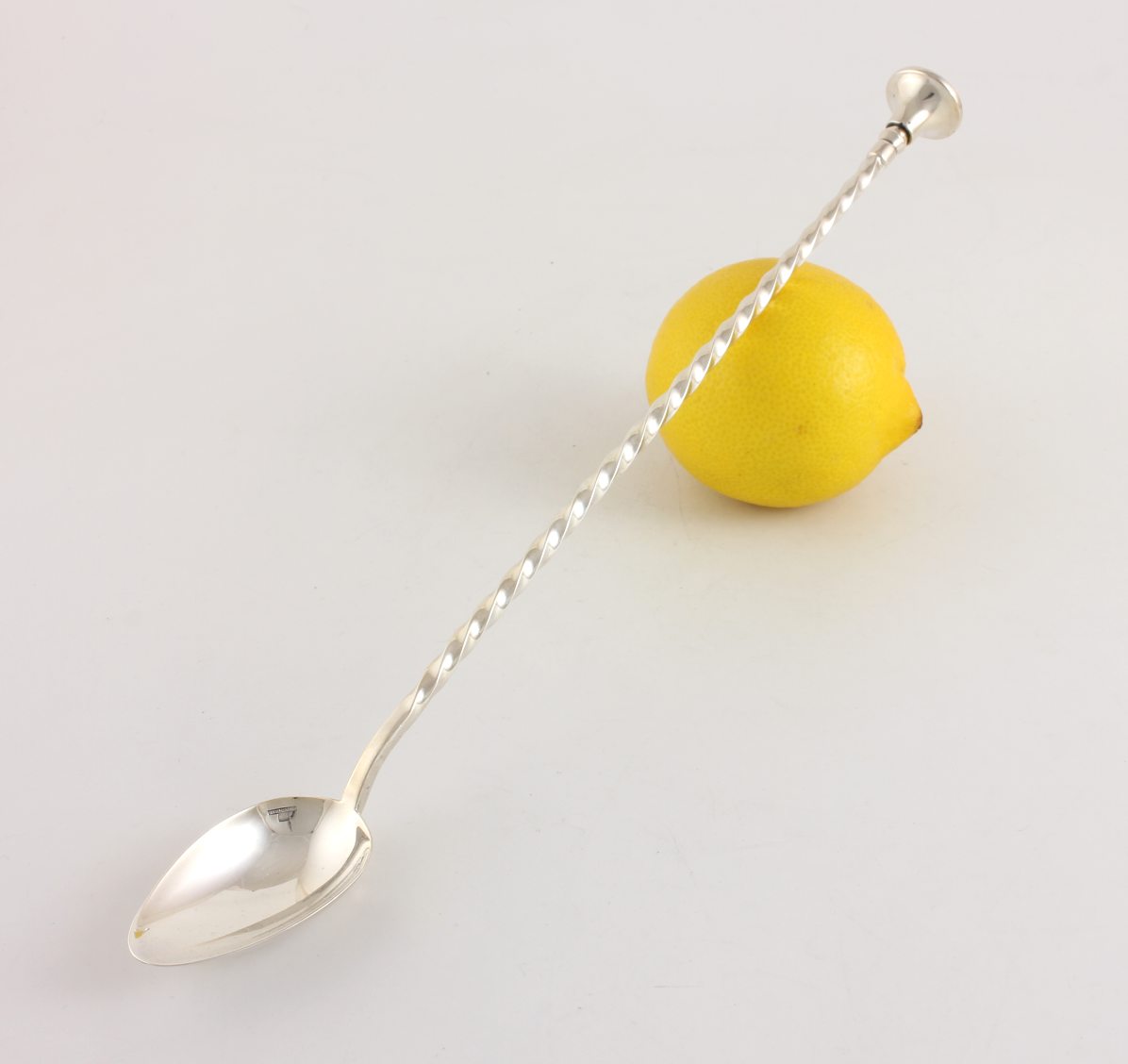This long stirrer has a twisted design with a large spoon to one end and a muddler with a circular pattern at the other end for crushing your fruits and other cocktail ingredients.