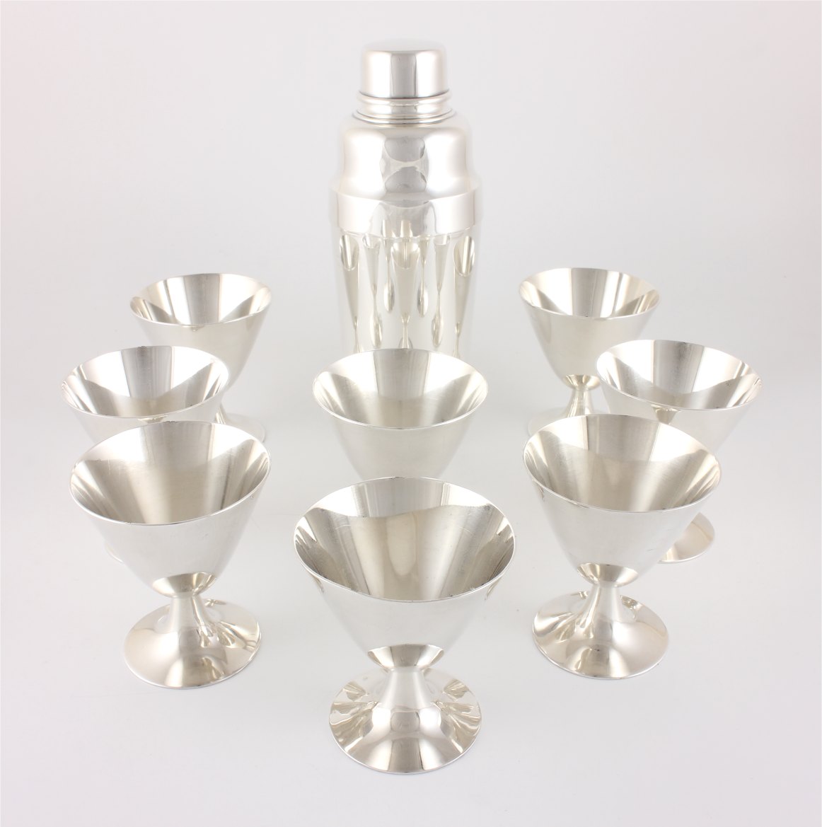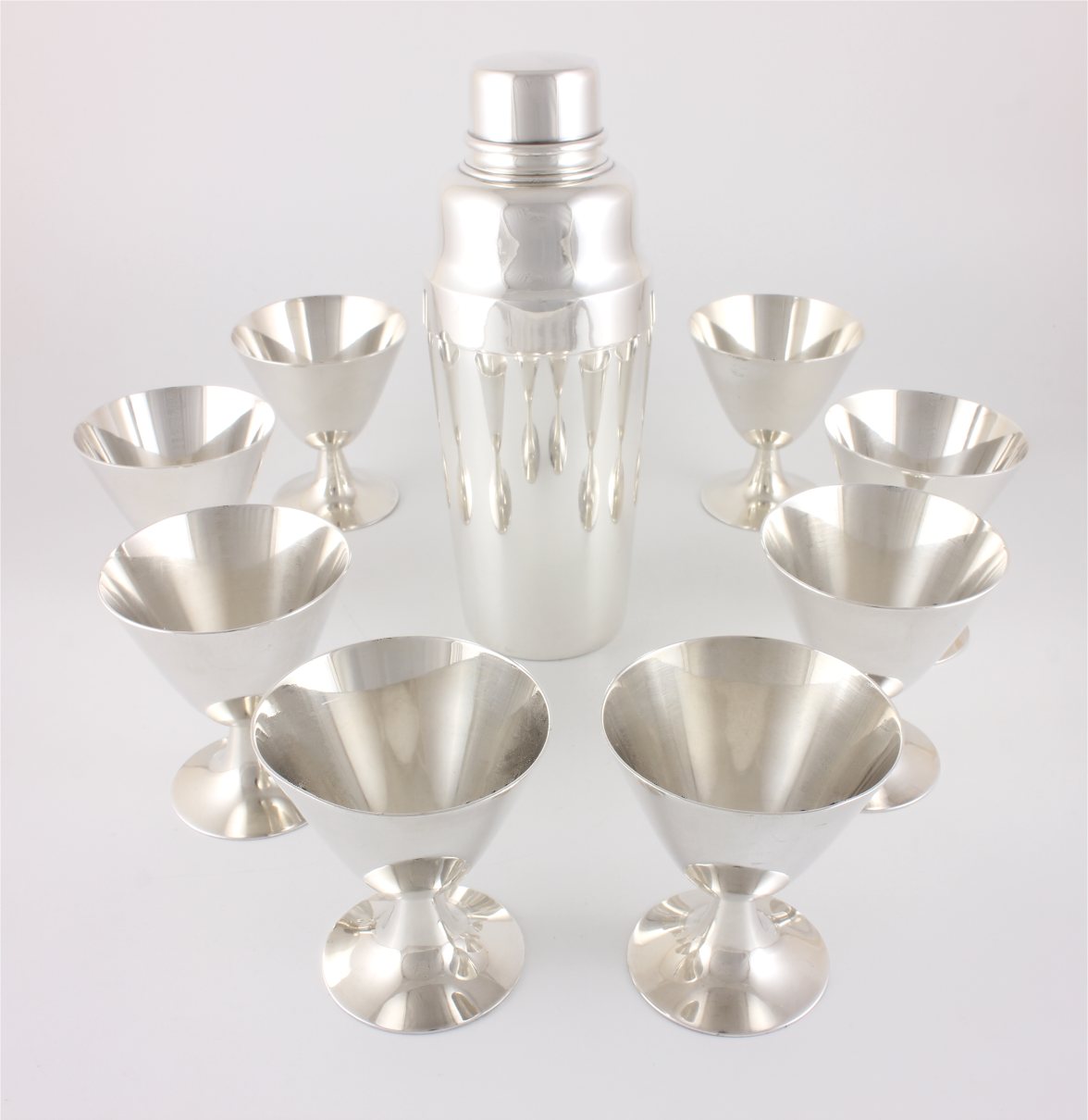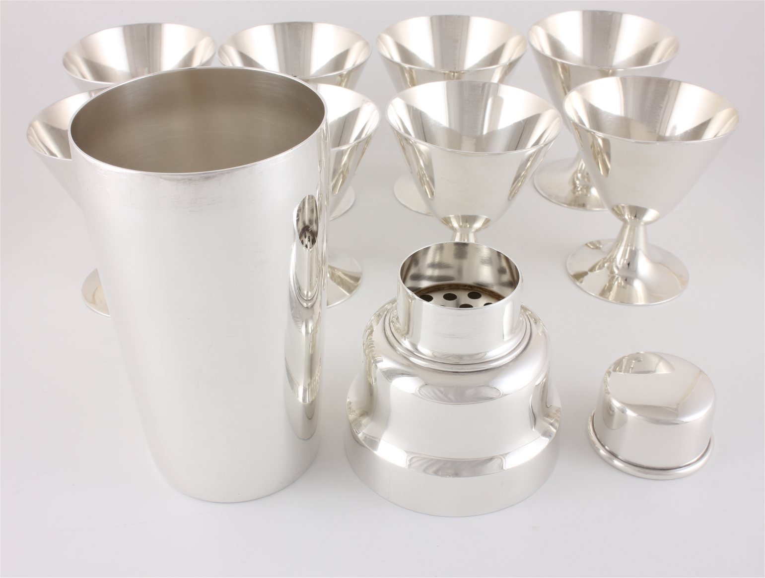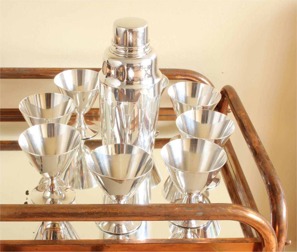This stylish French barware set which is made by top maker Christofle comprises of a silver plated 3 piece cocktail shaker, 8 silver plated stemmed goblets and dates from the mid 20th century.