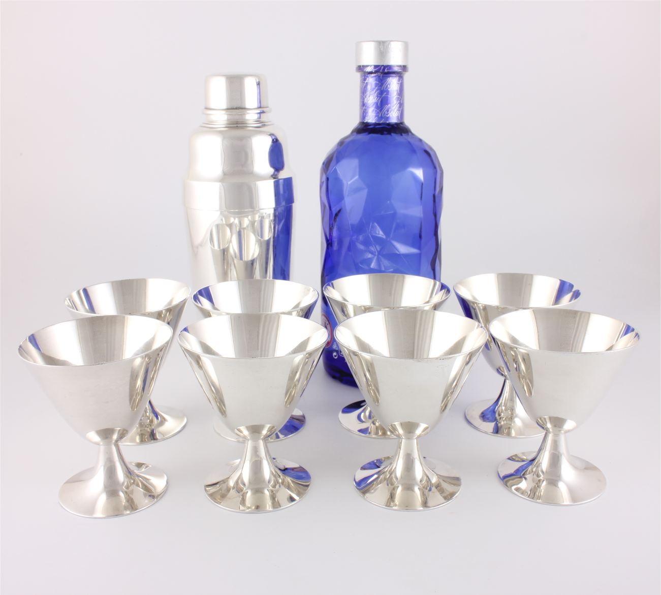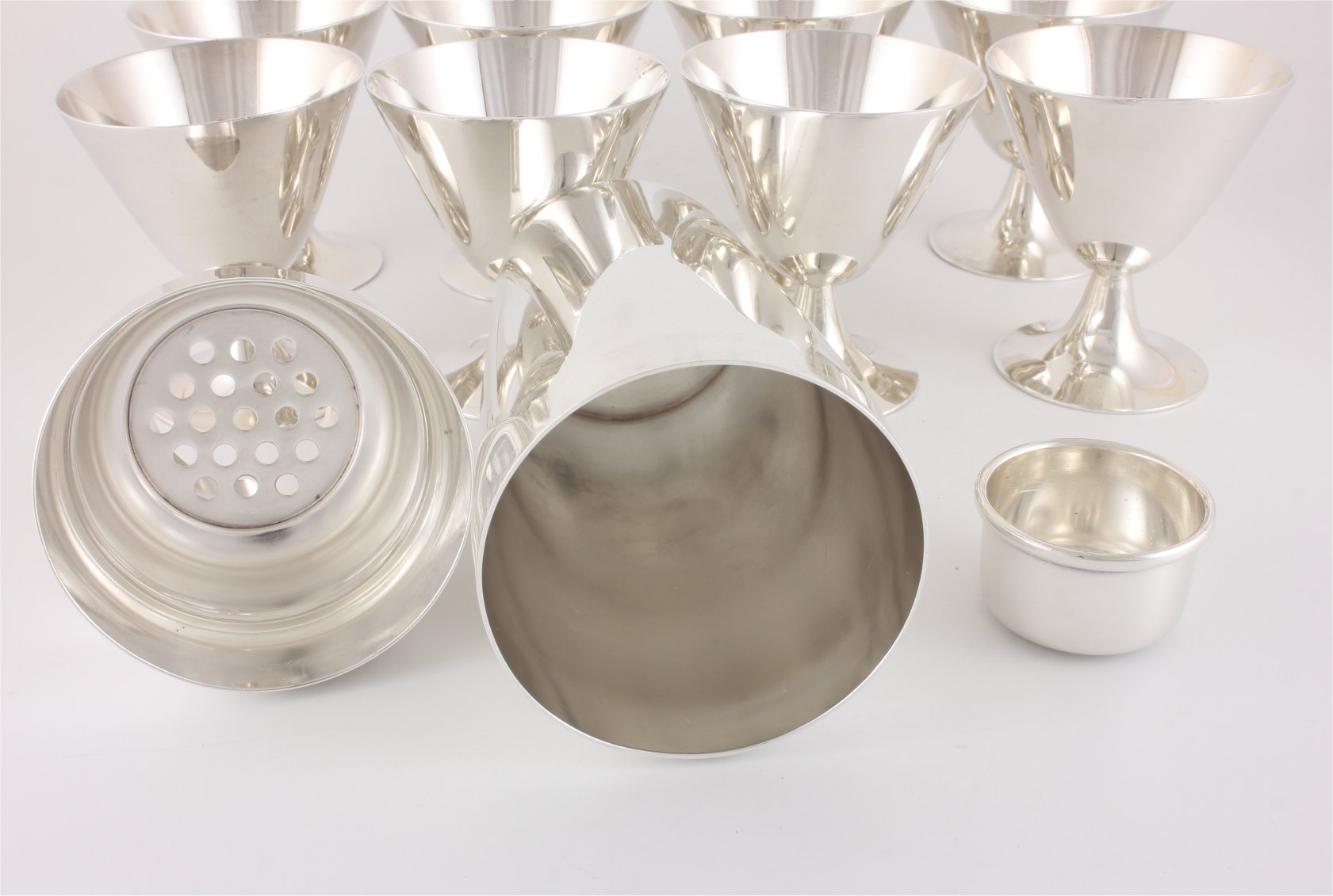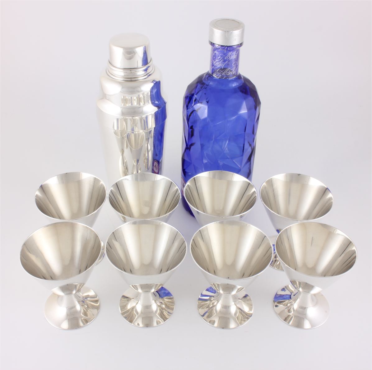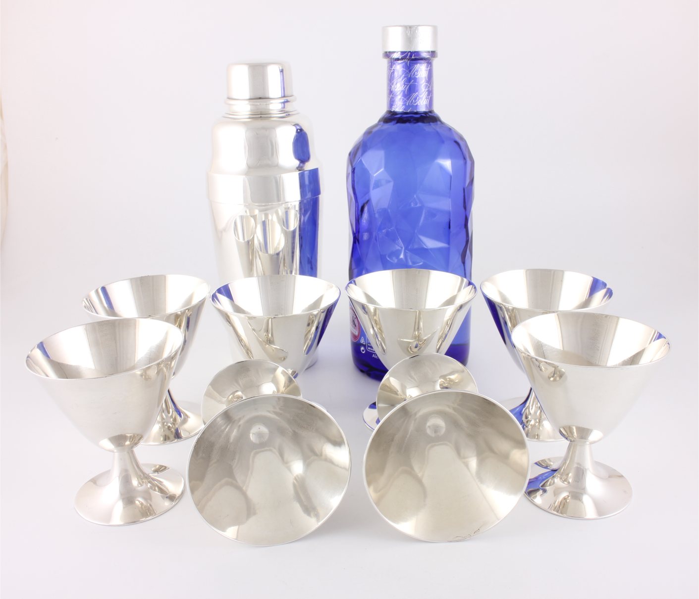 This stylish French barware set which is made by top maker Christofle comprises of a silver plated 3 piece cocktail shaker, 8 silver plated stemmed goblets and dates from the mid 20th century.