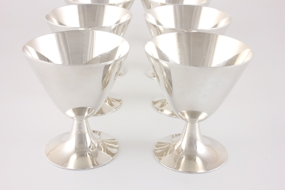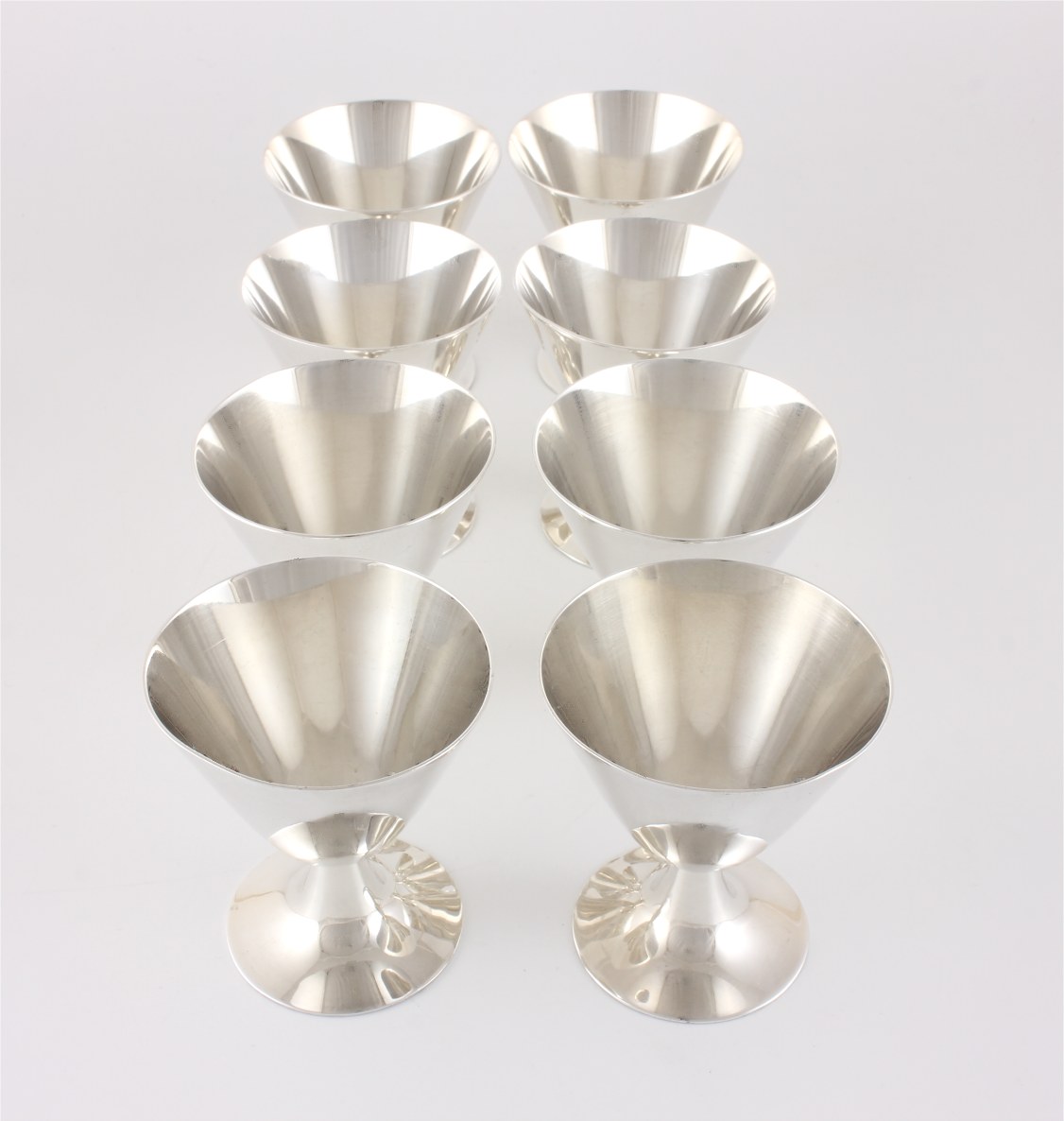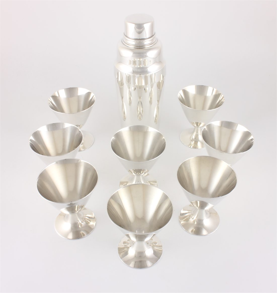 The cocktail shaker has a wonderful Art Deco design and is in excellent clean condition. The set of 8 matching goblets have a conical shape with a sloped foot, feel nice and heavy in the hand and are also in nice clean condition.