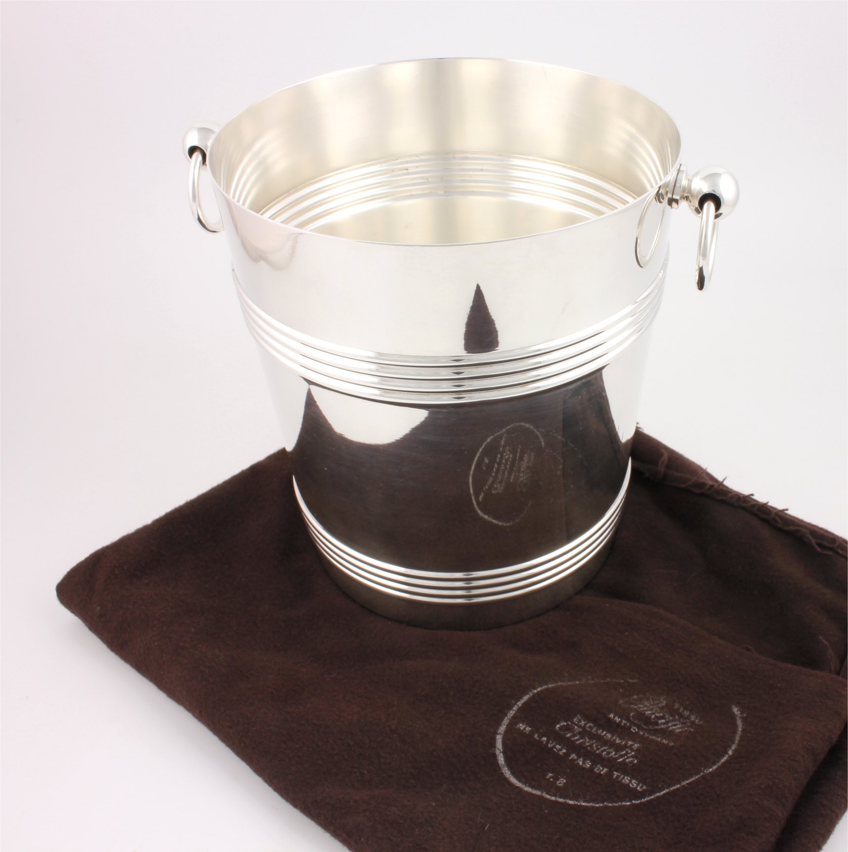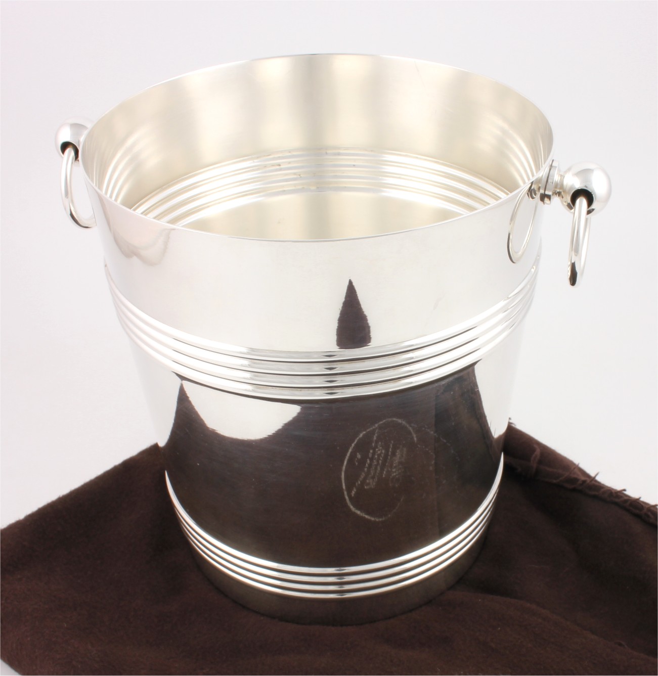 This vintage wine bucket has a stylish Art Deco design with ring decoration to the body, has stylish ring handles and is a good heavy weight. This Champagne cooler is signed to the underside with it's maker's marks and comes in a Christofle anti tarnish cloth storage bag.