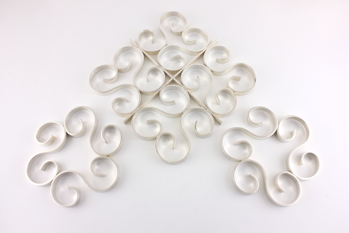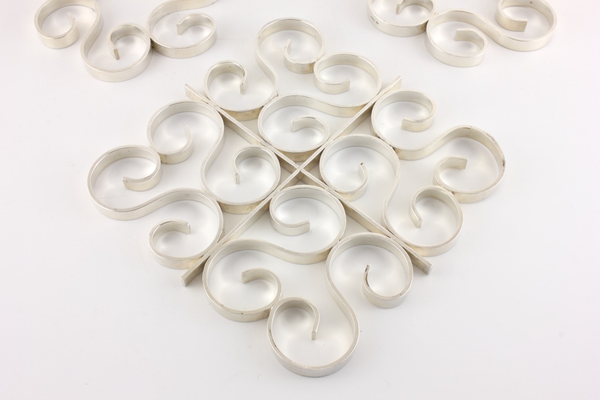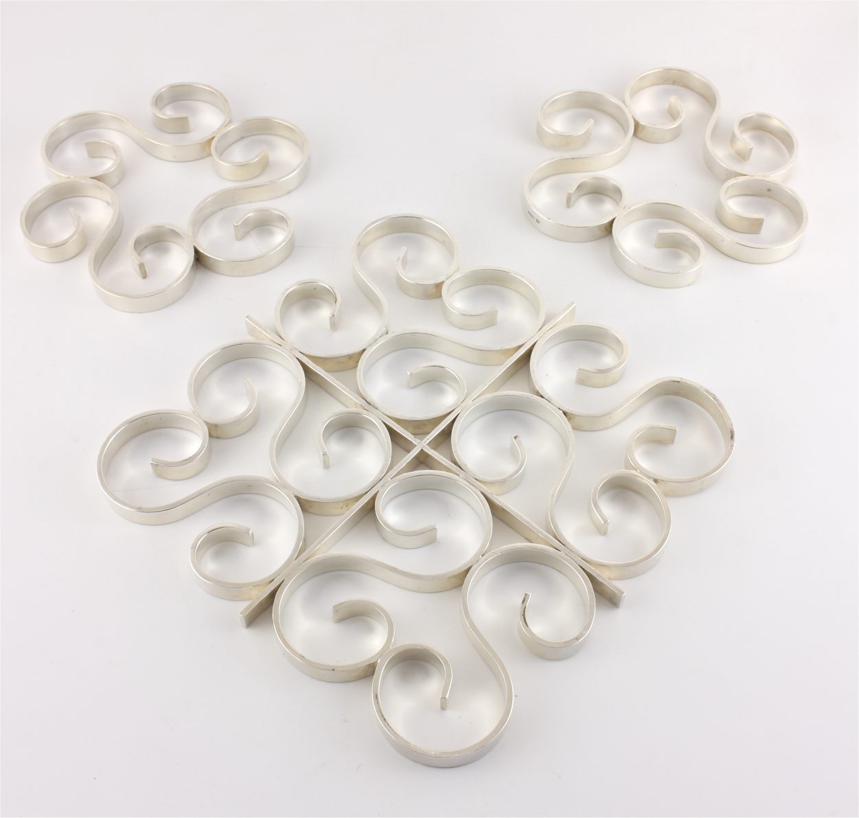 Two coasters are the same size and these come with one larger trivet. All have a wonderful scrolled design, are a nice heavy weight, look wonderful on display and being made by Christofle are nice quality.