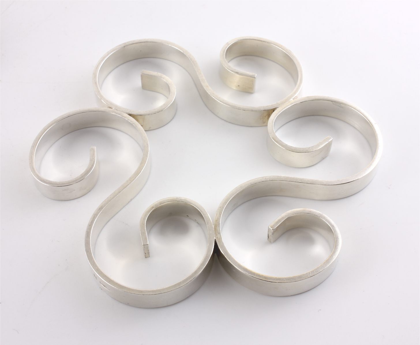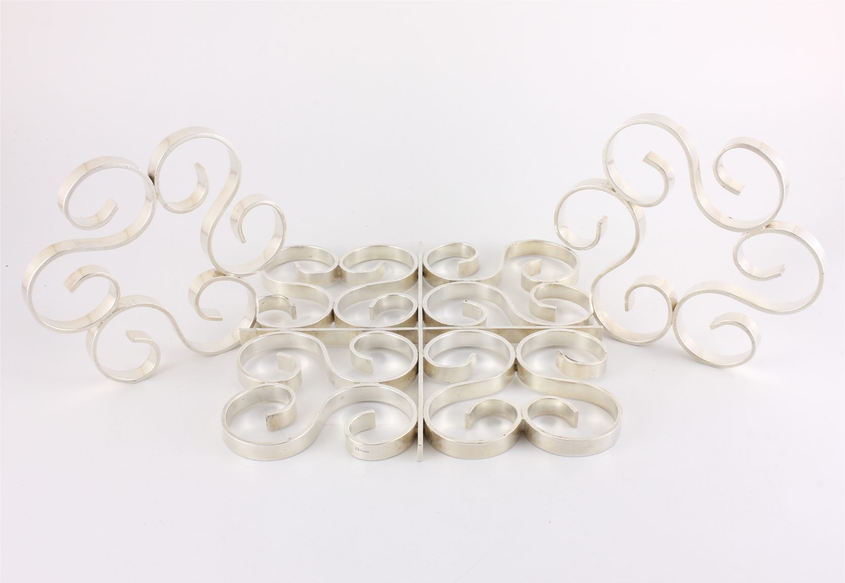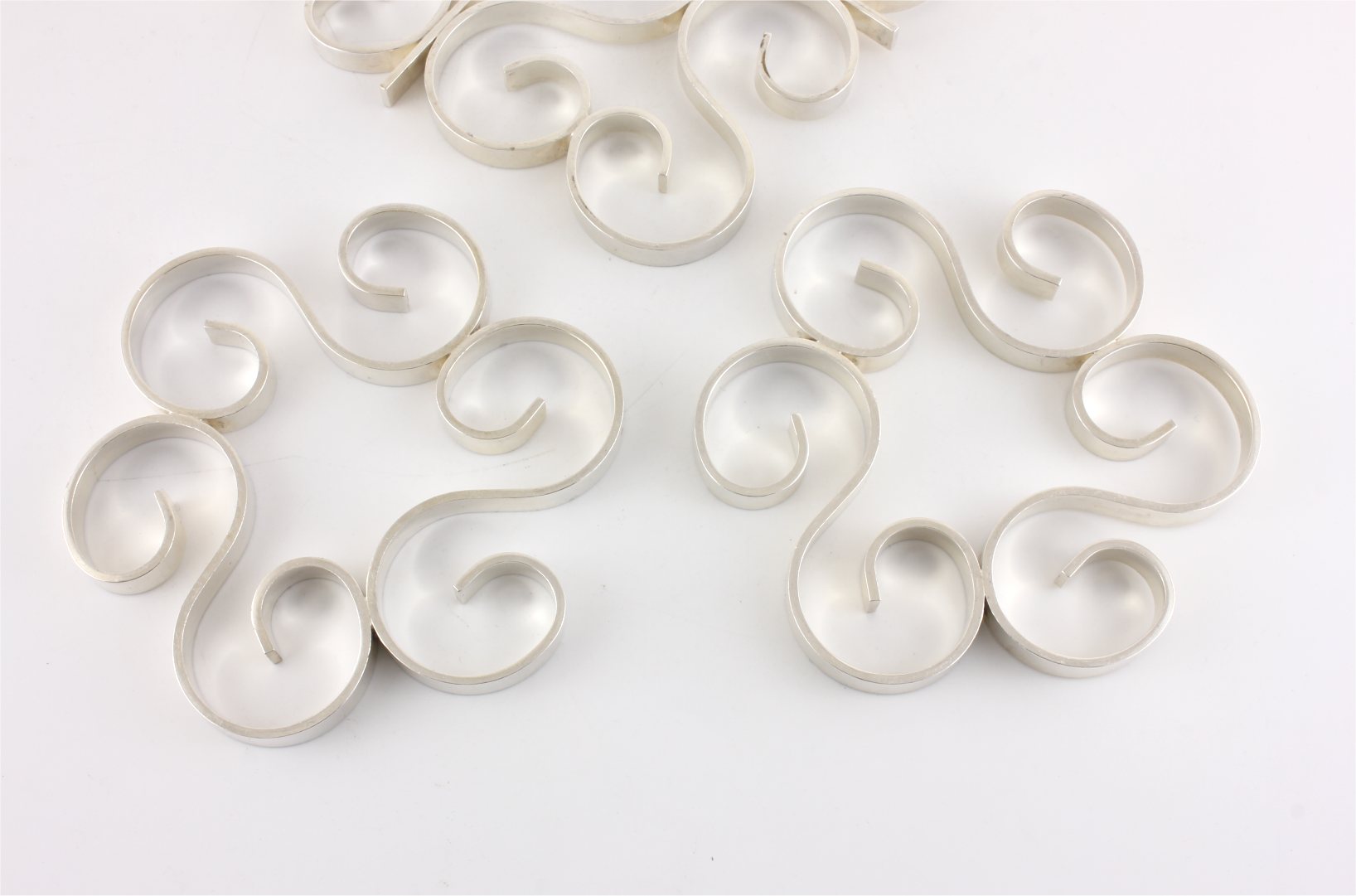 Two coasters are the same size and these come with one larger trivet. All have a wonderful scrolled design, are a nice heavy weight, look wonderful on display and being made by Christofle are nice quality.