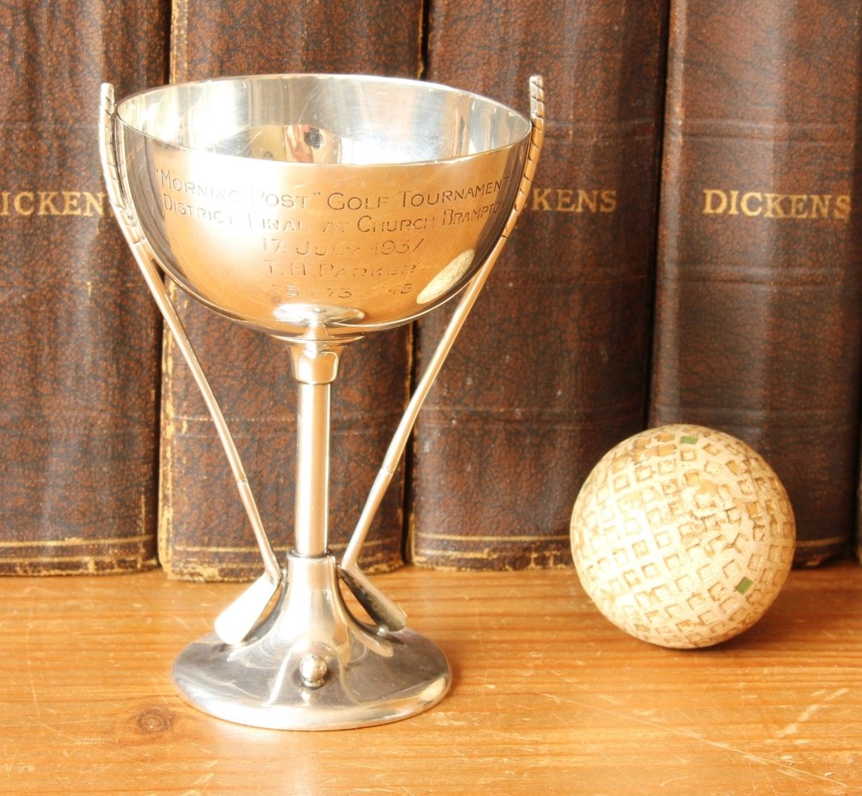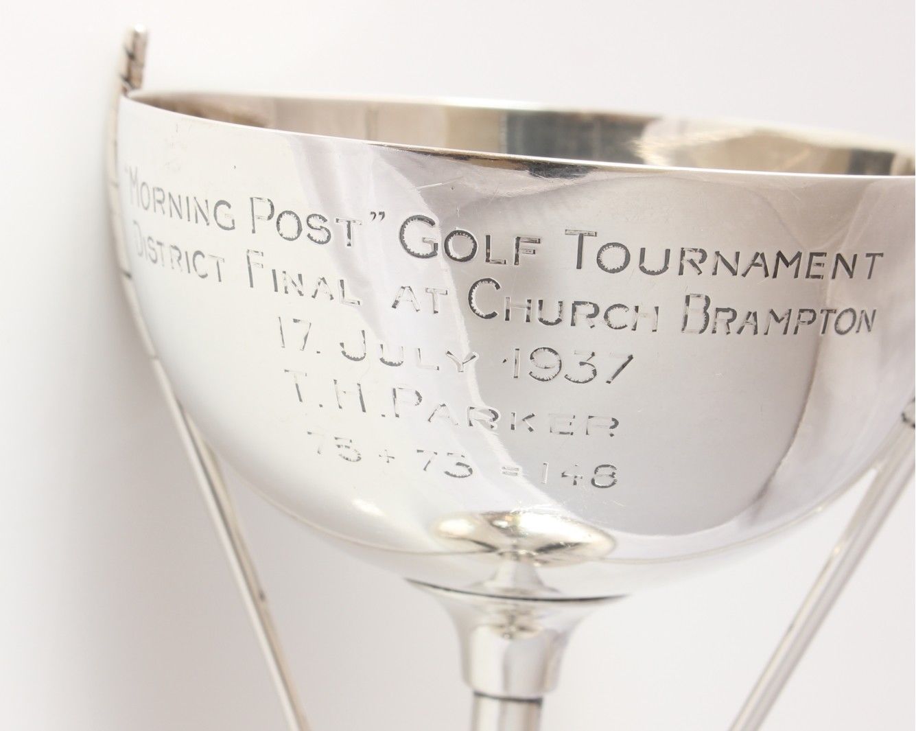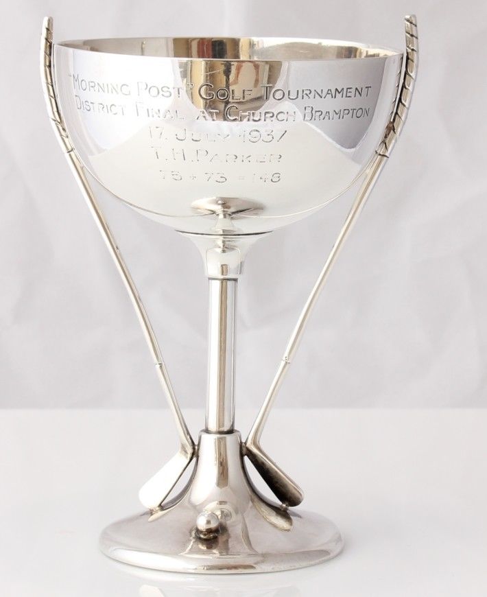 The silver cup which is designed as a bowl with two golf clubs and balls has an interesting inscription that reads Morning Post Golf Tournament. District Final at Church Brampton. 17 July 1937. TH Parker. 75+73 = 148.