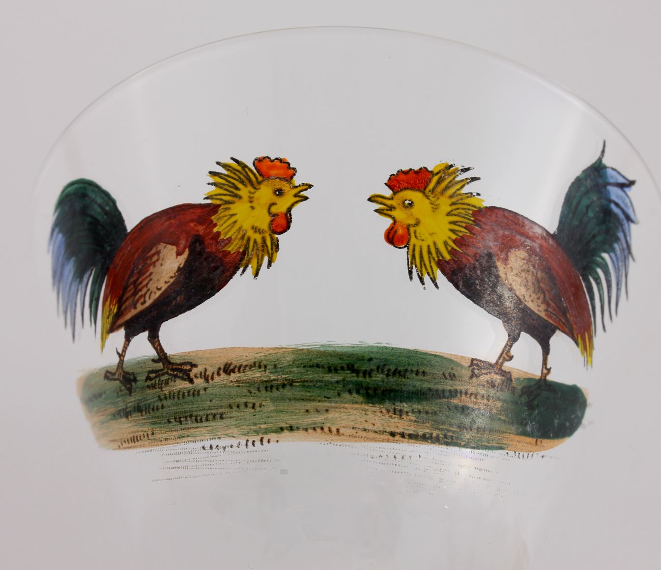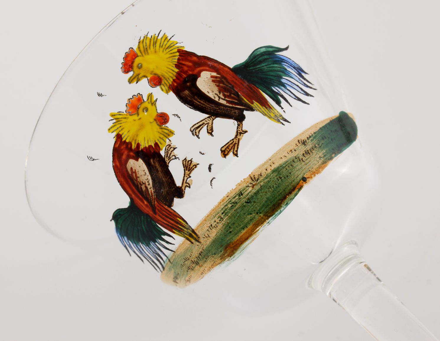 This stylish set of 6 vintage cockerel stemmed cocktail glasses which date from around the middle of the 20th century have two colourful cockerels on each glass.