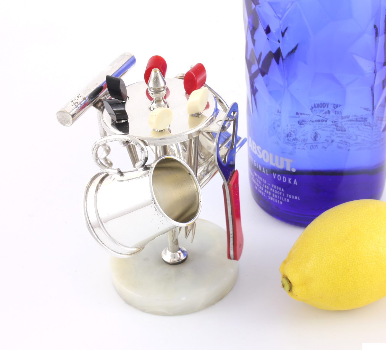 This useful piece of barware which dates from c1940 comes with large and small silver plated spirit measures which are in the form of miniature tankards, a bottle opener which also is finished in red and a corkscrew all of which display nicely on the rotating stand which has a heavy marble base.