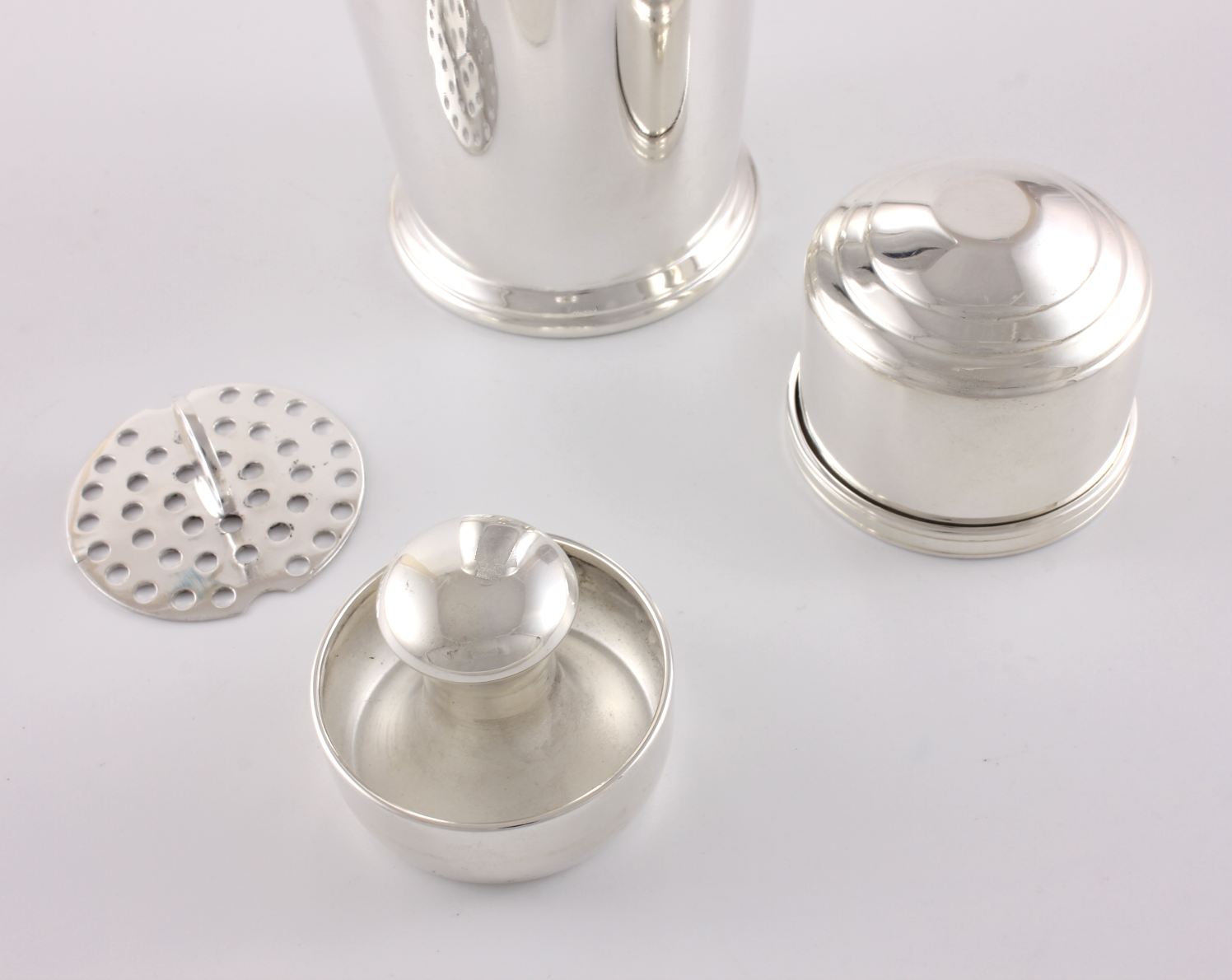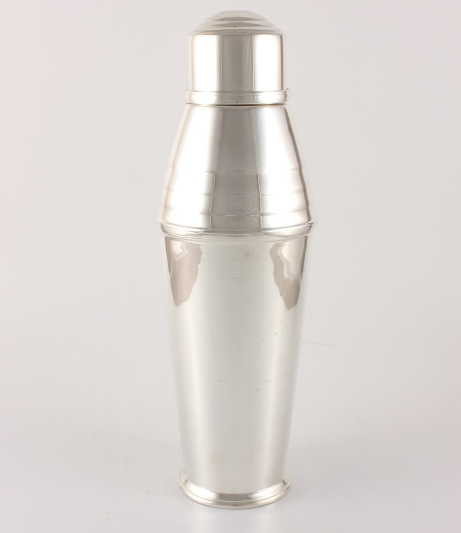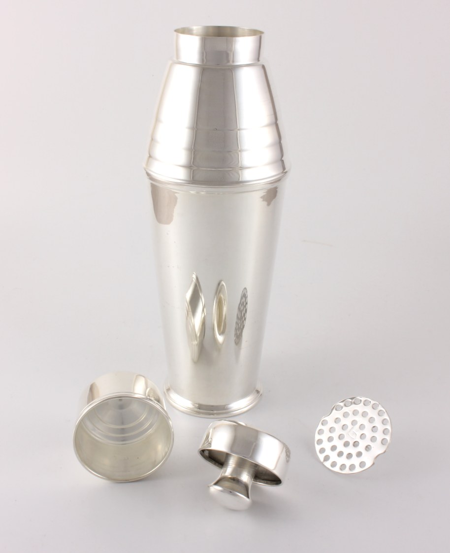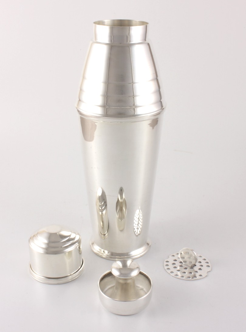 This stylish tall cocktail shaker which dates from c1930 has a wonderful Art Deco design and comes in 4 parts which include the main body with stepped detail, removable lemon squeezer / juicer, strainer and a stepped design lid.