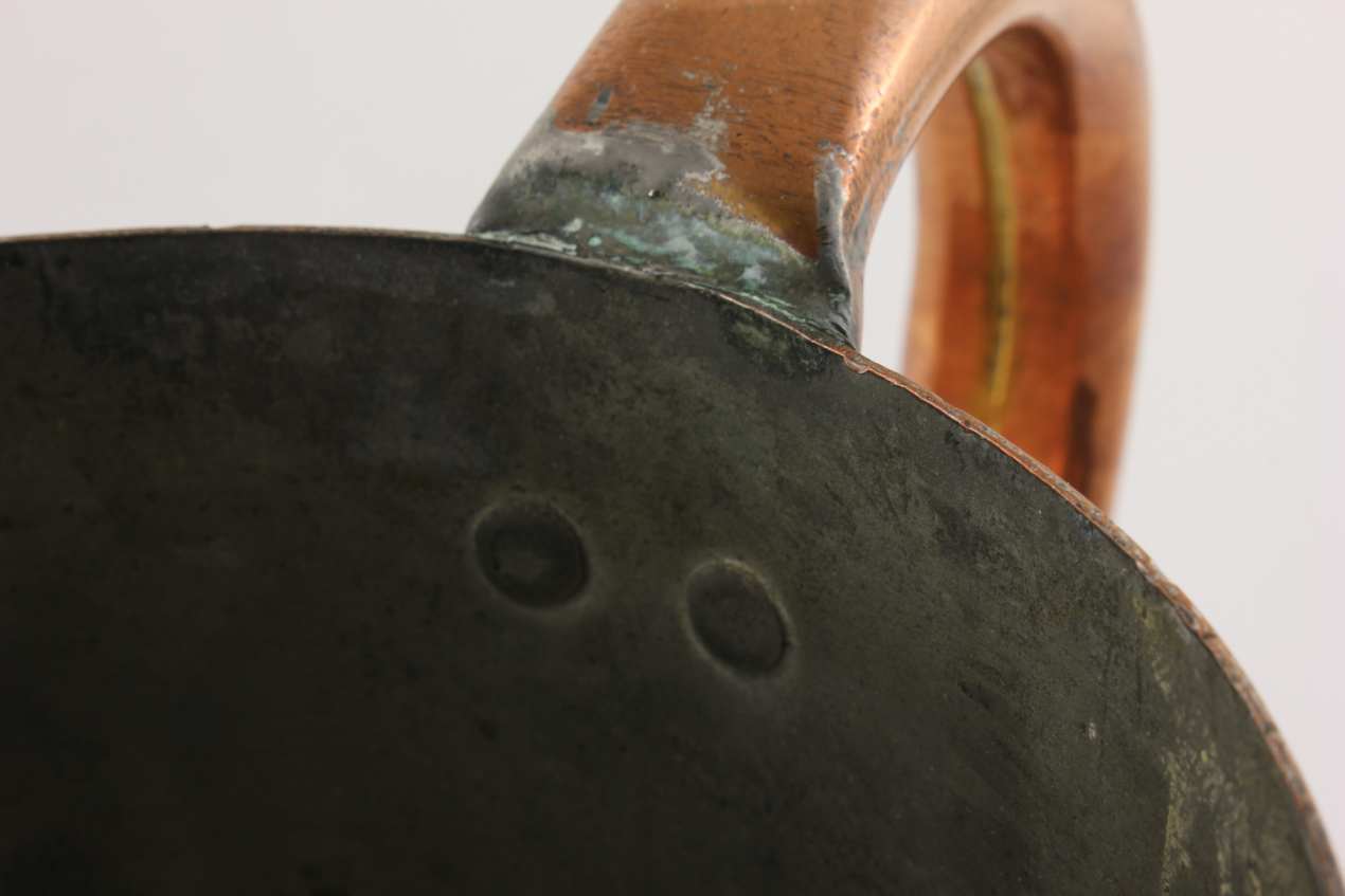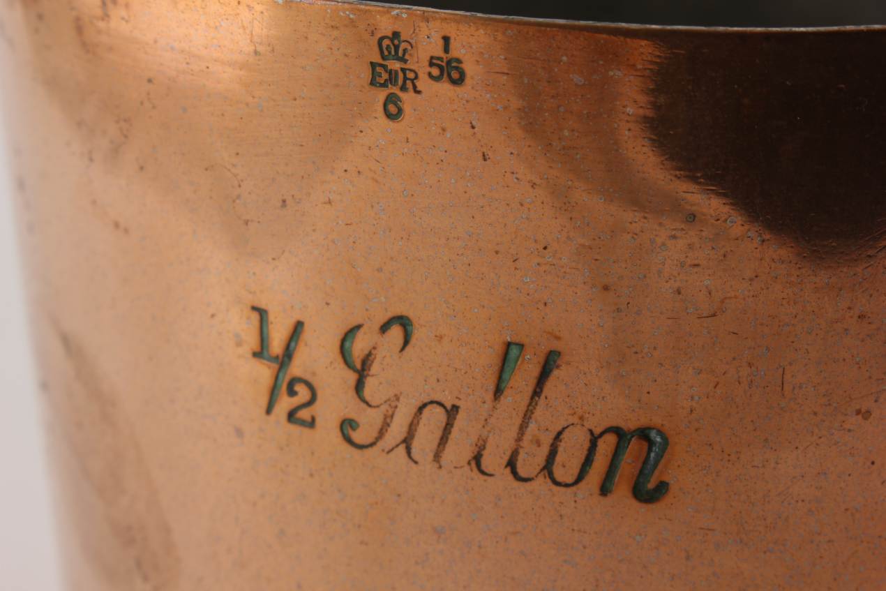 This large half gallon copper rum measure has a wonderful mug shape with a large side handle that is attached to the body with rivets and has a tinned interior.