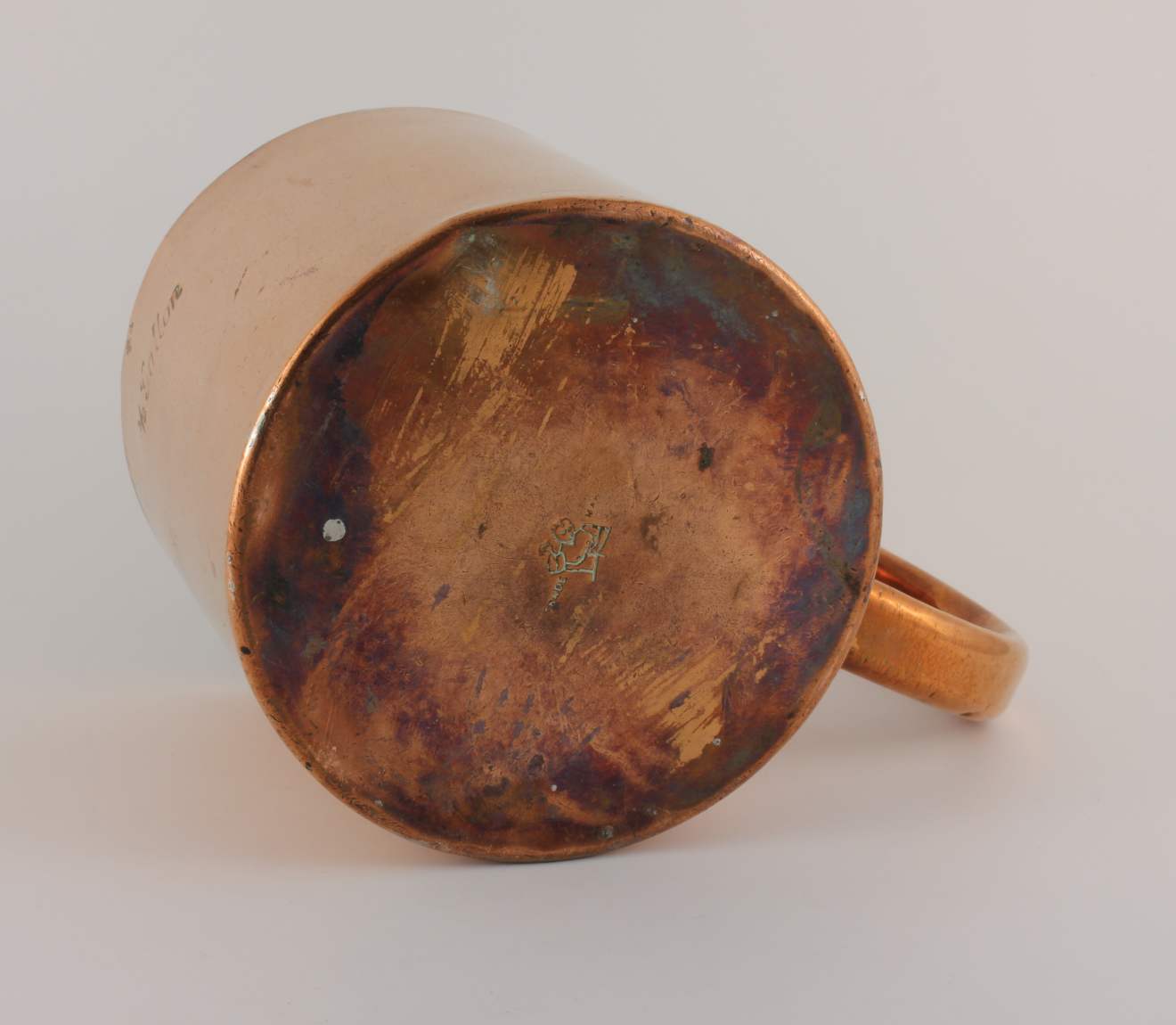 This copper mug is marked to the outer with the Queen Elizabeth II Cipher and 56 to show that this was used as a Royal Naval rum cup in 1956.